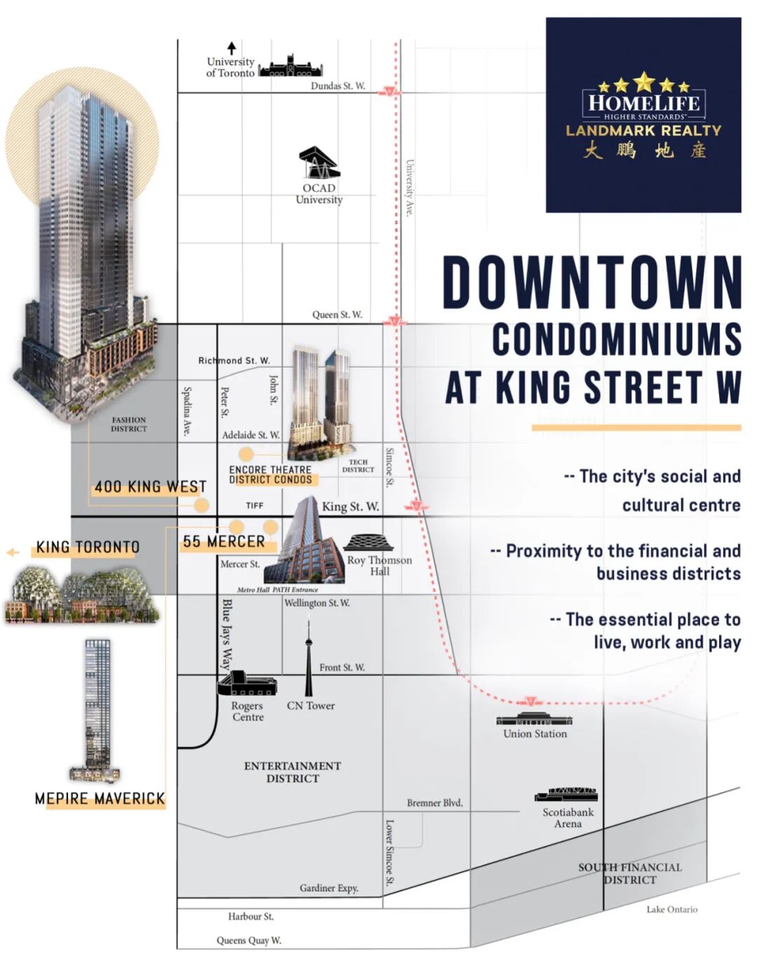位于多伦多市中心的King Street West和Charlotte St的交界处,紧邻多伦多的科技区,娱乐区,金融区等五大区。距离全球