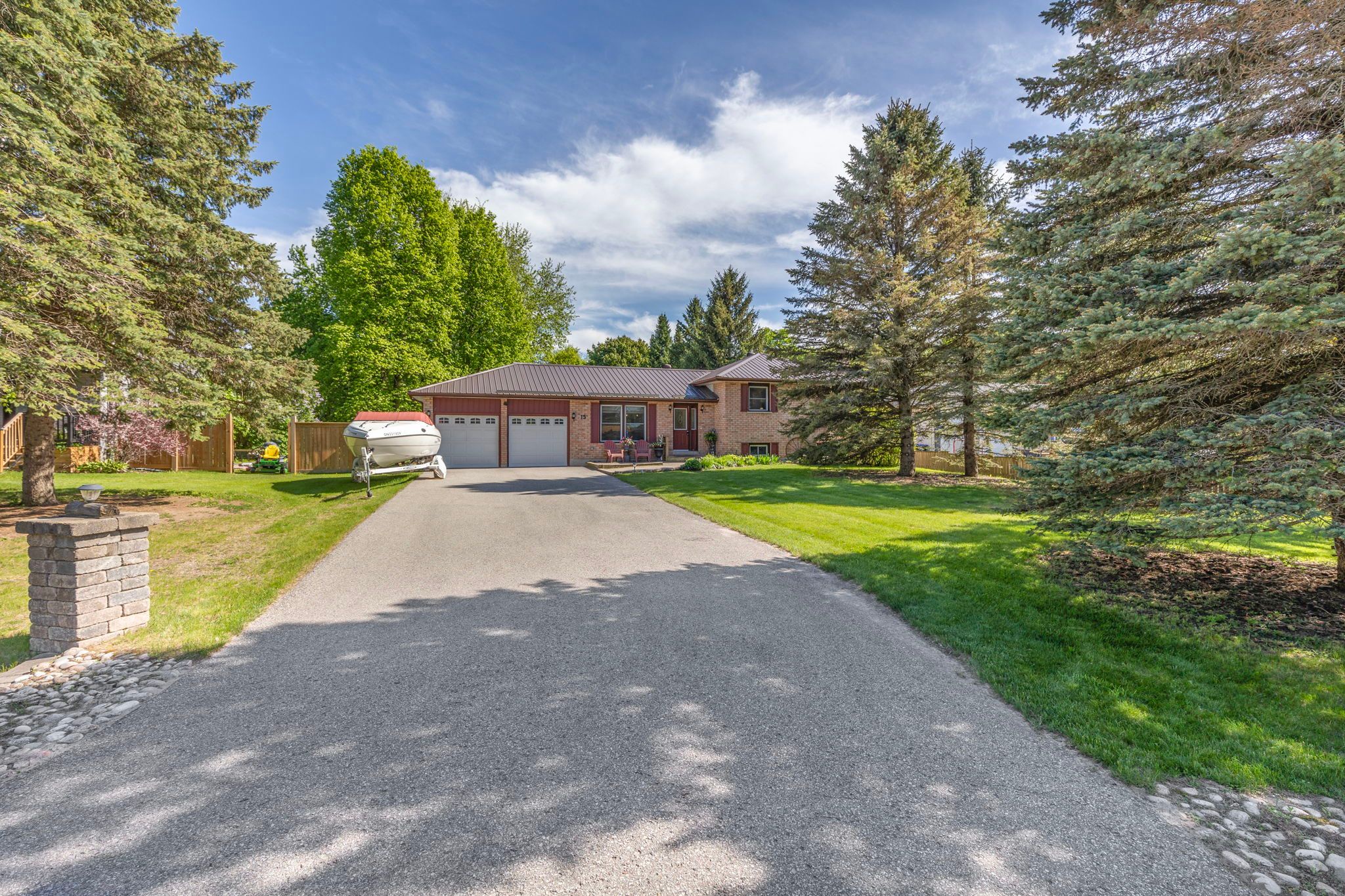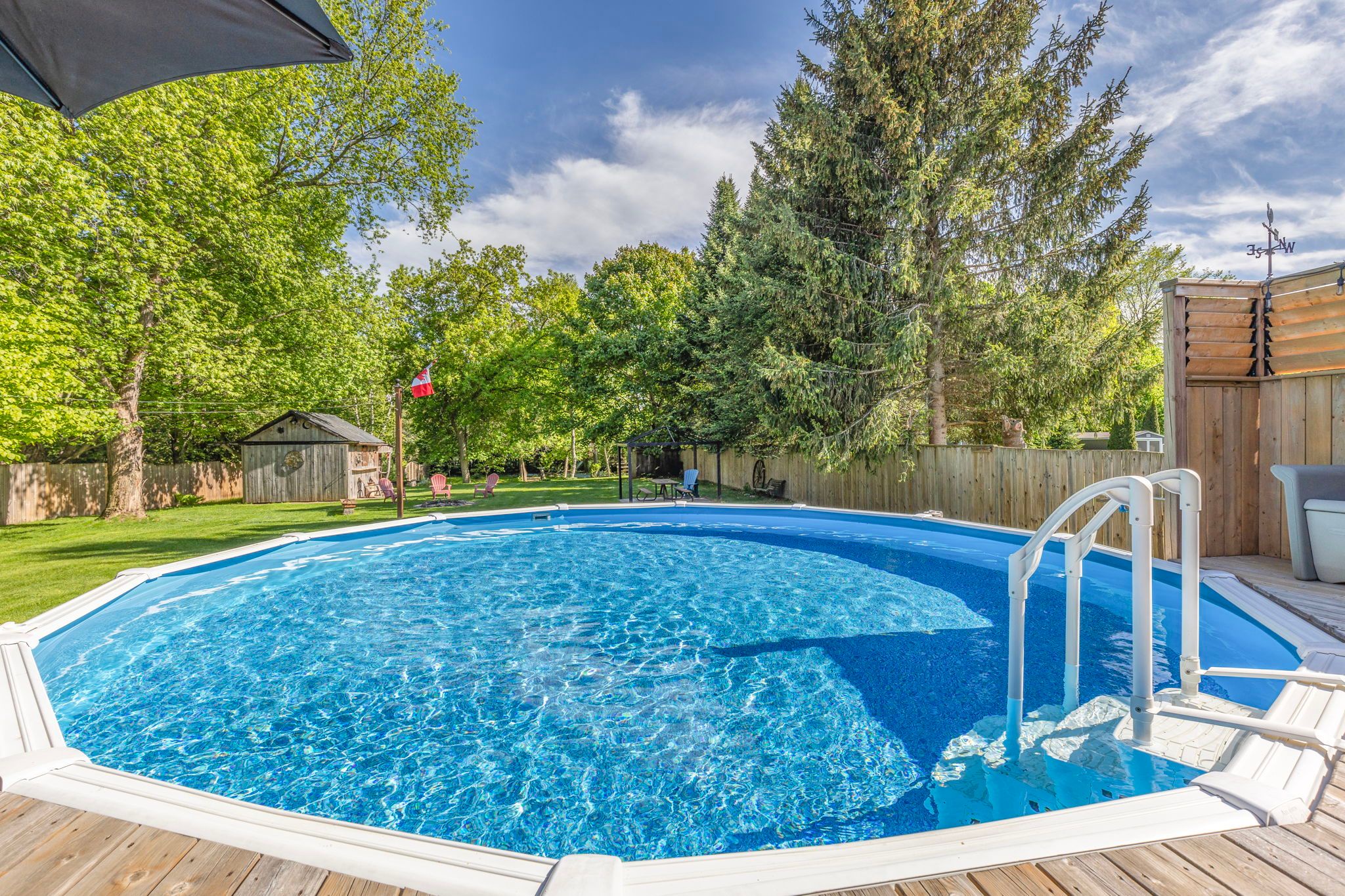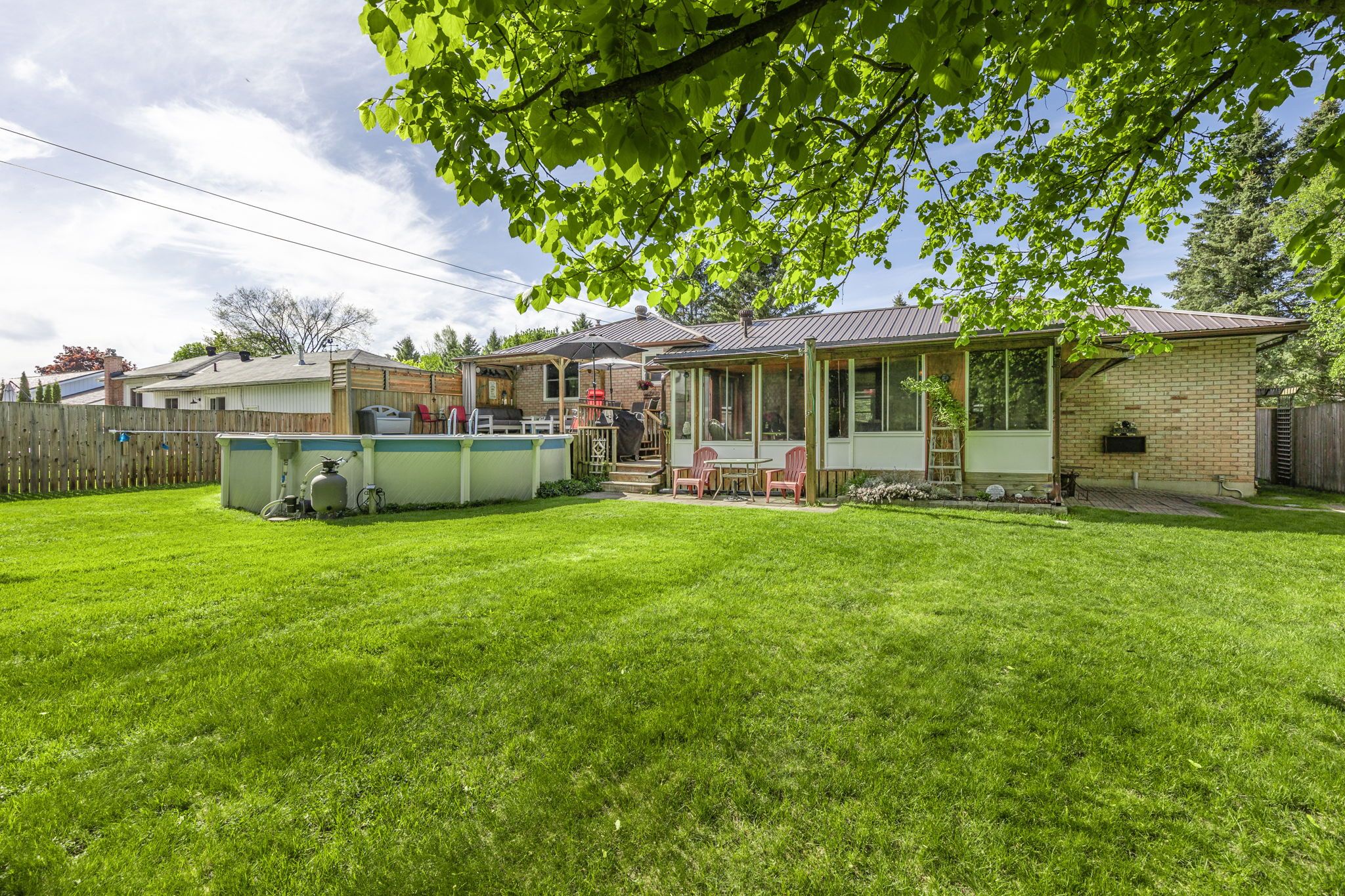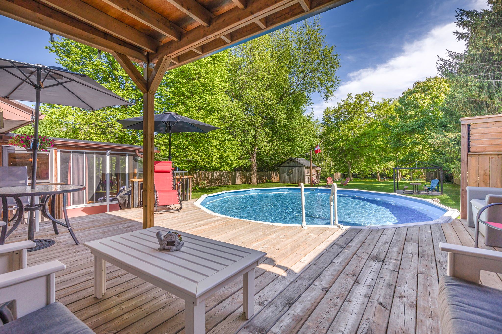 If you are looking for a backyard retreat where your home feels like you're away for the weekend, then this is it! Make this 3 bedroom sidesplit your Monday-Friday home & your Weekend get away all in one. This 97'x356' private, fully fenced & treed lot offers an above ground pool & deck, large mature trees, a stream running through the back of the lot, gazebo for shade, a clothes line; a firepit to sit & enjoy in the evenings. This renovated house offers hickory floors through the main & upper levels. Open concept is great for having guests with the living rm & modern kitchen opened up & a w/out to the sunroom, more living space with an electric fireplace & w/outs to this amazing backyard. 3 bdrms with the Primary offering a 2 pc ensuite & an amazing view to wake up to every morning. A few steps down the family room is rustic & spacious with a gas fireplace & closets for storage, great for the growing family. Laundry room has 2 pc washroom which can be converted to a 3 pc. Metal roof in 2014; double car heated garage with insulated doors, a sink, storage & w/out to the sunroom. Lots of parking for 8 cars, quiet part of town that feels like you're in the country. If you want a house & a weekend retreat all in one, this is worth the look!