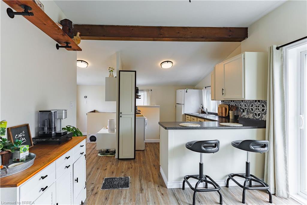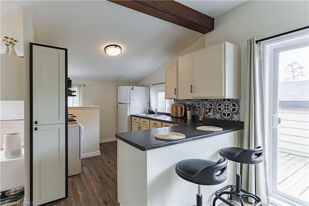 Upon entry, be greeted by a welcoming foyer and a stunning staircase that set the tone for the character-filled interior. The spacious main floor features a cozy yet open living room and a dedicated dining area—perfect for quiet evenings or entertaining guests. The oversized kitchen boasts warmth, style, and functionality, complete with a handy mudroom and direct access through sliding patio doors to a private deck—ideal for summer gatherings or morning coffee escapes.