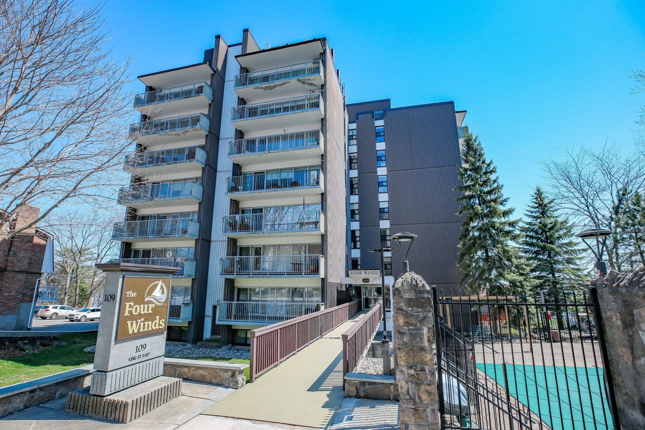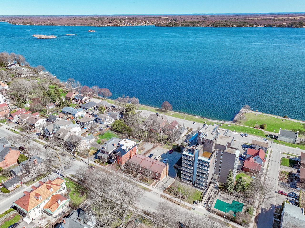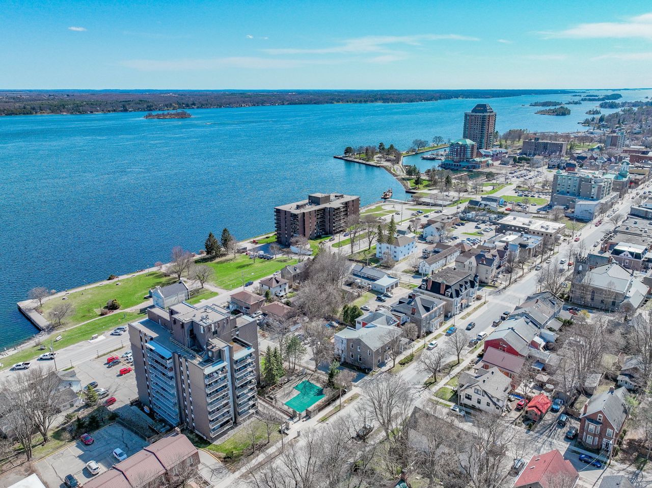 Fabulous downtown Brockville condo with oversized 5x20 balcony located across from Centeen Park on the beautiful St. Lawrence River. Discover carefree living in the heart of downtown Brockville with this exceptional 2-bedroom condo in the sought after "Four Winds." Modern kitchen, dining and living area flows seamlessly to a spacious balcony, perfect for enjoying every changing city views without high winds or intense sun. Amenities include a heated inground pool, exercise room, sauna, newly refurbished games/party room, laundry on every floor, storage locker, and assigned parking. Condo fees cover all the essentials: parking, landscaping, maintenance and more - ensuring effortless living. Just steps from the St. Lawrence River, this condo offers a perfect blend of comfort, convenience, and vibrant downtown living.