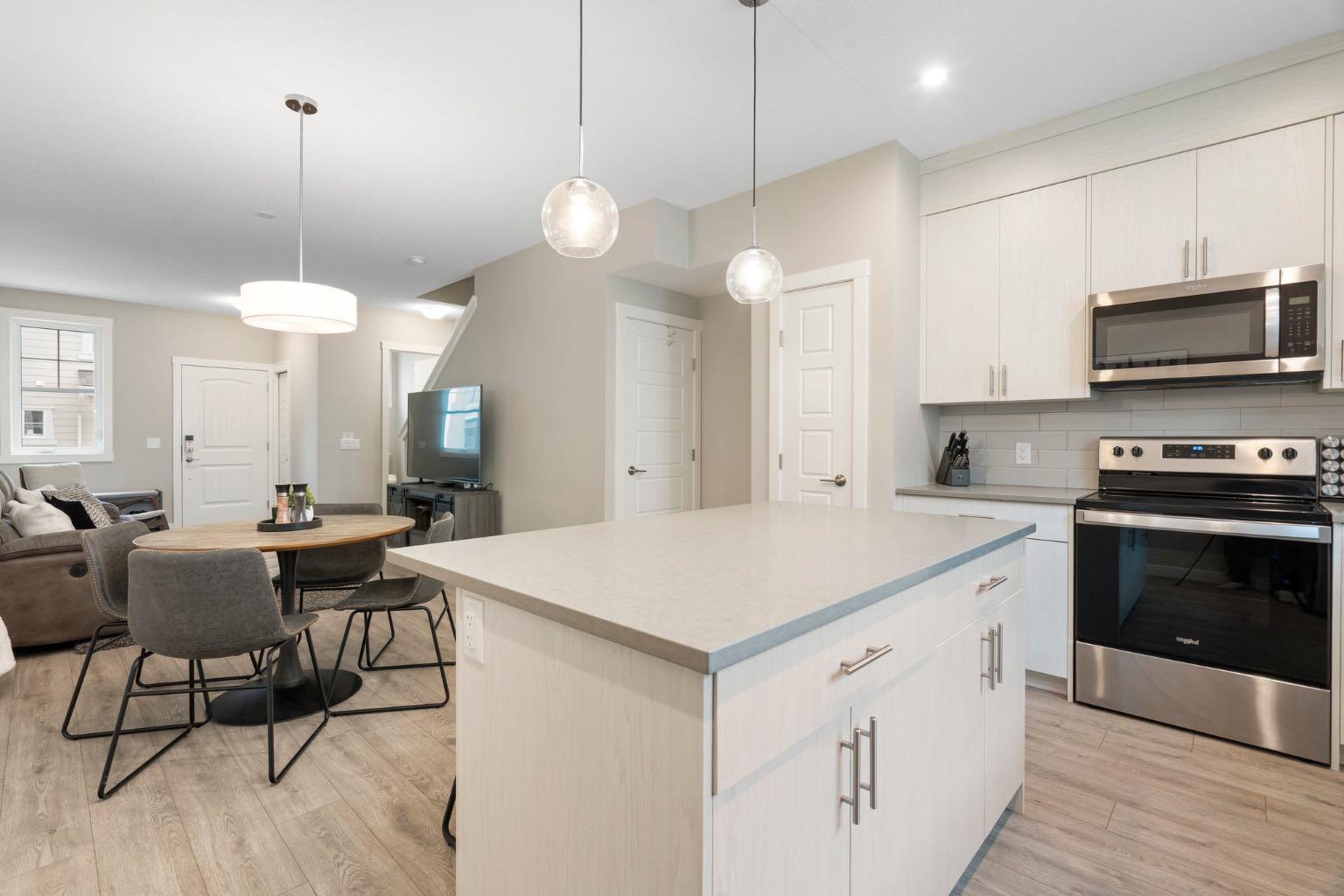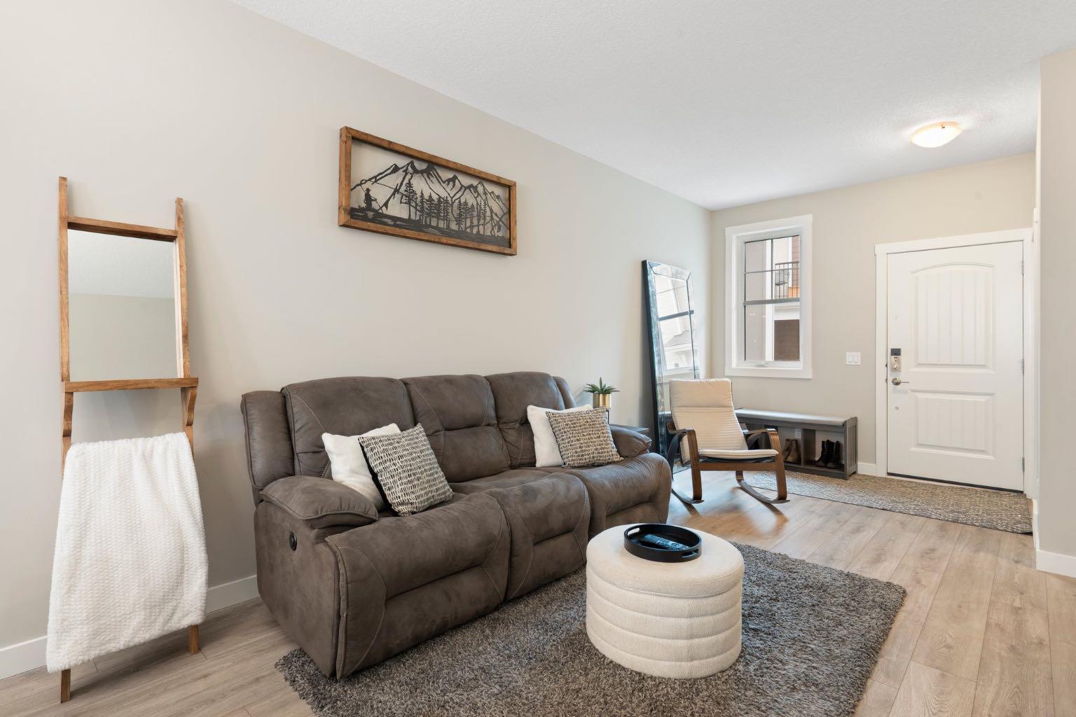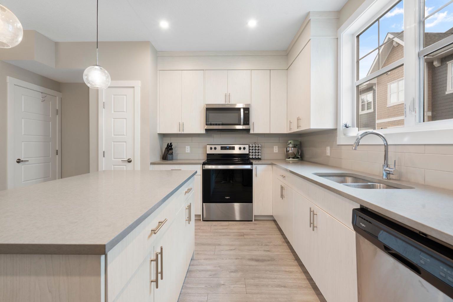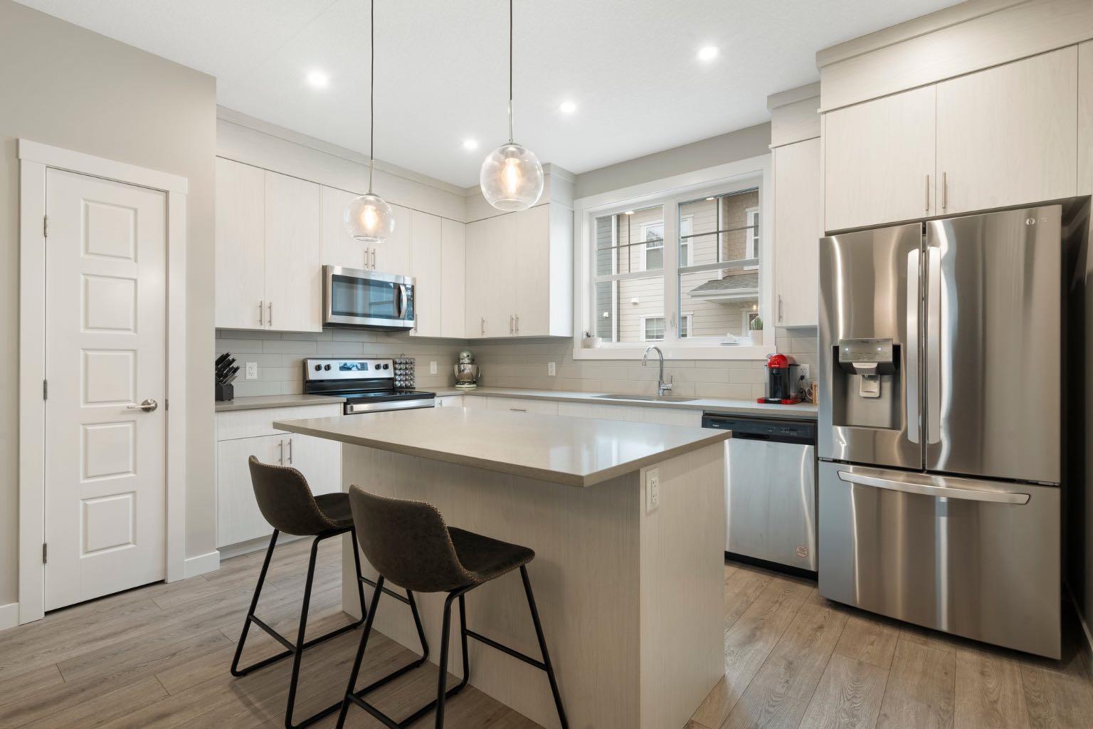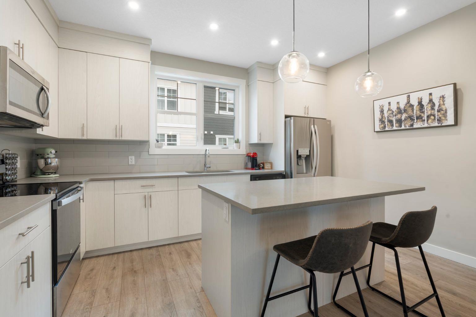 Tucked into the lush, natural beauty of Cranston’s Riverstone, 307 Cranbrook Walk SE invites you to experience a life where elegance, comfort, and community flow together effortlessly. This beautifully appointed townhouse offers more than just a place to live—it’s a space that complements your lifestyle: modern, elevated, and effortlessly functional. Step inside and feel the difference of thoughtful design. The open-concept main floor is as functional as it is stylish—perfect for lively dinner parties, quiet Sunday mornings, or that spontaneous work-from-home day. Your kitchen is a true showpiece, anchored by a spacious island and finished with sleek grey quartz counters, full-height cabinetry with soft-close doors and drawers, and stainless steel appliances (yes, the fridge has a water line!). Whether you’re hosting or unwinding, every corner of this home is dialed into convenience and comfort. Upstairs, discover the coveted double primary bedroom layout—each with its own private ensuite. It’s an ideal setup for roommates, guests, or simply extra space for the life you lead. The upstairs laundry keeps daily routines effortless, while the south-facing fenced patio offers your own private spot to soak up the sun. Need space for your gear or extra vehicles? The double tandem garage has you covered—and your guests will love the convenient visitor parking just steps away. Plus, low monthly condo fees mean you get to enjoy a beautifully maintained complex without stretching your budget. Set within the peaceful embrace of Cranston’s Riverstone—where walking trails, parks, and the Bow River are part of your everyday backdrop—this is the kind of home that makes life feel easy, elevated, and connected. You’ll also have access to Cranston’s Community Hall up the hill which has a splash park, skate park, hockey rink, tennis courts & so much more. This home has it all – don’t miss out. Book your private showing today.