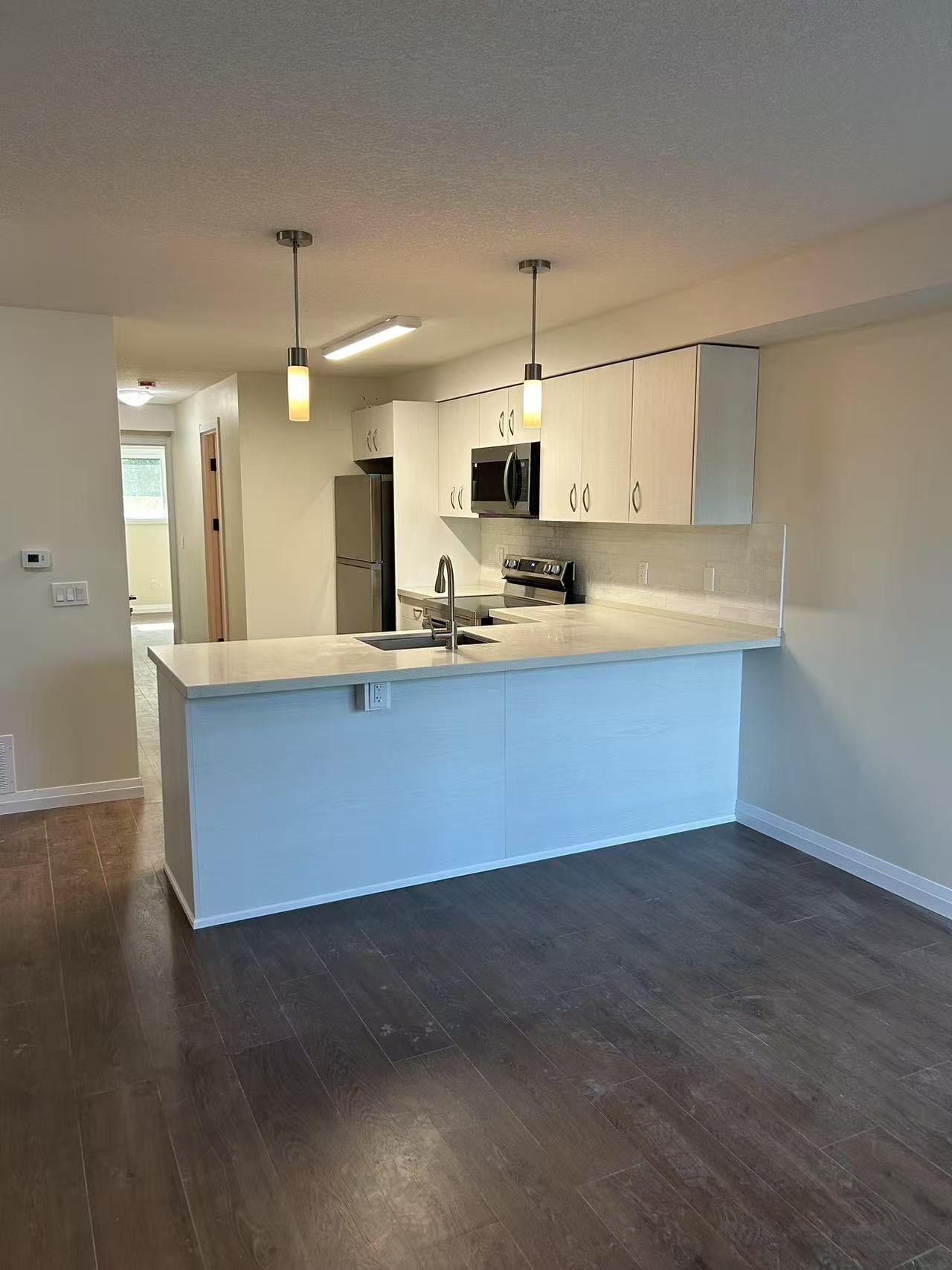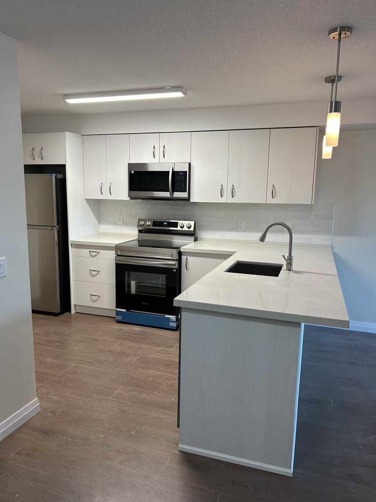 全屋大窗设计,无地毯覆盖,宽敞客厅,开放式概念厨房配备不锈钢电器与石英石台面。