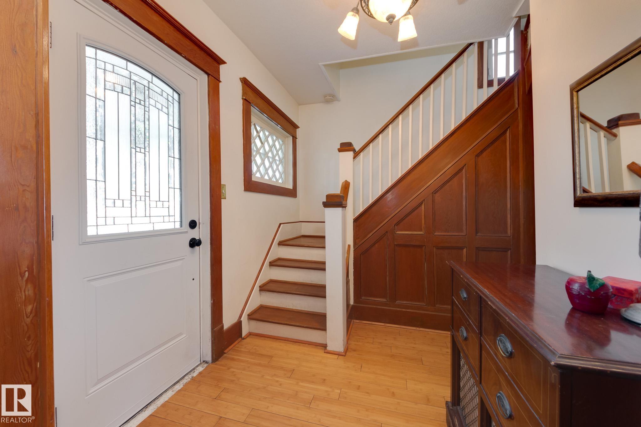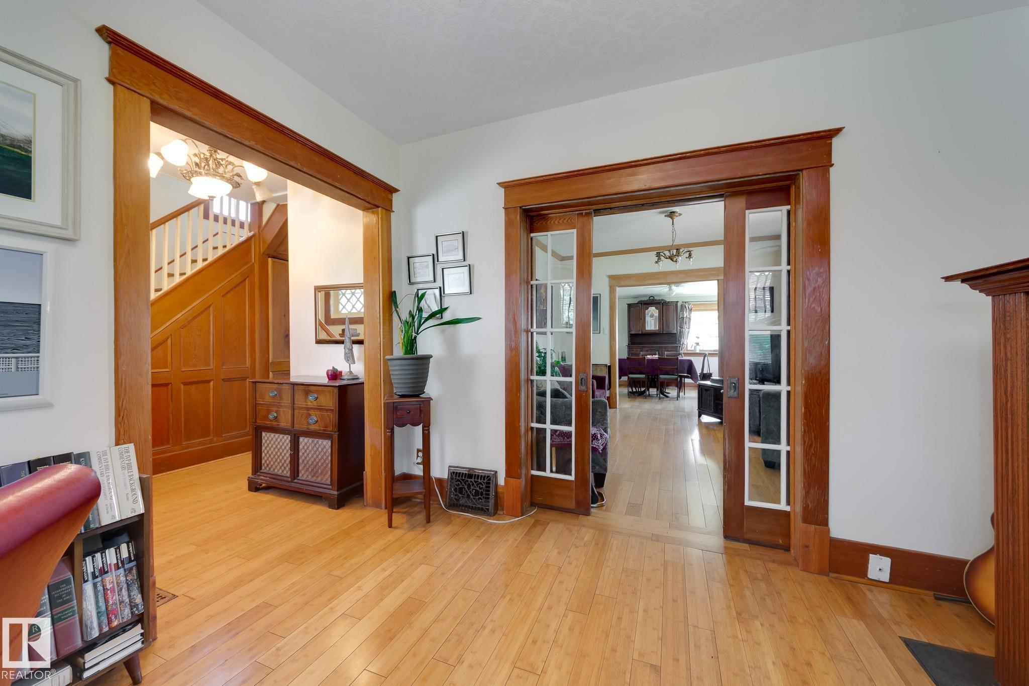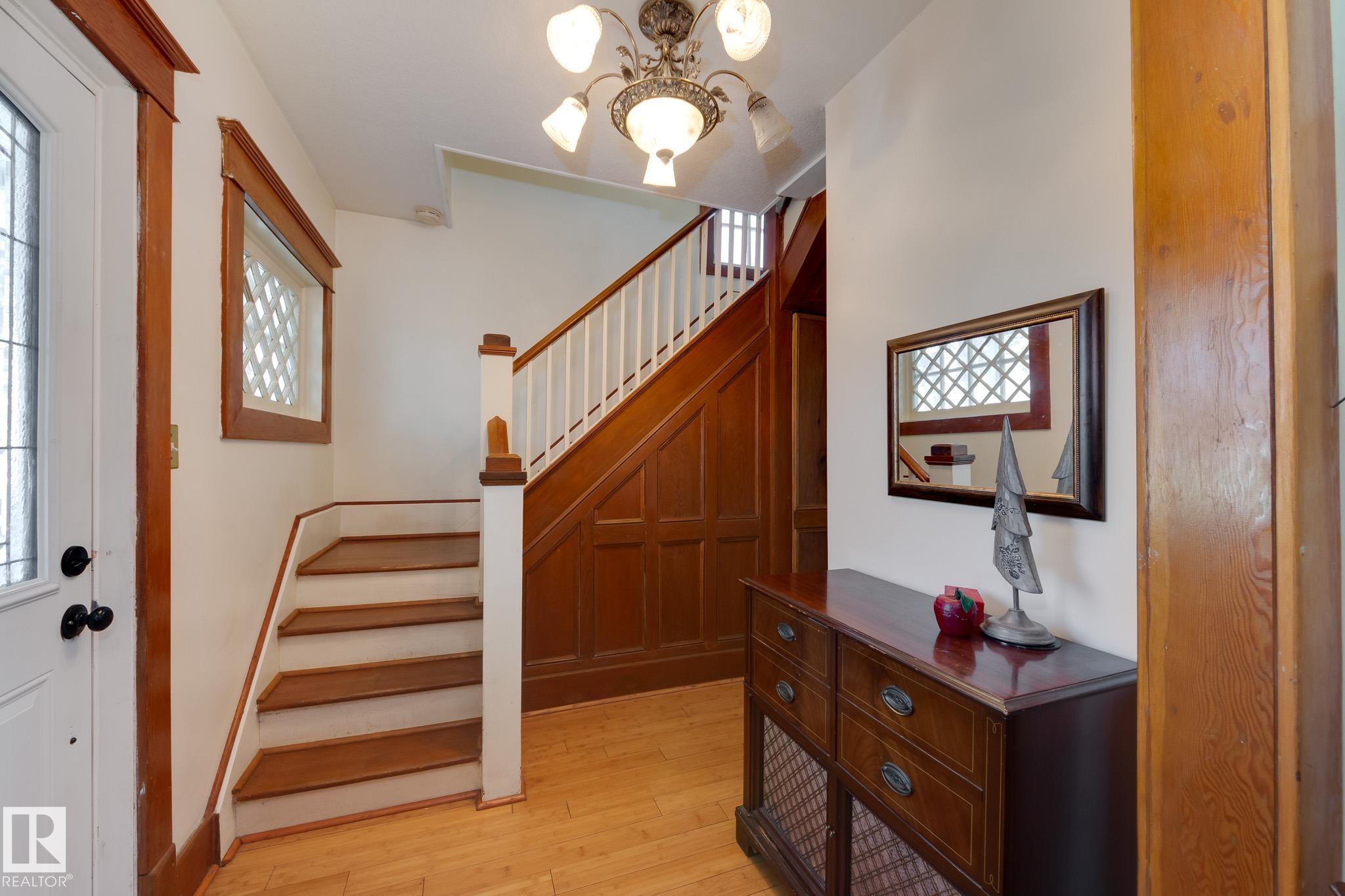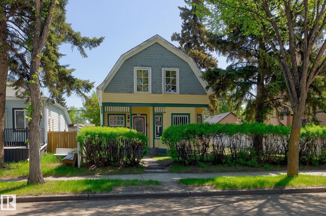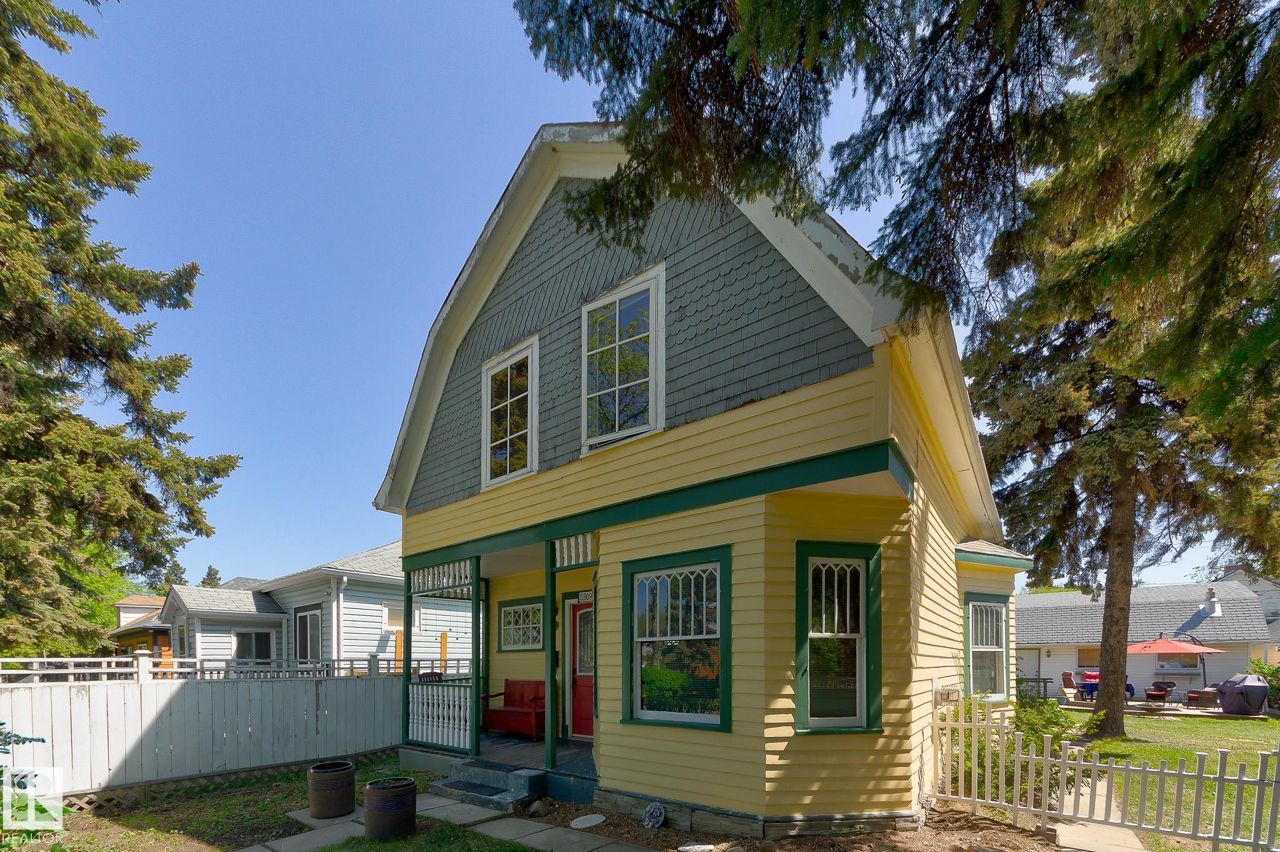 "The Grant McConachie House" a rare and historically iconic 105 oyear old Edmonton property was built in old Dutch styling. Wonderfully preserved- featuring rich Douglas fir woodwork, copper plated heating vents, French doors, beautiful bay windows, clawfoot bathtub, hardwood flooring throughout. Upgrades include NEW Furnace & HWT(2025), kitchen cabinetry, dishwasher, electrical, plumbing, weeping tile, low-E argon casement windows upstairs, exterior doors & locks, heating & vents, newer roof over veranda, shower added to main bath & plumbing upstairs, copper line, period correct steel & chrome faucets, beautiful gas fireplace (oak & tile) heated garage built 1998 (oversized trusses matched to scale with house). Situated on a large 580 square metre lot (50x125) the mature landscaping draws you to enjoy the covered front porch & the delightful spacious covered deck just off the kitchen. Fabulous lot for development down the road or enjoy this treasure for many years to come!