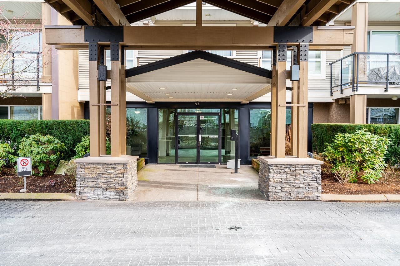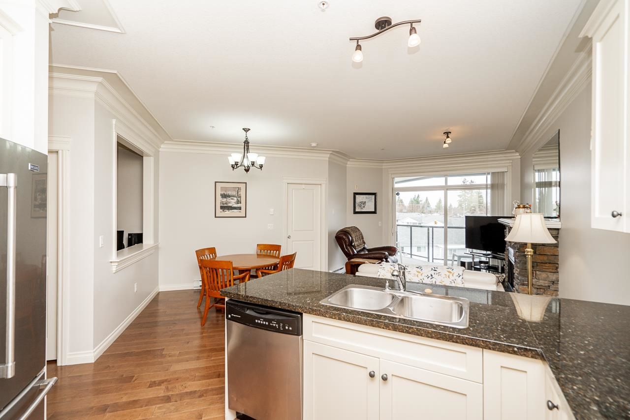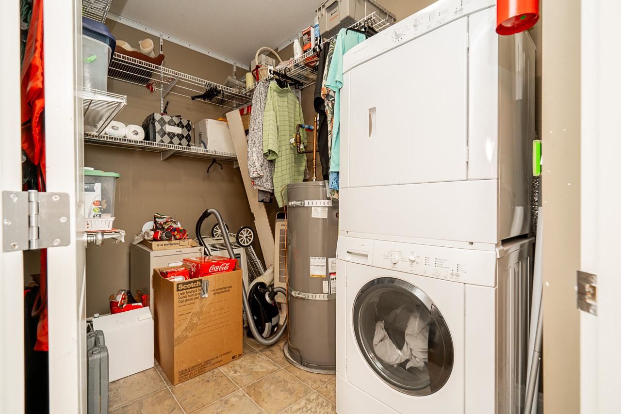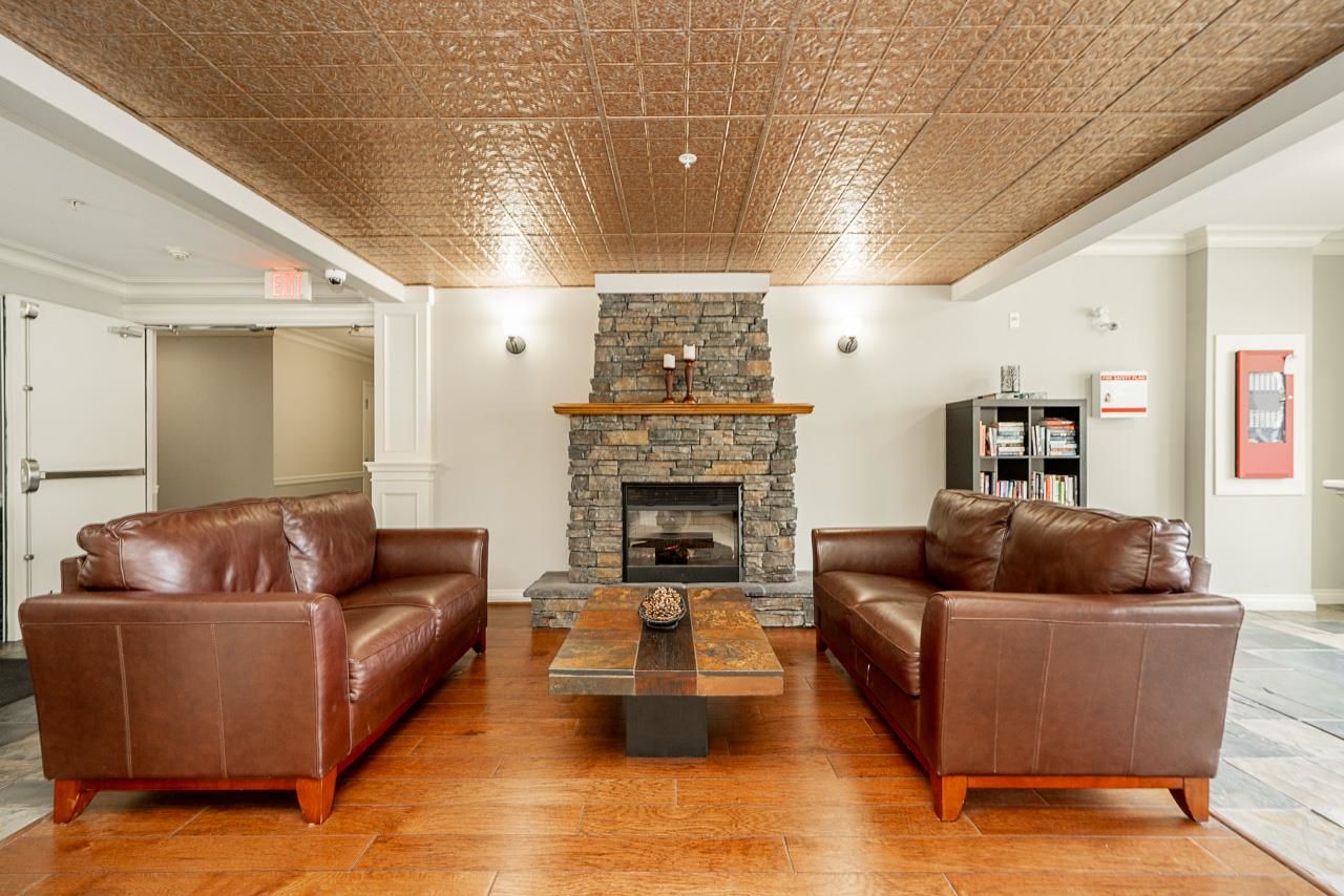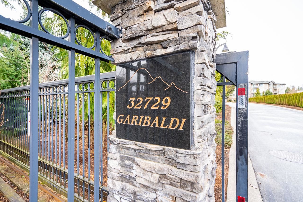 WOW! Almost 1,000 SQ FT - TOP FLOOR - 1 BED + DEN + 2 BATHS at the coveted GARIBALDI LANE. Super quiet inside corner unit overlooking the courtyard. Open floor plan with a super functional kitchen with granite counters and S/S appliances. Crown moulding through out. Plenty of natural light with an abundance of windows and a great-sized balcony. Generously sized primary bedroom with a walk-in closet. No storage issues here with an oversized utility room PLUS a storage Locker. Ensuite has a soaker tub, separate stand up shower and double vanity. Also a convenient powder room perfect for guests. In-suite laundry and a beautiful stonework fireplace. A perfect location on the border of West and Central Abbotsford, walking distance to Trading Post, Restaurants, transit and all amenities.