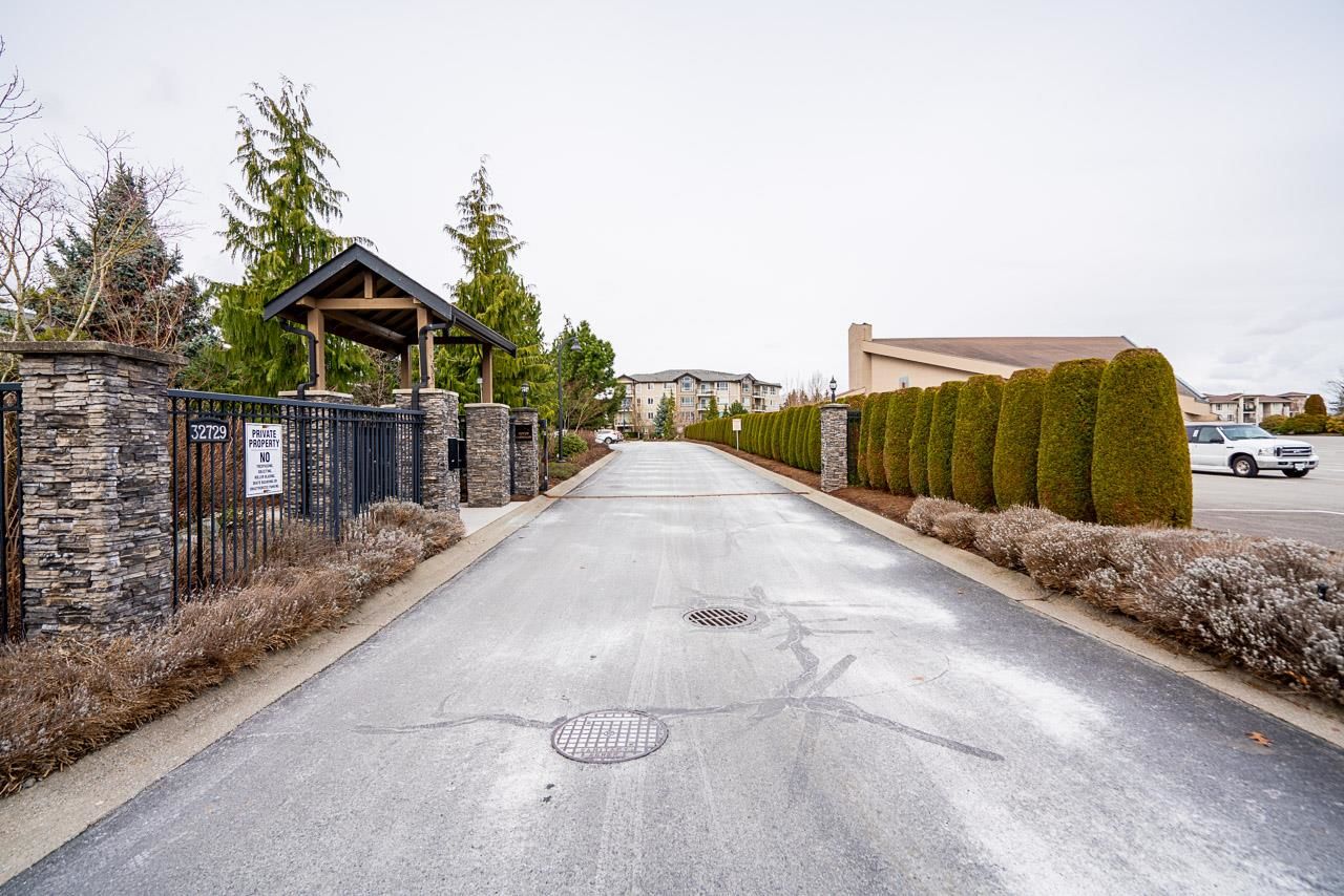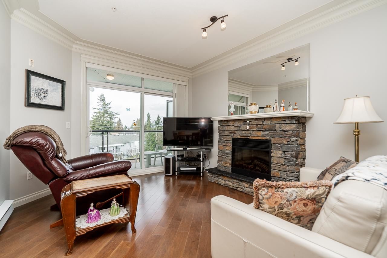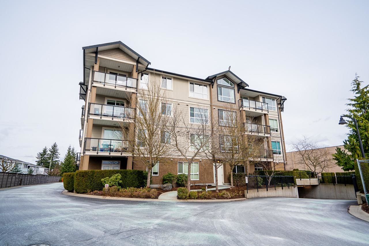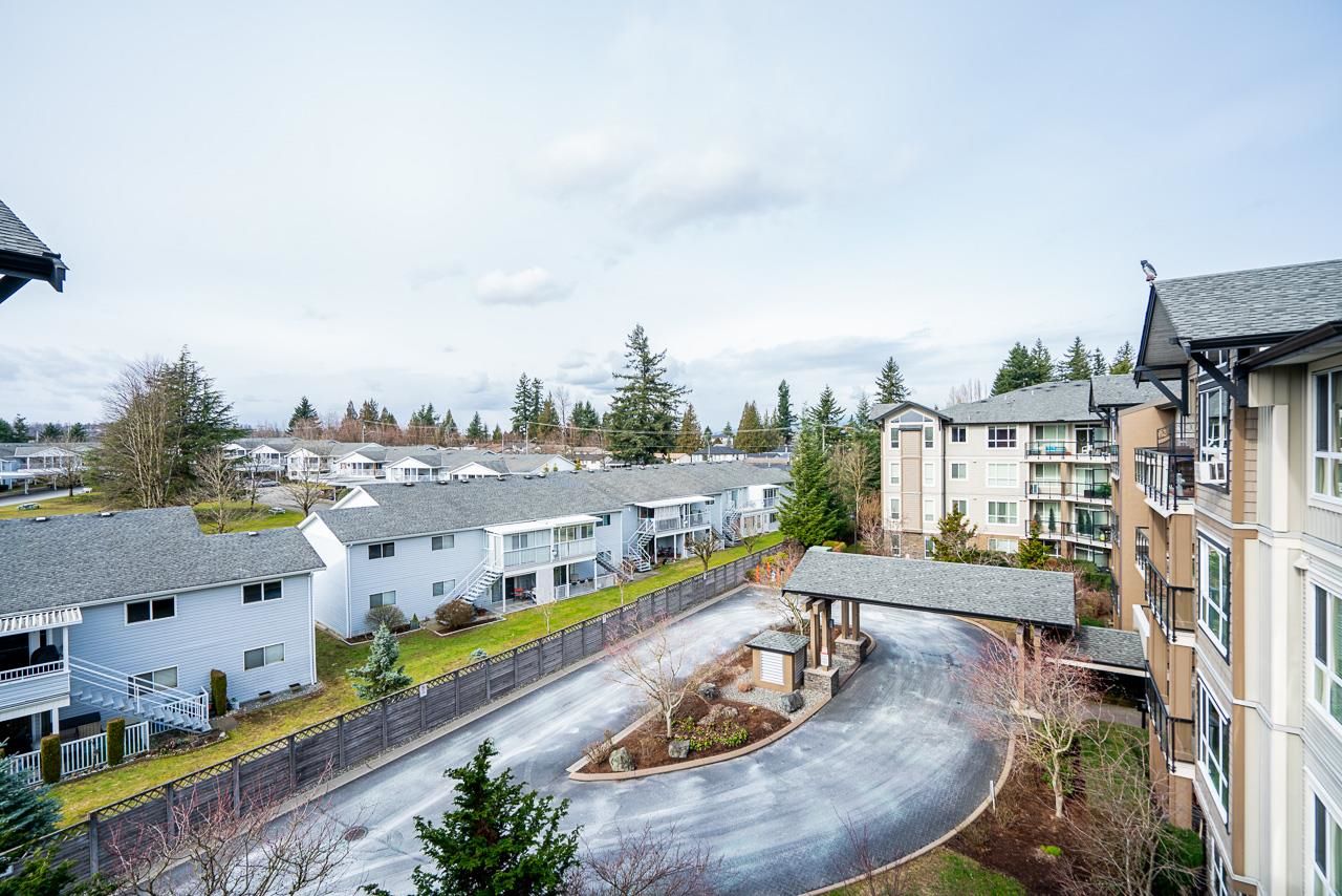 WOW! Almost 1,000 SQ FT - TOP FLOOR - 1 BED + DEN + 2 BATHS at the coveted GARIBALDI LANE. Super quiet inside corner unit overlooking the courtyard. Open floor plan with a super functional kitchen with granite counters and S/S appliances. Crown moulding through out. Plenty of natural light with an abundance of windows and a great-sized balcony. Generously sized primary bedroom with a walk-in closet. No storage issues here with an oversized utility room PLUS a storage Locker. Ensuite has a soaker tub, separate stand up shower and double vanity. Also a convenient powder room perfect for guests. In-suite laundry and a beautiful stonework fireplace. A perfect location on the border of West and Central Abbotsford, walking distance to Trading Post, Restaurants, transit and all amenities.