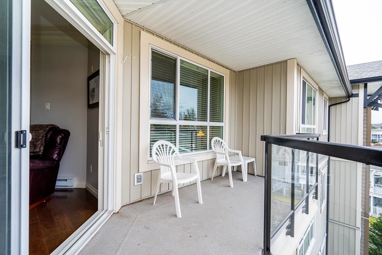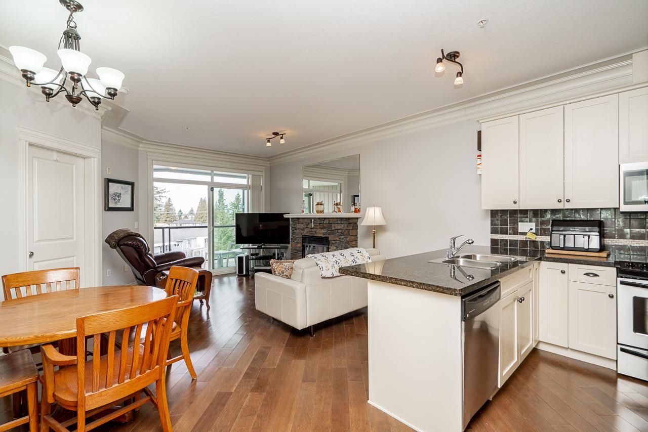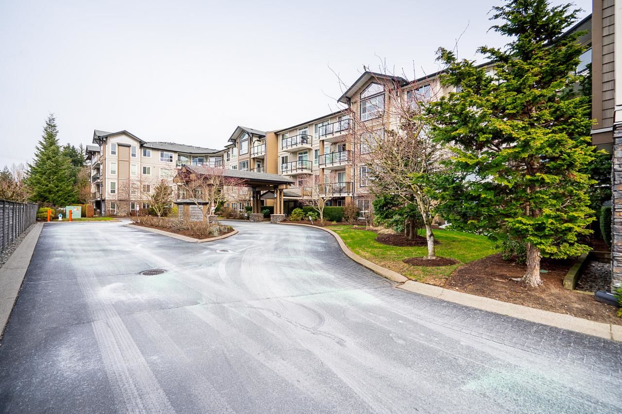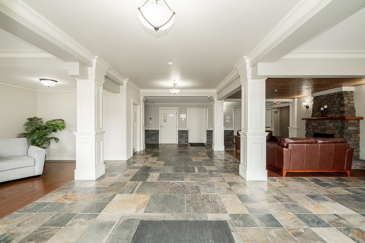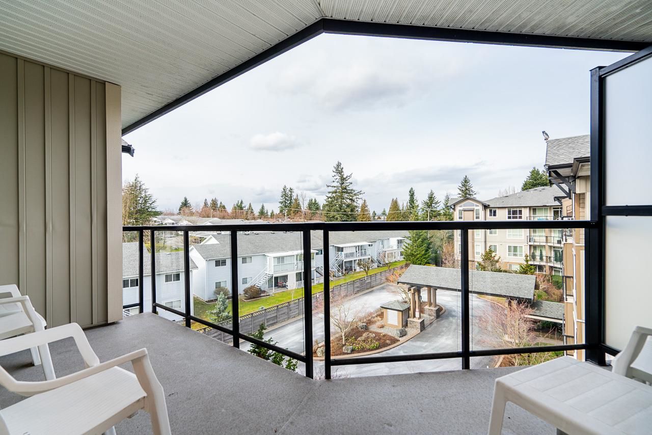 WOW! Almost 1,000 SQ FT - TOP FLOOR - 1 BED + DEN + 2 BATHS at the coveted GARIBALDI LANE. Super quiet inside corner unit overlooking the courtyard. Open floor plan with a super functional kitchen with granite counters and S/S appliances. Crown moulding through out. Plenty of natural light with an abundance of windows and a great-sized balcony. Generously sized primary bedroom with a walk-in closet. No storage issues here with an oversized utility room PLUS a storage Locker. Ensuite has a soaker tub, separate stand up shower and double vanity. Also a convenient powder room perfect for guests. In-suite laundry and a beautiful stonework fireplace. A perfect location on the border of West and Central Abbotsford, walking distance to Trading Post, Restaurants, transit and all amenities.
