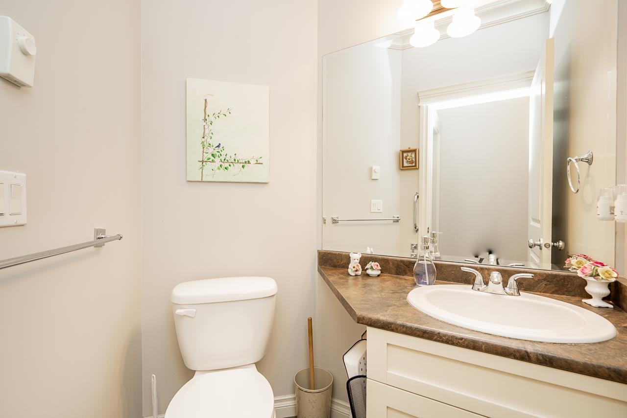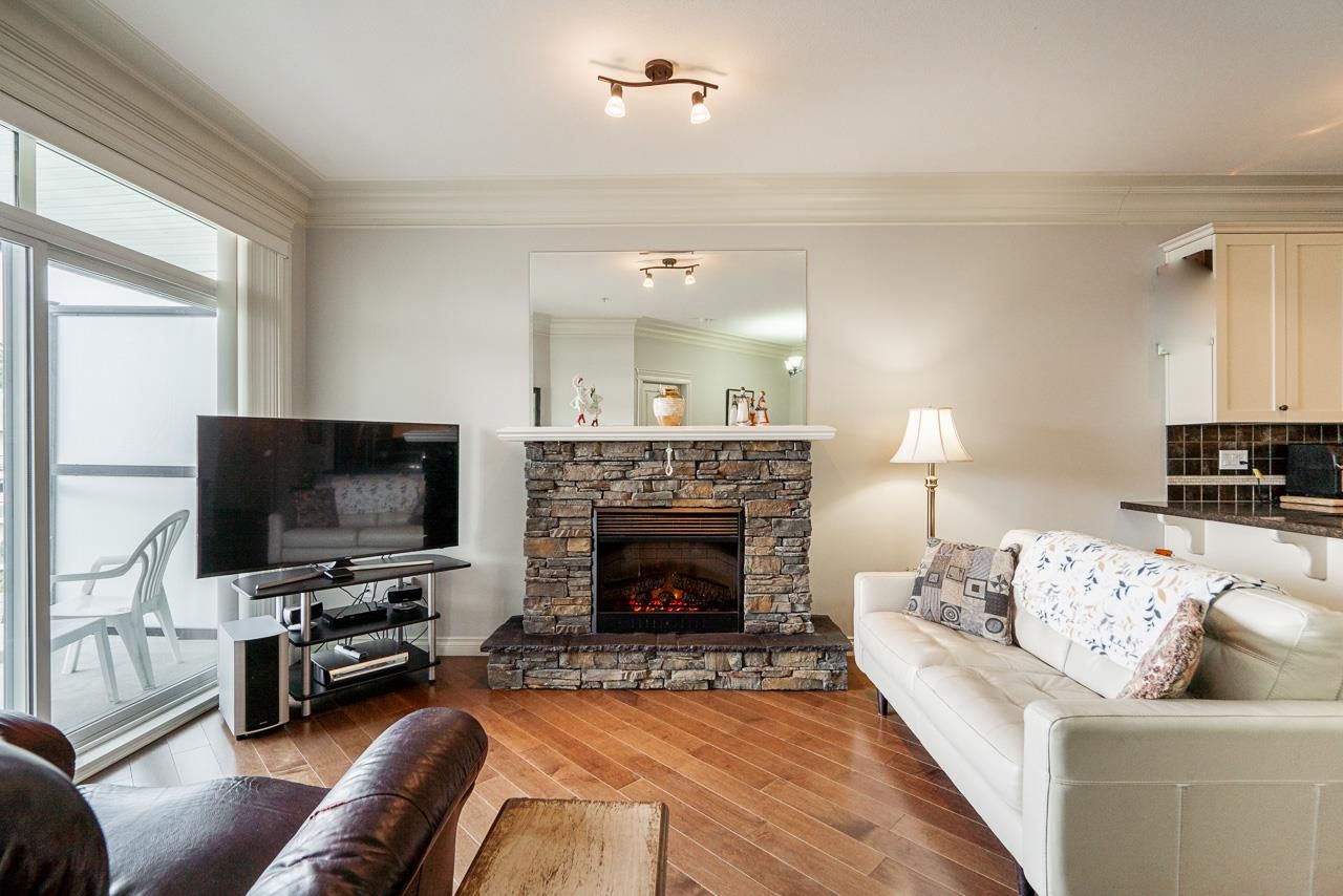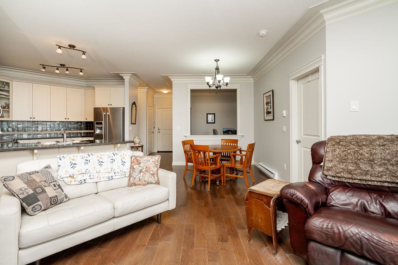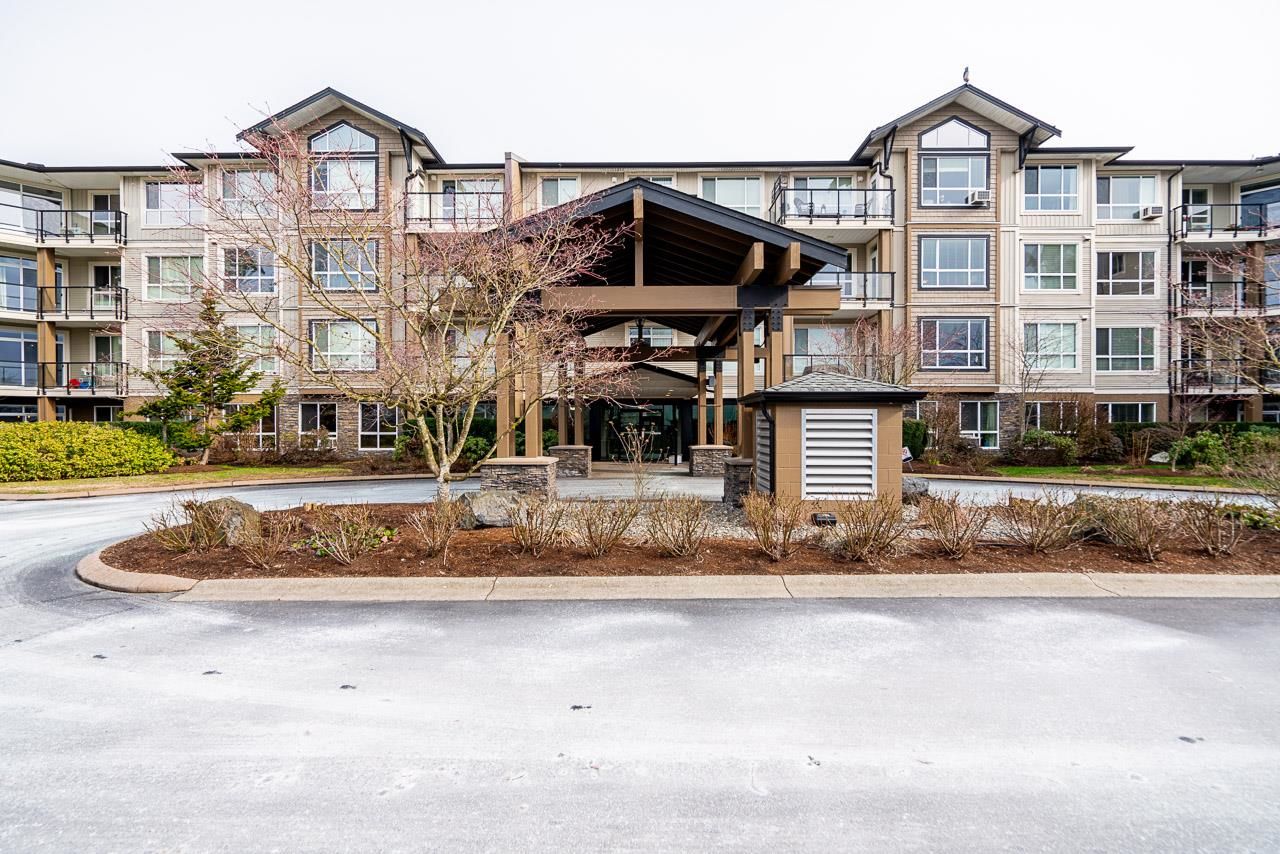 WOW! Almost 1,000 SQ FT - TOP FLOOR - 1 BED + DEN + 2 BATHS at the coveted GARIBALDI LANE. Super quiet inside corner unit overlooking the courtyard. Open floor plan with a super functional kitchen with granite counters and S/S appliances. Crown moulding through out. Plenty of natural light with an abundance of windows and a great-sized balcony. Generously sized primary bedroom with a walk-in closet. No storage issues here with an oversized utility room PLUS a storage Locker. Ensuite has a soaker tub, separate stand up shower and double vanity. Also a convenient powder room perfect for guests. In-suite laundry and a beautiful stonework fireplace. A perfect location on the border of West and Central Abbotsford, walking distance to Trading Post, Restaurants, transit and all amenities.