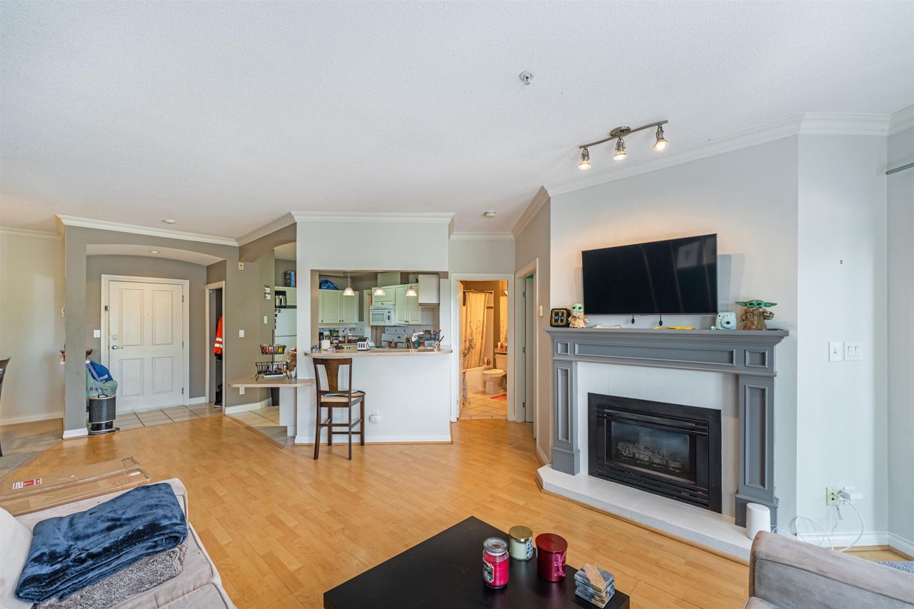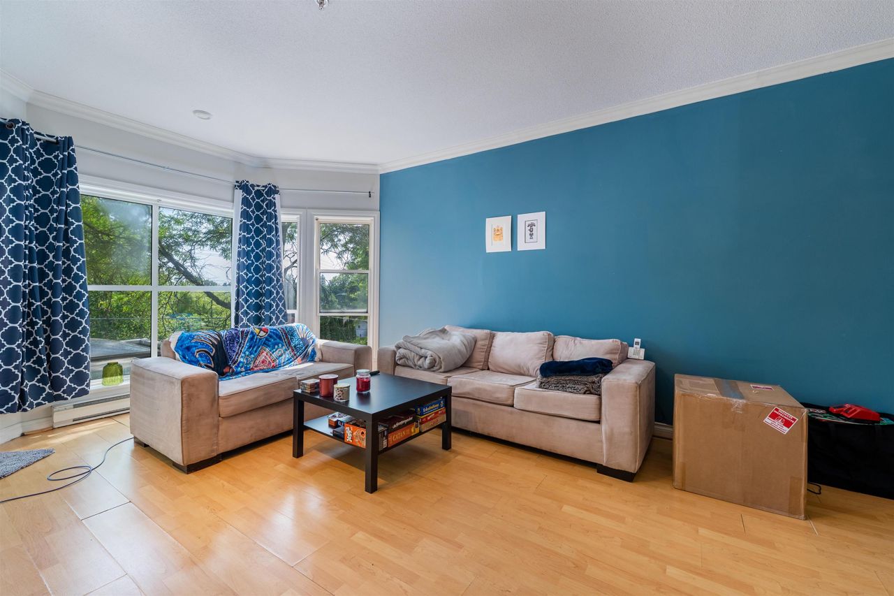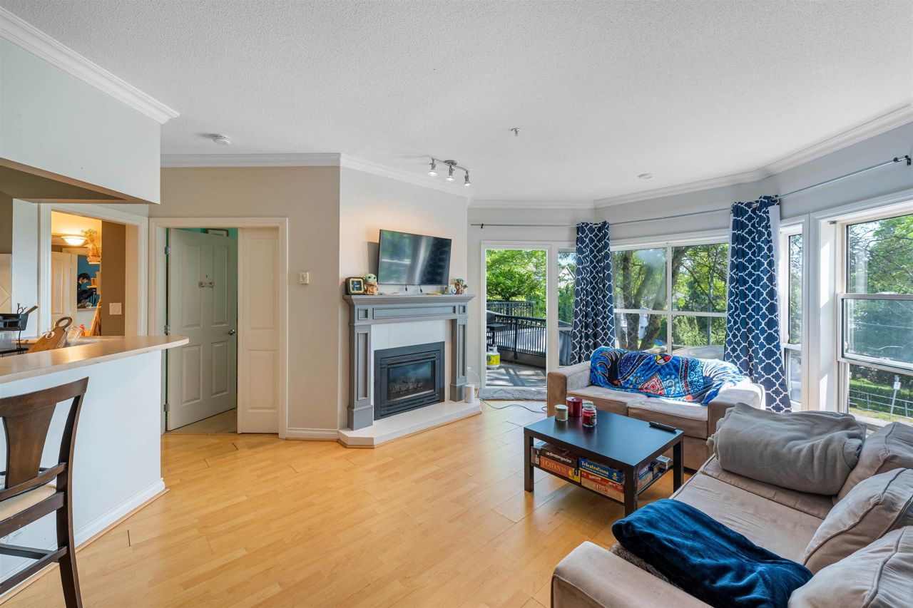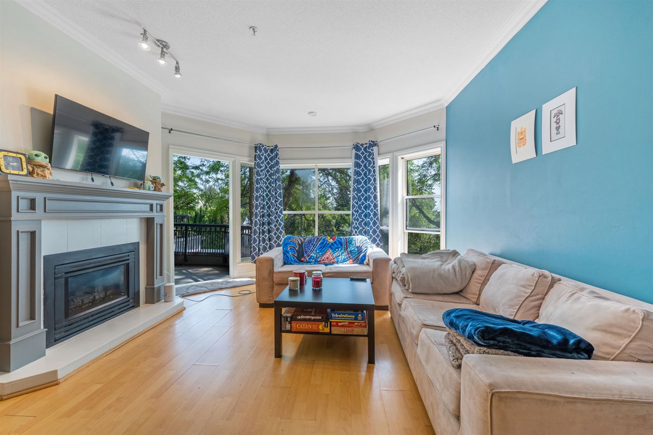"Yale Terrace" Good building surrounded by beautiful greenery, families & pets welcome. Bright home featuring a large Bay window, 9' ceilings & crown moulding. Spacious room sizes, 2 bedrooms & 2 baths. Cozy Gas Fireplace (gas & hot water included in strata). Nice covered patio. 2 Underground parking spots. Dogs ok up to 20 lbs or 2 cats allowed. Roof was done within the last 5 years.
