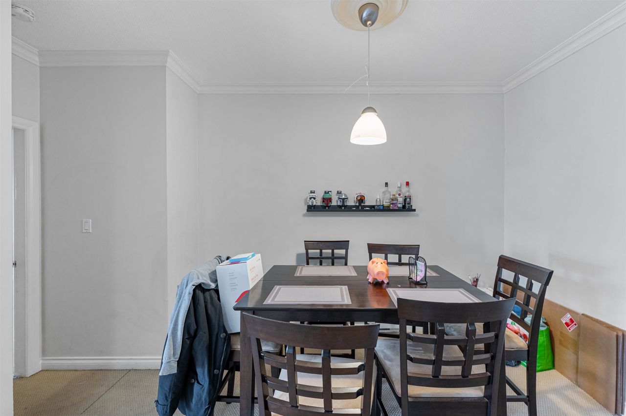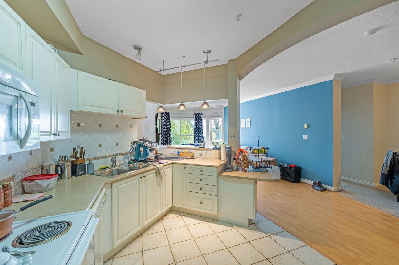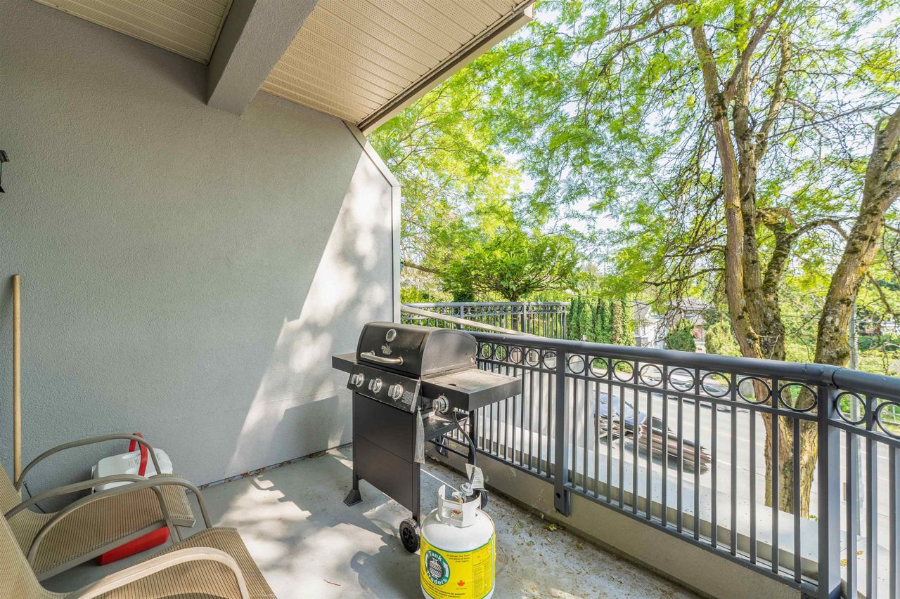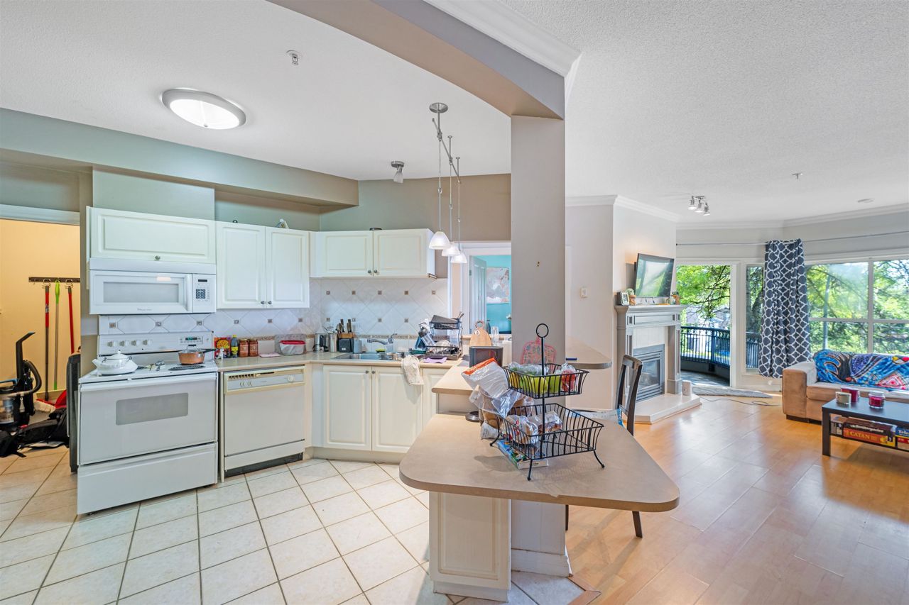 "Yale Terrace" Good building surrounded by beautiful greenery, families & pets welcome. Bright home featuring a large Bay window, 9' ceilings & crown moulding. Spacious room sizes, 2 bedrooms & 2 baths. Cozy Gas Fireplace (gas & hot water included in strata). Nice covered patio. 2 Underground parking spots. Dogs ok up to 20 lbs or 2 cats allowed. Roof was done within the last 5 years.