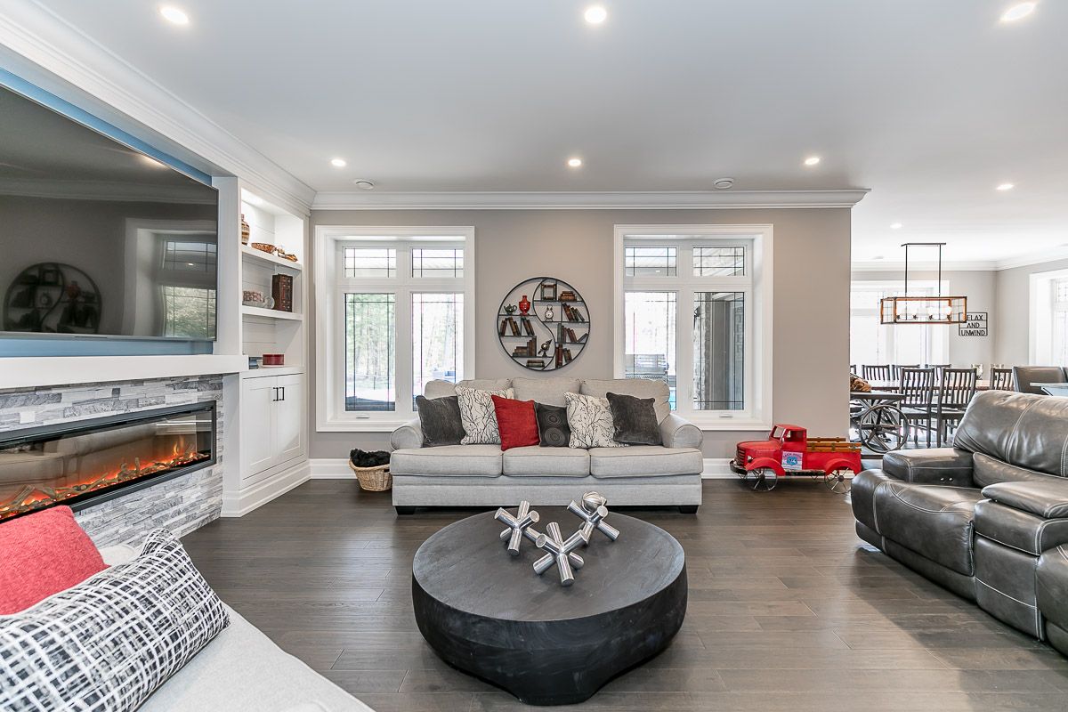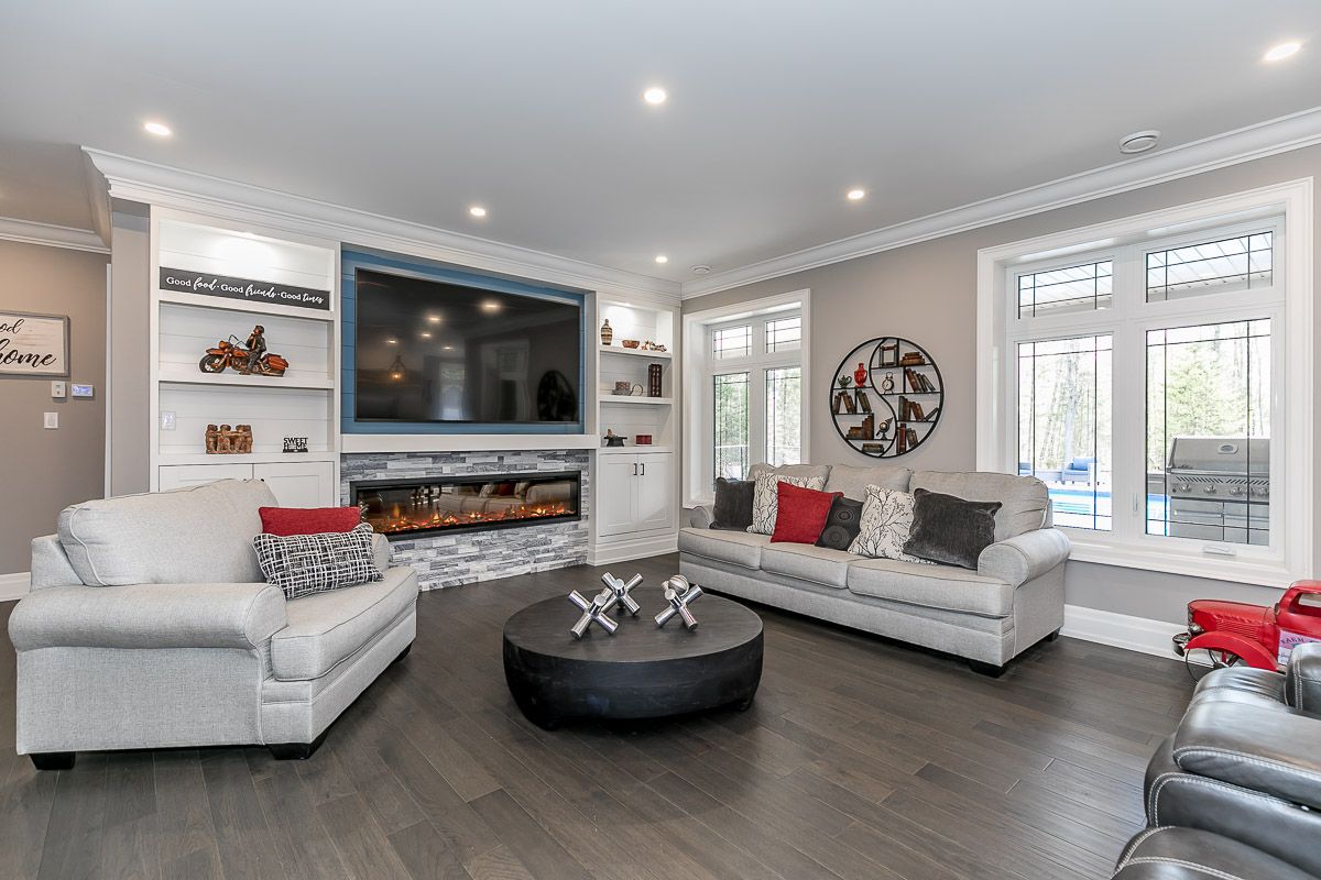 living room with custom built in wall unit, oversized electric fireplace & bright