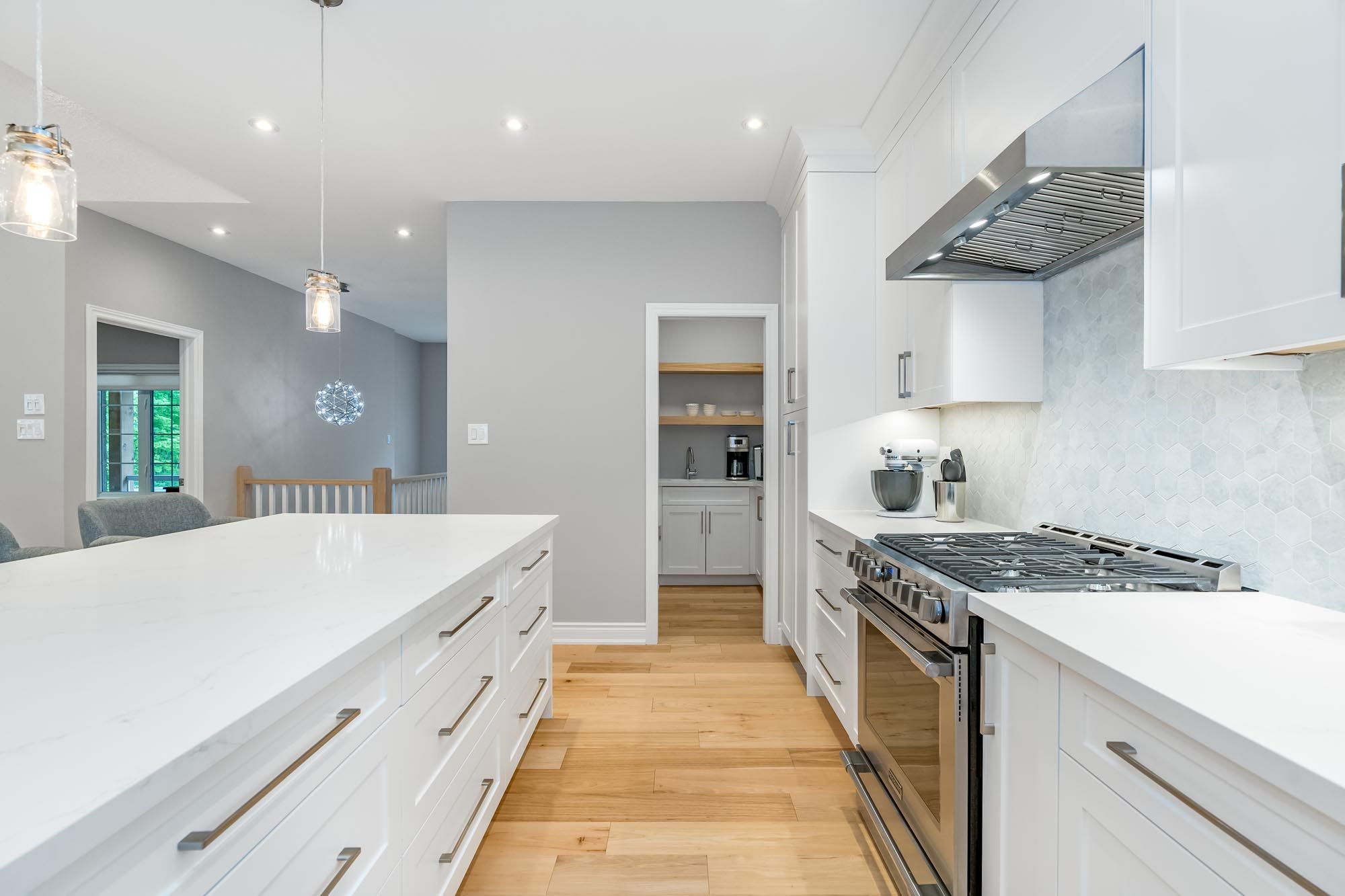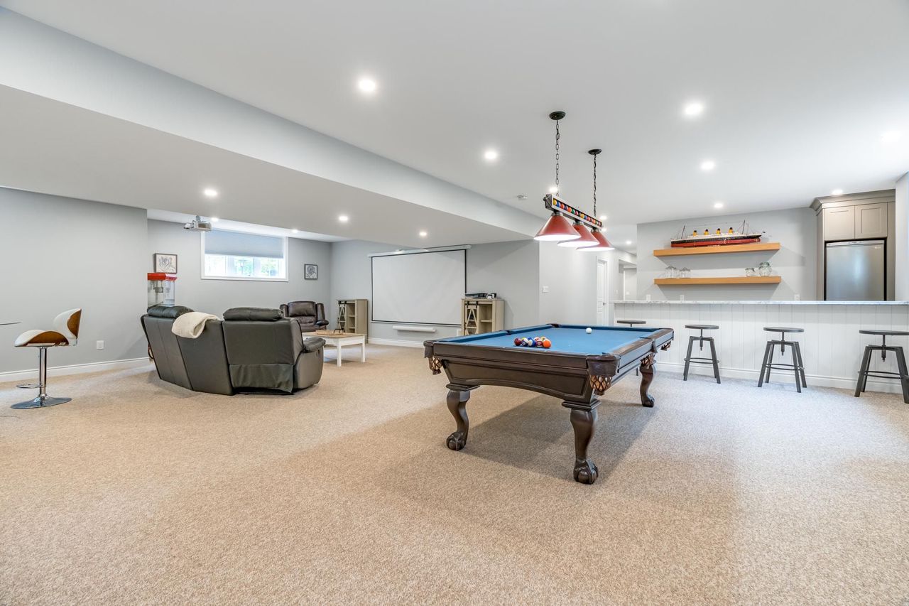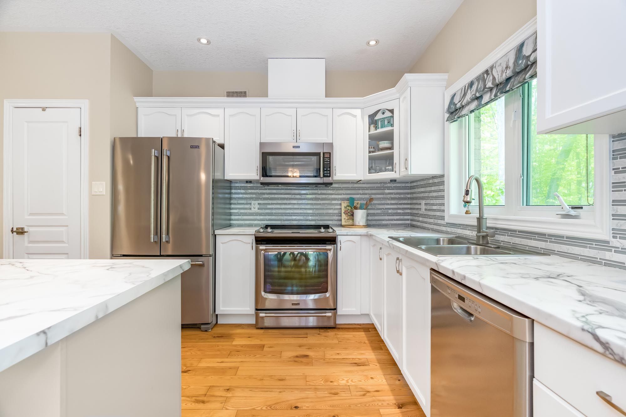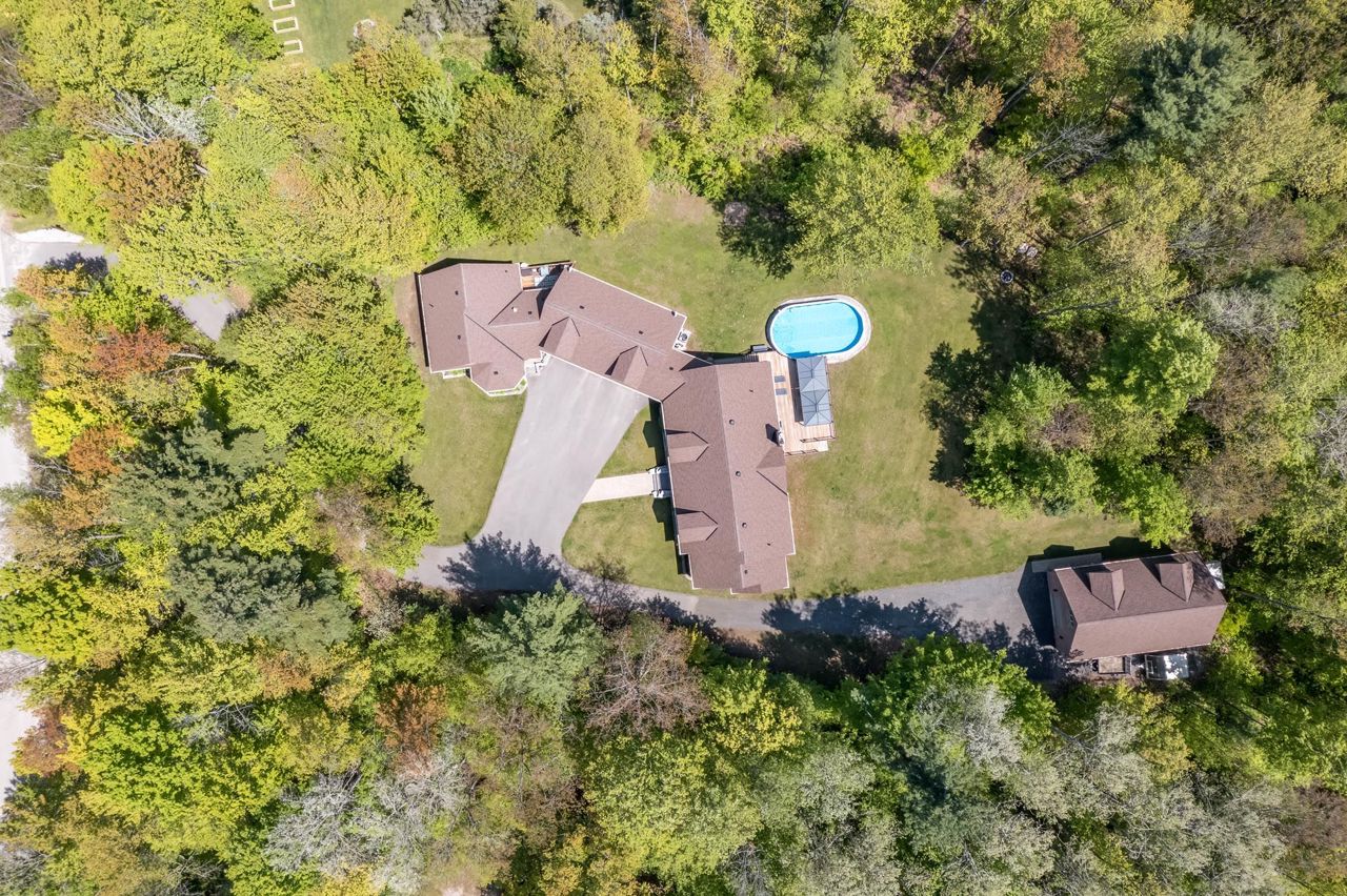 A rare opportunity offering two bungalows nestled upon a single property, alongside a triple car garage. Main level showcasing updated fooring throughout (2023), an updated kitchen adorned with quartz countertops, a brand-new gas stove and range hood, and an oversized centre island (2023). Hickory hardwood fooring leads into the grand dining room complete with a wood-burning freplace, and an open-concept living room with a soaring cathedral ceiling. Enjoy the fully fnished basement, offering a recreation room complete with a bar, an exercise room, an ofce space, a spacious bedroom, and a stunning bathroom. Potential for an in-law suite with the additional bungalow, with an eat-in kitchen, a living room, two bedrooms, and a full bathroom. Captivating curb appeal by custom driveway lamp posts and backyard oasis with an oval saltwater pool. Enticing 26'3” x 45'9" heated workshop with an oversized garage door and a loft. Added beneft of geothermal heating throughout the home