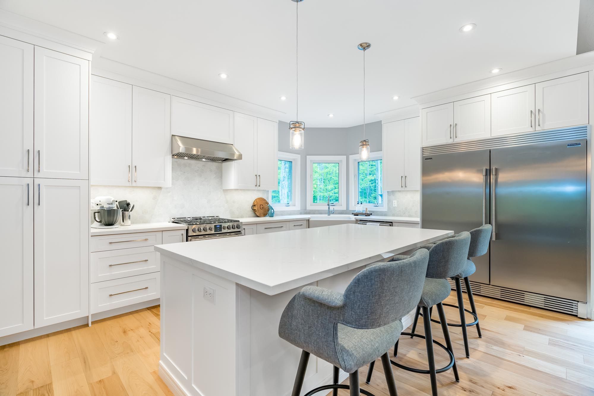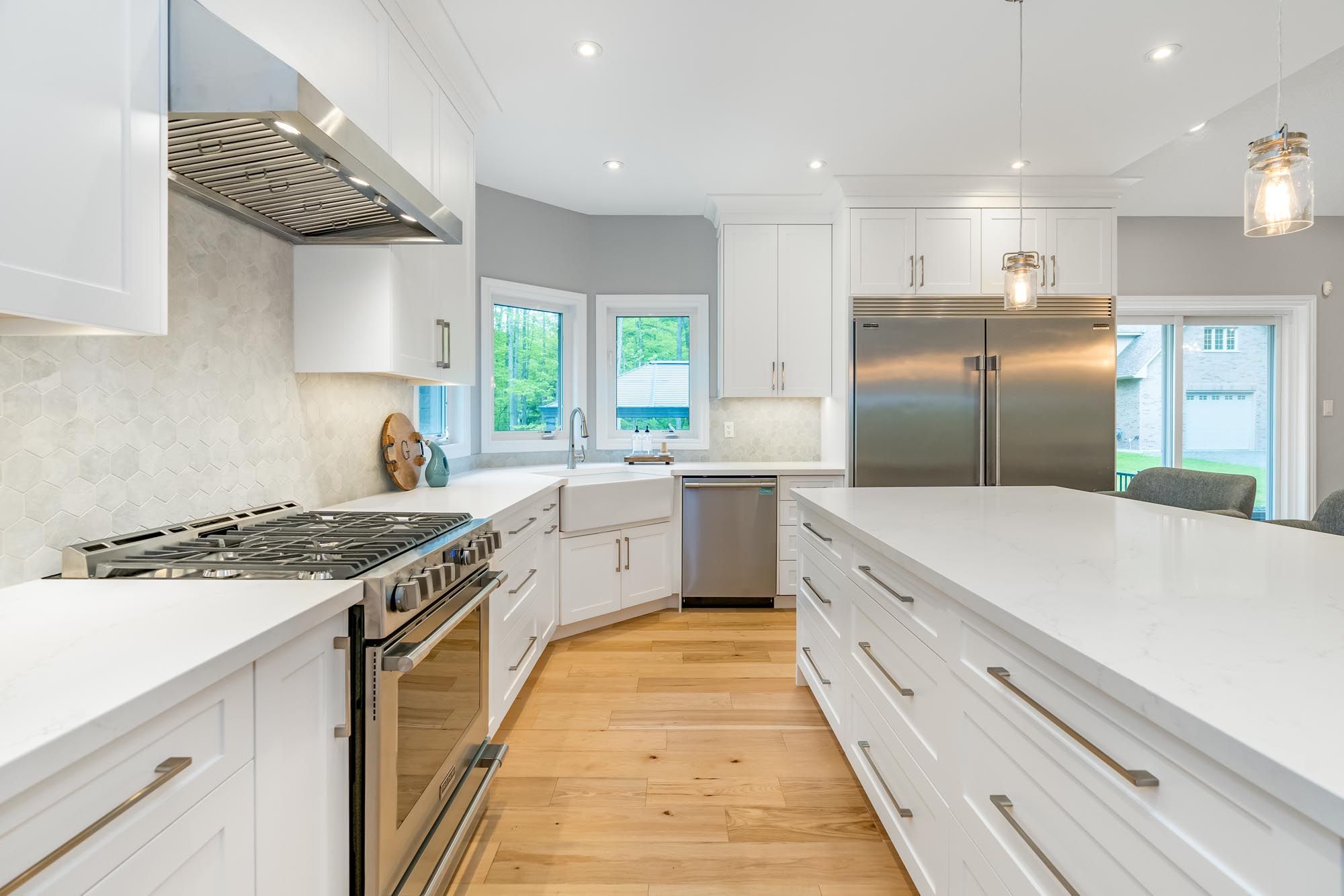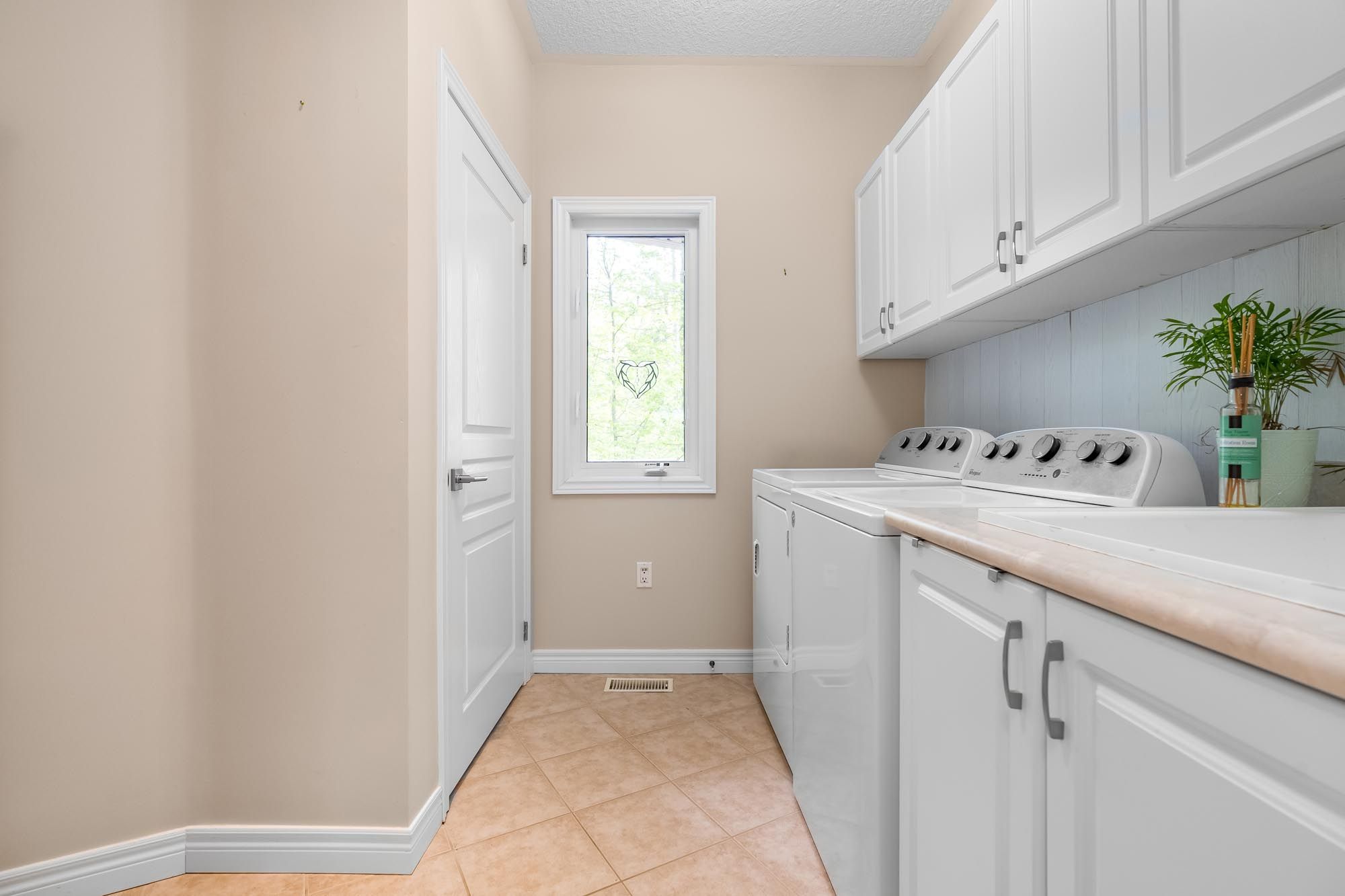 A rare opportunity offering two bungalows nestled upon a single property, alongside a triple car garage. Main level showcasing updated fooring throughout (2023), an updated kitchen adorned with quartz countertops, a brand-new gas stove and range hood, and an oversized centre island (2023). Hickory hardwood fooring leads into the grand dining room complete with a wood-burning freplace, and an open-concept living room with a soaring cathedral ceiling. Enjoy the fully fnished basement, offering a recreation room complete with a bar, an exercise room, an ofce space, a spacious bedroom, and a stunning bathroom. Potential for an in-law suite with the additional bungalow, with an eat-in kitchen, a living room, two bedrooms, and a full bathroom. Captivating curb appeal by custom driveway lamp posts and backyard oasis with an oval saltwater pool. Enticing 26'3” x 45'9" heated workshop with an oversized garage door and a loft. Added beneft of geothermal heating throughout the home