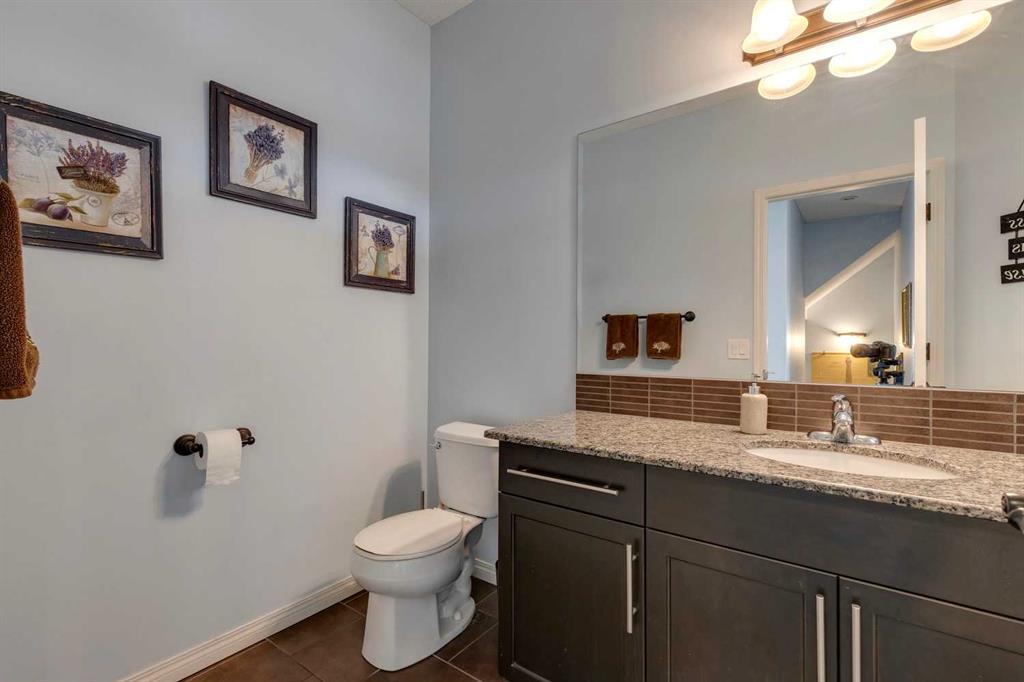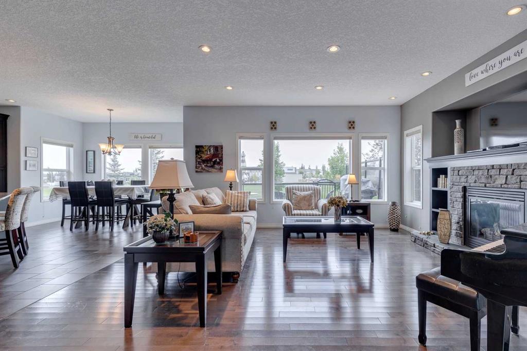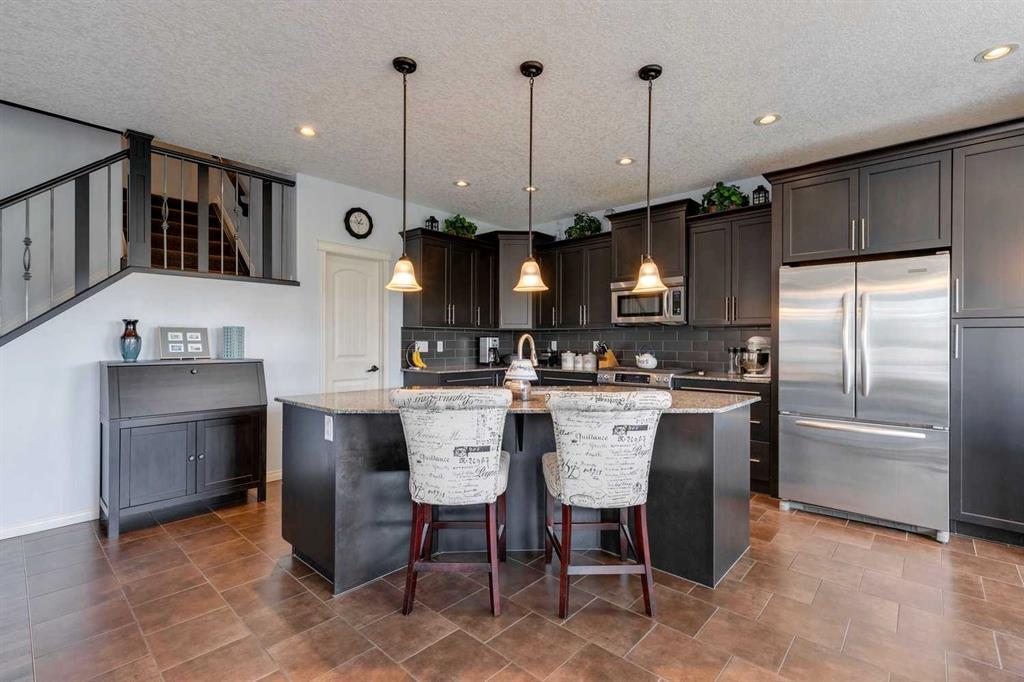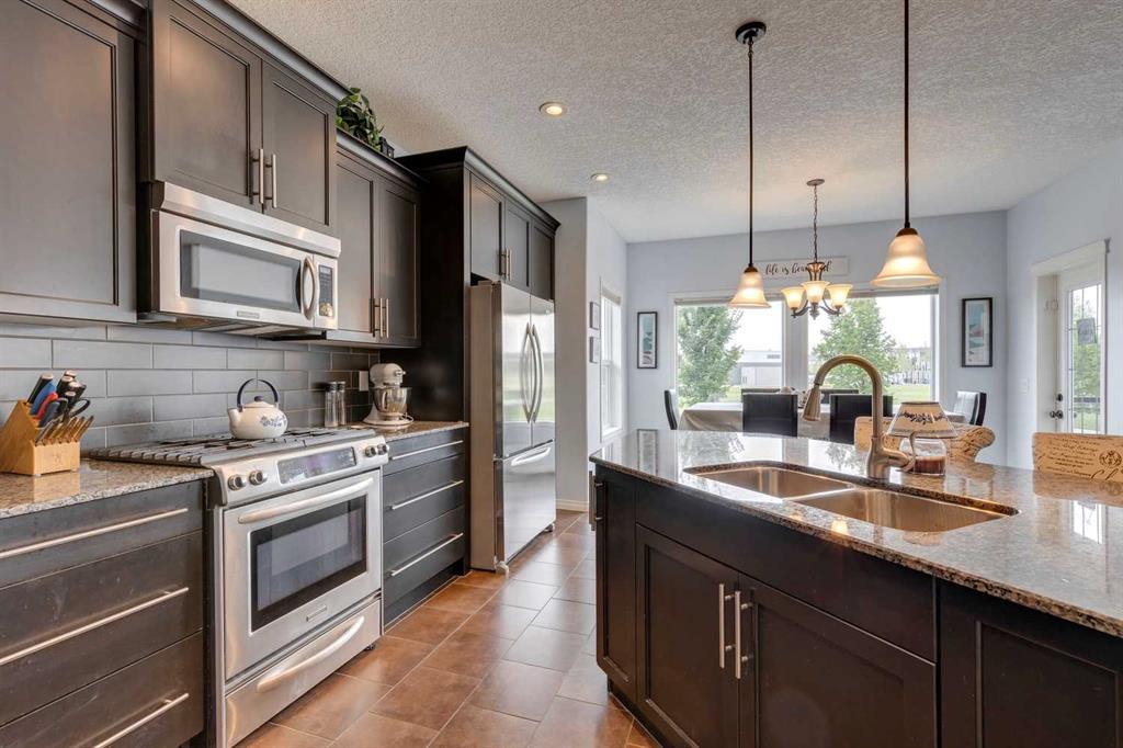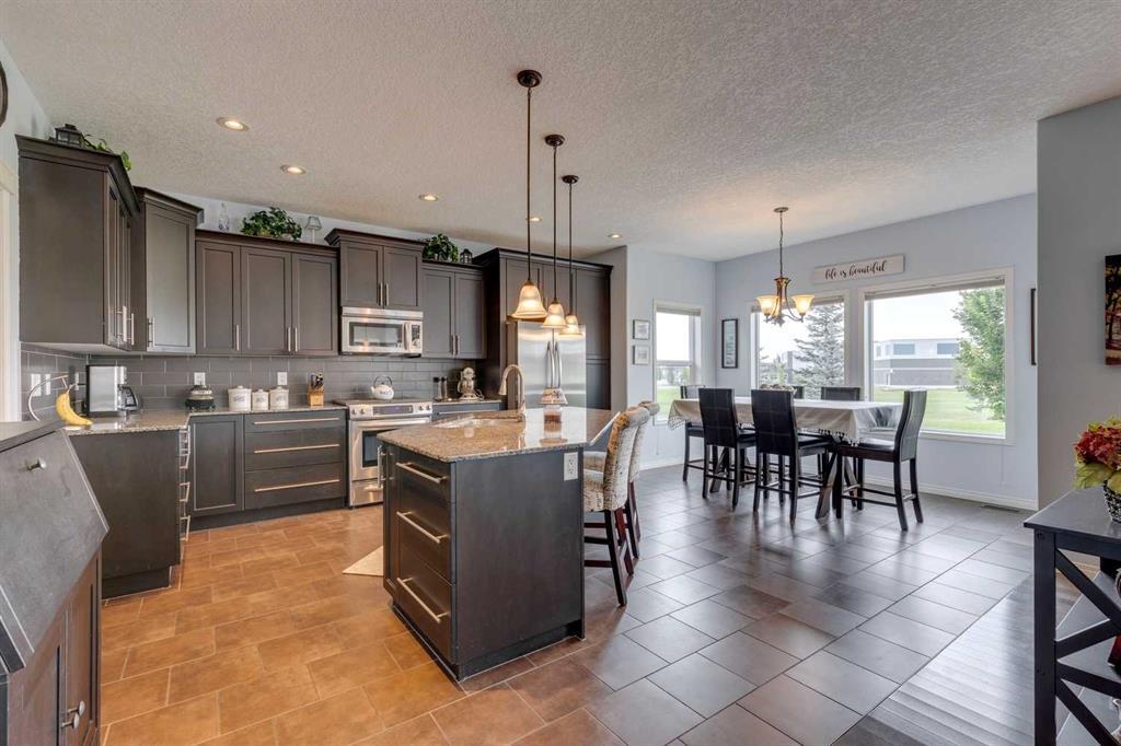 Large estate home with 5 bedrooms, 9' ceilings, infloor heat in the basement and garage, air conditioning and backing onto a greenspace......what more could you want!!! When you first enter the home you will love how open and bright it is! There is a large front entry with a built in bench to put your shoes on and a walk in closet. The living room is an ideal size for entertaining or the growing family with a gas fireplace with feature mantle. The kitchen offers an island, walk through pantry, granite, stainless steel appliances, large eating area and a breakfast bar (please note dishwasher sold in as is condition). Upstairs you have a large bonus room with vaulted ceilings, feature entertainment centre that stays and is very warm thanks to the heated garage floor. There is 4 large bedrooms upstairs and 2 full bathrooms with granite countertops. The basement has a large family room with a snack area with a sink, large bedroom with a cheater door to the 3pc bathroom and a huge den/hobby room. Good size backyard, vinyl deck with glass railings backing onto a green space. Garage is 19x23 with a heated floor, 8'main door, man door and insulation. (id:22211)