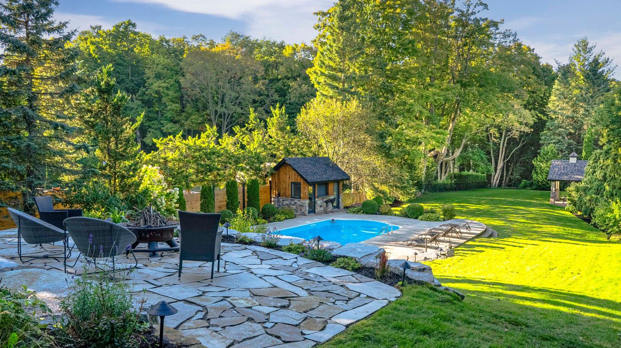 Nestled in a lush forest backdrop, this stunning property offers an enchanting blend of natural serenity and modern luxury. No need for a cottage. The expansive grounds boast ample space for large family gatherings or lavish entertainment w/sprawling lawns, pool/lounge area, cabana w/kitchenette and private courtyard. Oversized workshop can be converted into garden house/hobby space/home office. Spacious flagstone patio decks with firepit perfect for all fresco dining. Soaring vaulted ceilings throughout, custom finishes, 4798 sq ft above grade, 2030 sq ft below grade. Living room w/ flr-to-ceiling stone fireplace, 11+ ft ceilings. Chef's kitchen w/ 20+ ft ceiling heights, marble countertops and window wall overlooking upper rear grounds dining area. Loft recreation room overlooks kitchen/dining area. Separate Living Quarters/office area with kitchenette & 3 pc bath. Spacious primary bedroom retreat w/fireplace, 13+ ft ceilings, sitting area and 5 piece ensuite. Finished basement with game room and gym.Walking distance from Yonge St, w/ Aurora to the north, Richmond Hill to the south. You are surrounded by conservation for hiking, jogging, biking and water activities at nearby Lake Wilcox. Fantastic schools, St Andrew's/Anne's nearby.