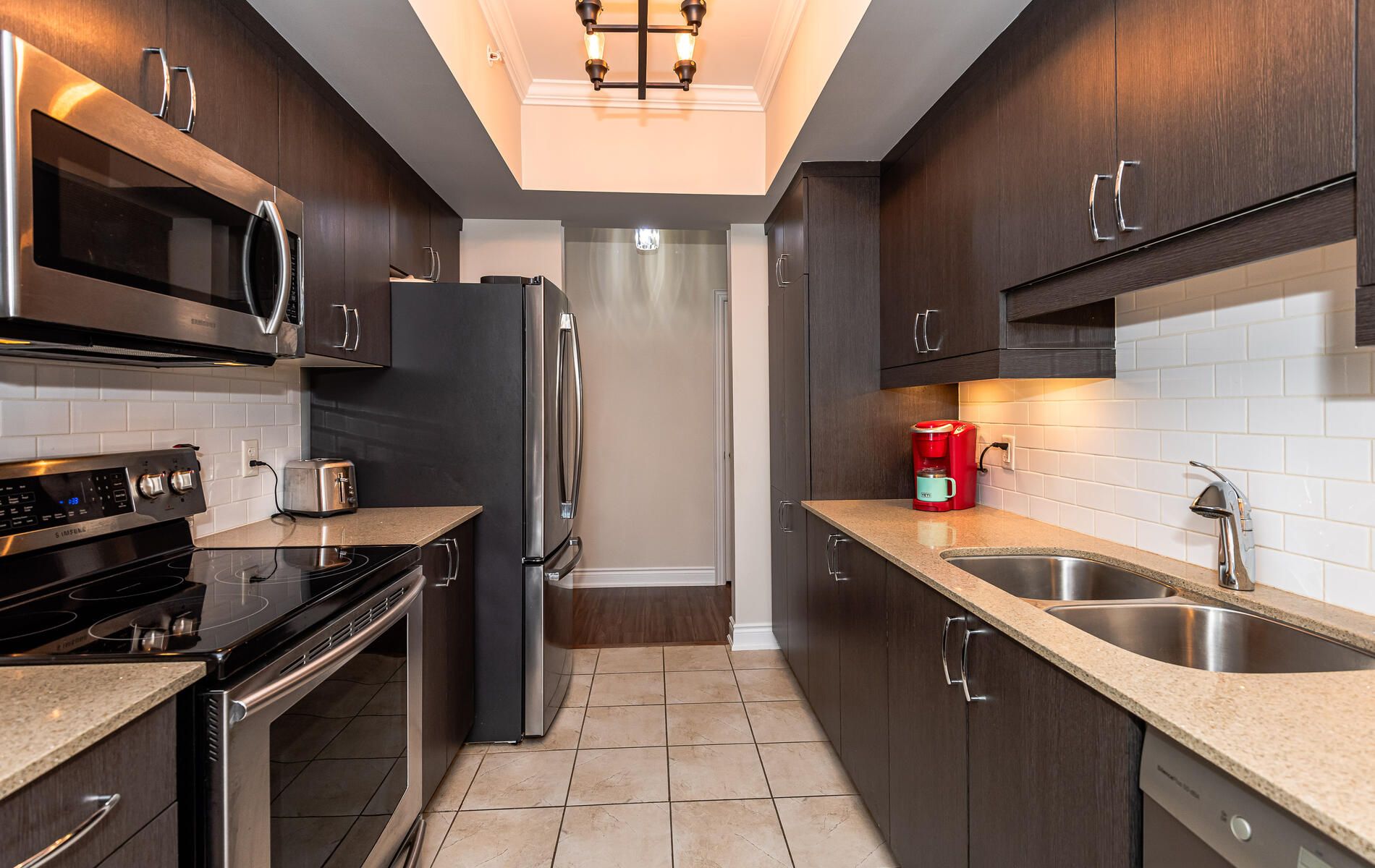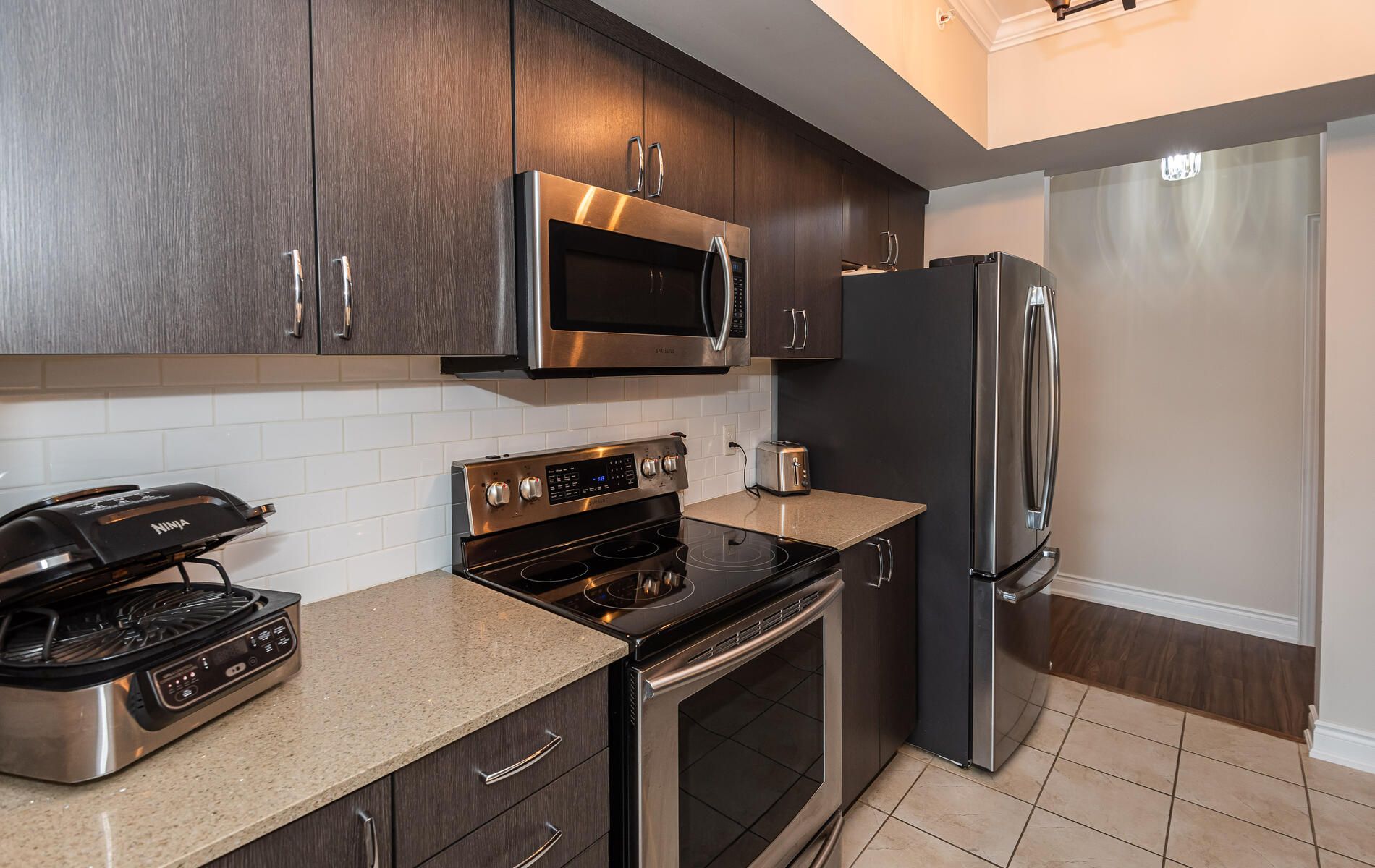 Spacious and bright sought after Yonge Station 3 bedroom, 2 bathroom condo with two parking spaces! Located in desirable south-end location steps to GO Station, schools, parks, trails, shopping, and restaurants. This immaculate unit offers excellent features including underground and surface parking spots, exclusive use locker, private ensuite laundry, and oversized balcony with glass railing. Spacious living room with walkout to balcony. Kitchen boasts quartz counters, pantry, s/s appl., under counter lighting and overlooks the dining area. Primary bedroom features a modern 3 piece ensuite with glass shower stall and his and hers closets.