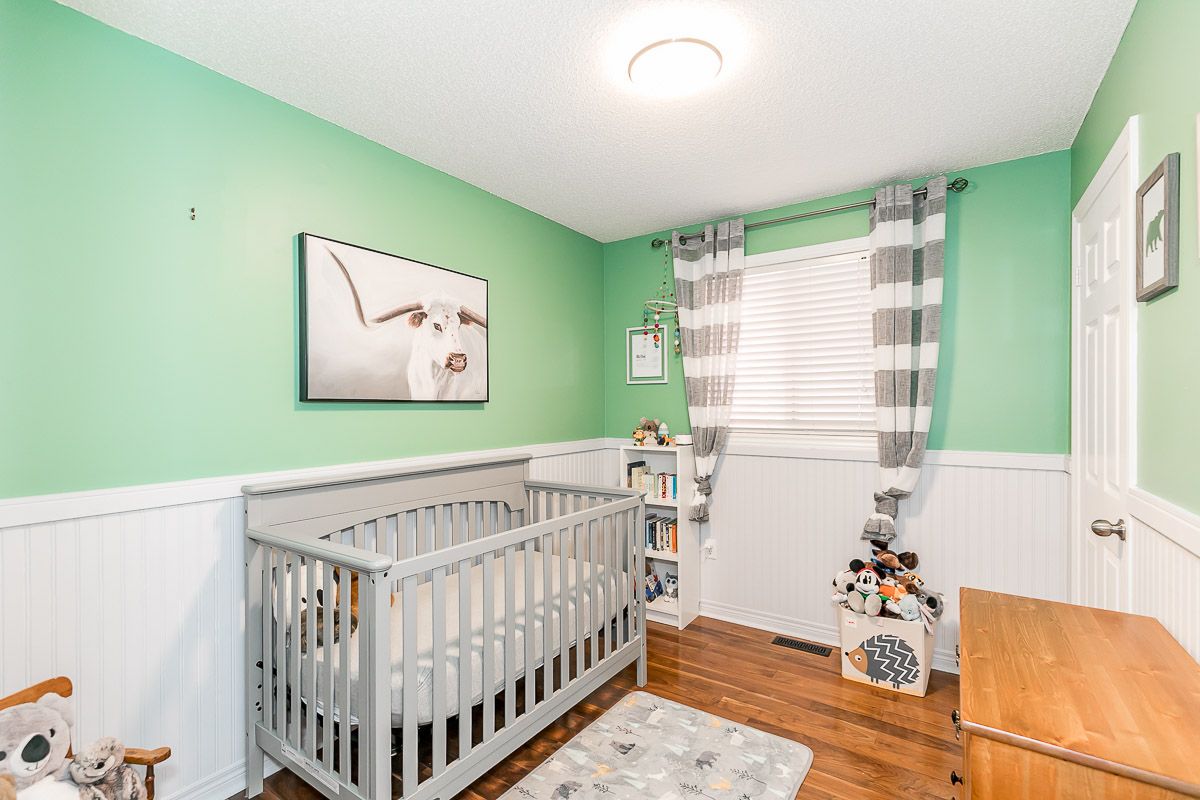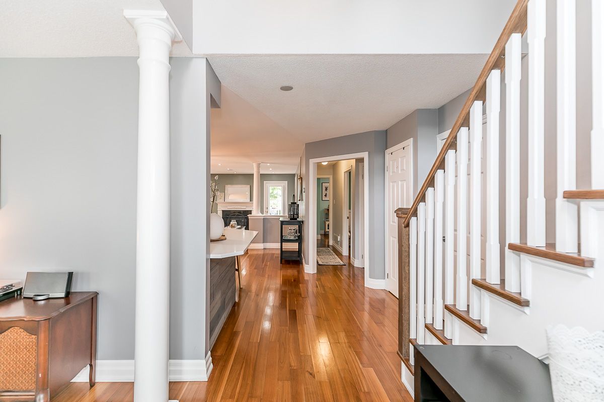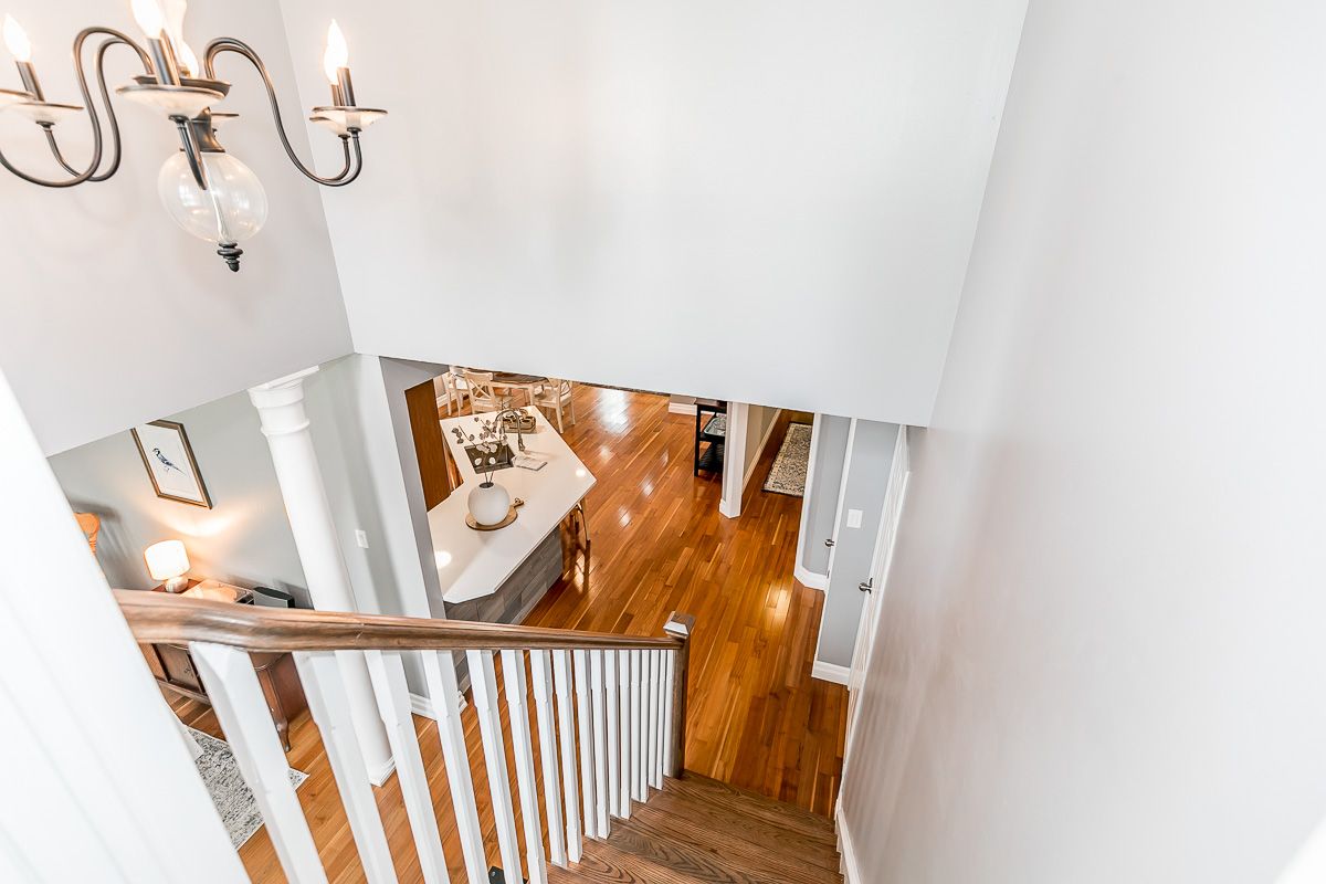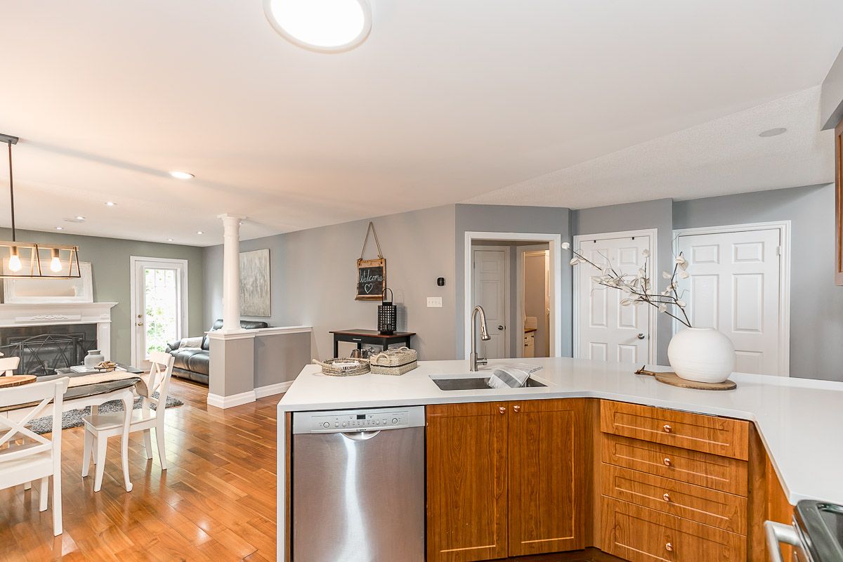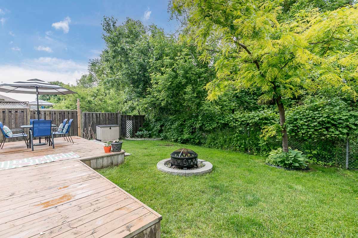 This recently updated family home is nestled in a sought after Painswick South neighbourhood. Backing onto Lovers Creek, close to schools, transit, shopping & hwy 400. Large open concept kitchen & family room w/ gas f.p., french doors stepping out to private deck & fully fenced ravine lot. Kitchen boasts new quartz waterfall countertop, s.s. appliances, & dinette large enough to seat 10! Two generously sized bedrooms on the main level are serviced by a 3 pcs updated bath. The second level wows w/ master suite complete w/ a 3 pcs ensuite & walk-in closet. The finished basement offers a large rec room, 2 pcs bath, laundry room & flex space complete w/ closets which can be used for a den or 4th bedroom. Features include: hardwood floors, updated kitchen & bathrooms, lighting, gas fireplace, fully fenced ravine lot, glass shower in ensuite, washer/dryer 2022.