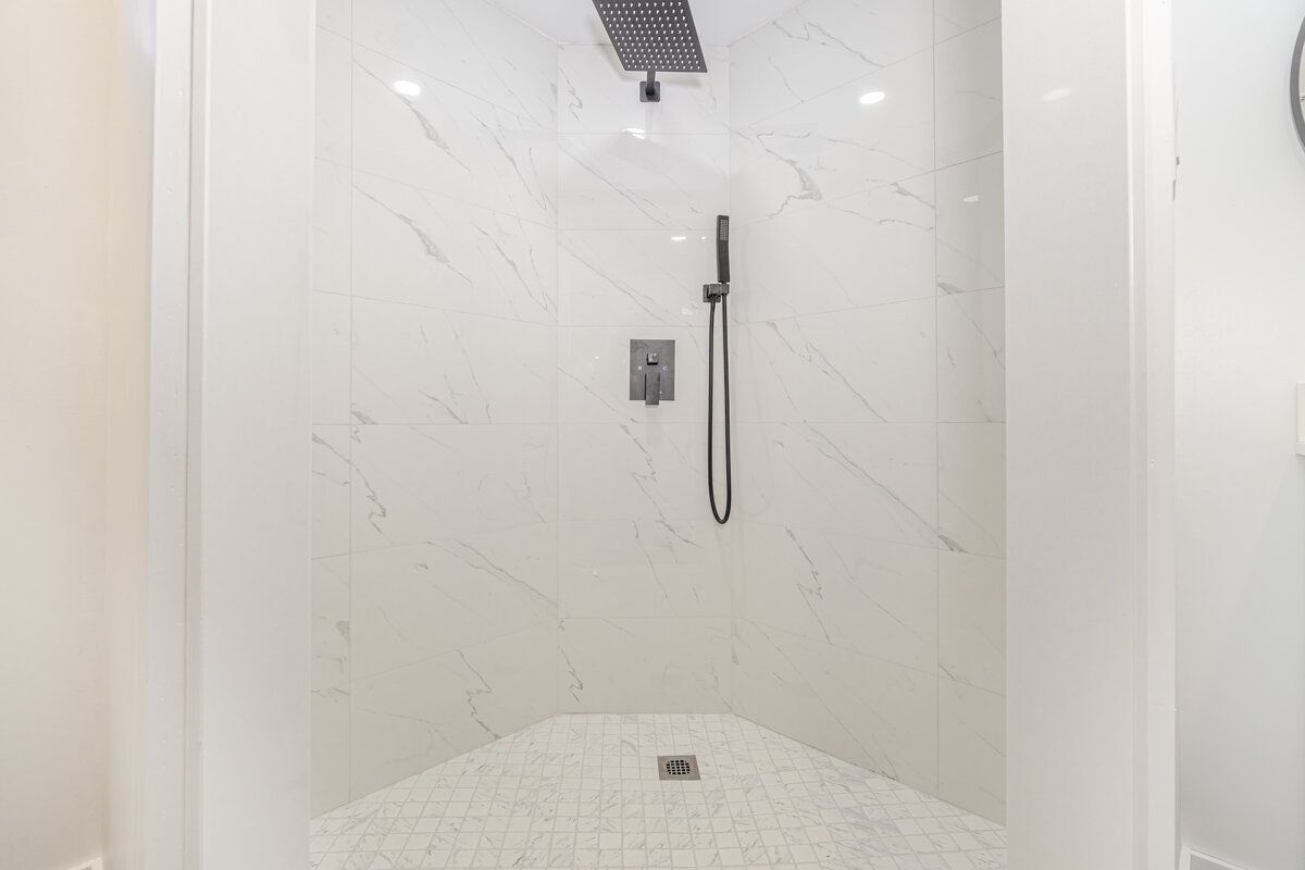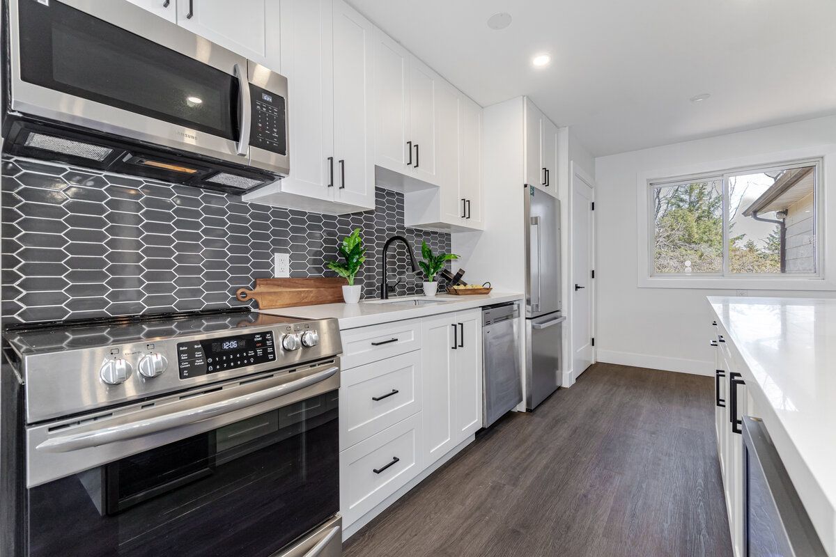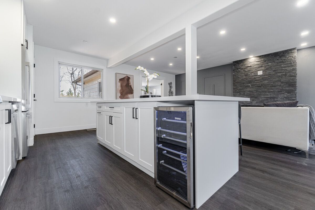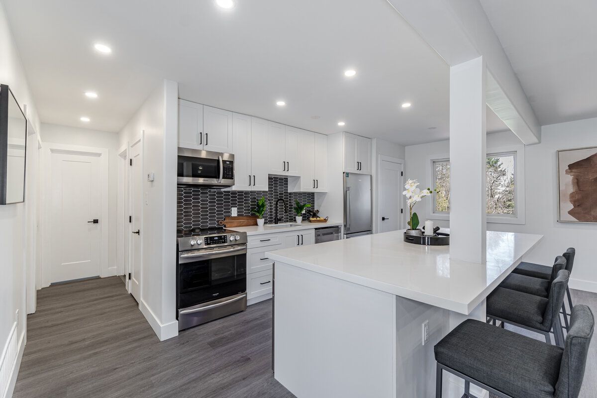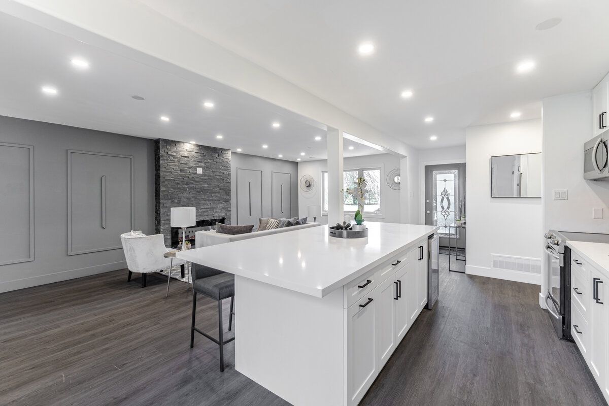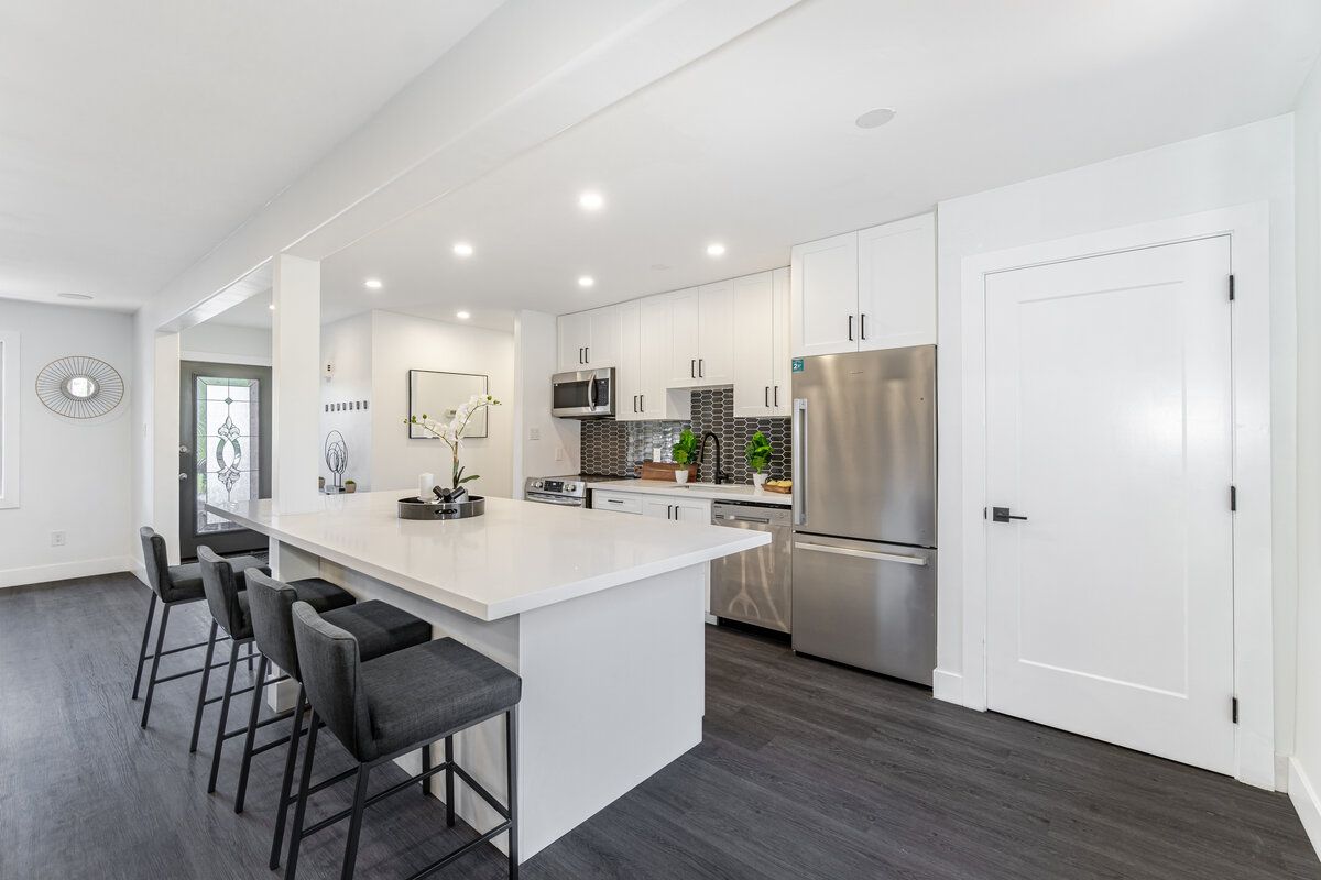 1) A gigantic entertainer’s kitchen: A majestic ivory-white quartz island tying a modernized kitchen with new, sleek appliances.