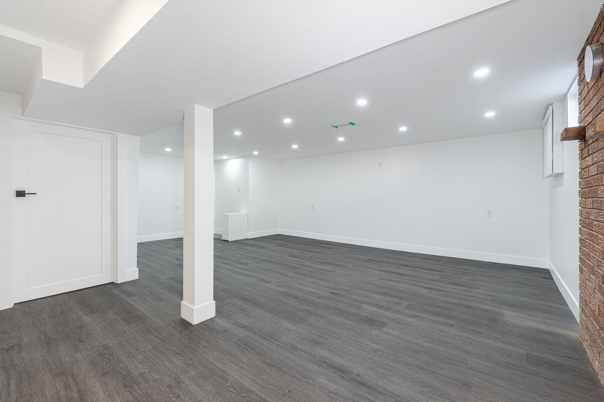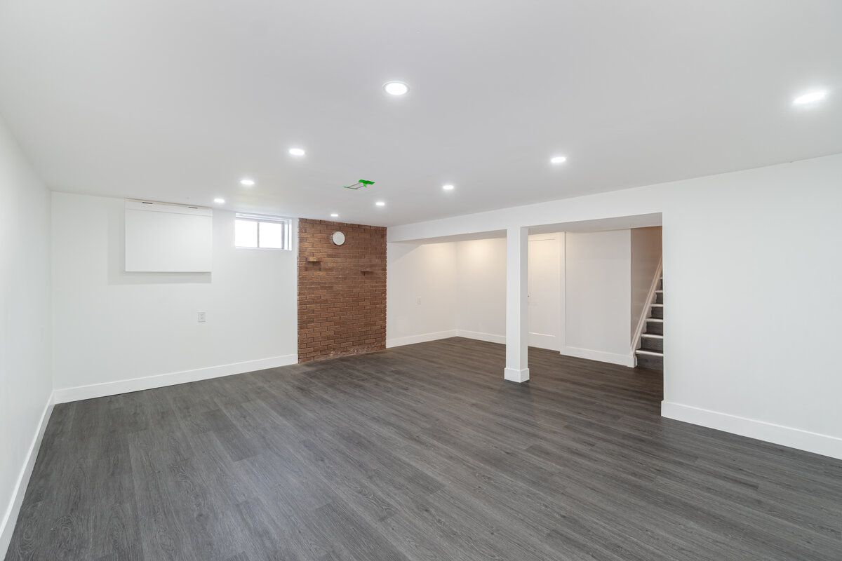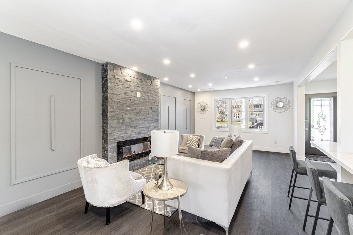 2) The floor-to-ceiling brick fireplace centered on a customized grey accent wall, bringing pizzazz to the family room. Ideal for entertaining or personal inspiration.