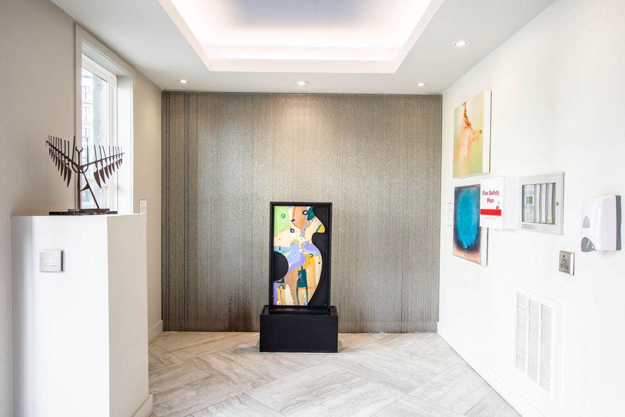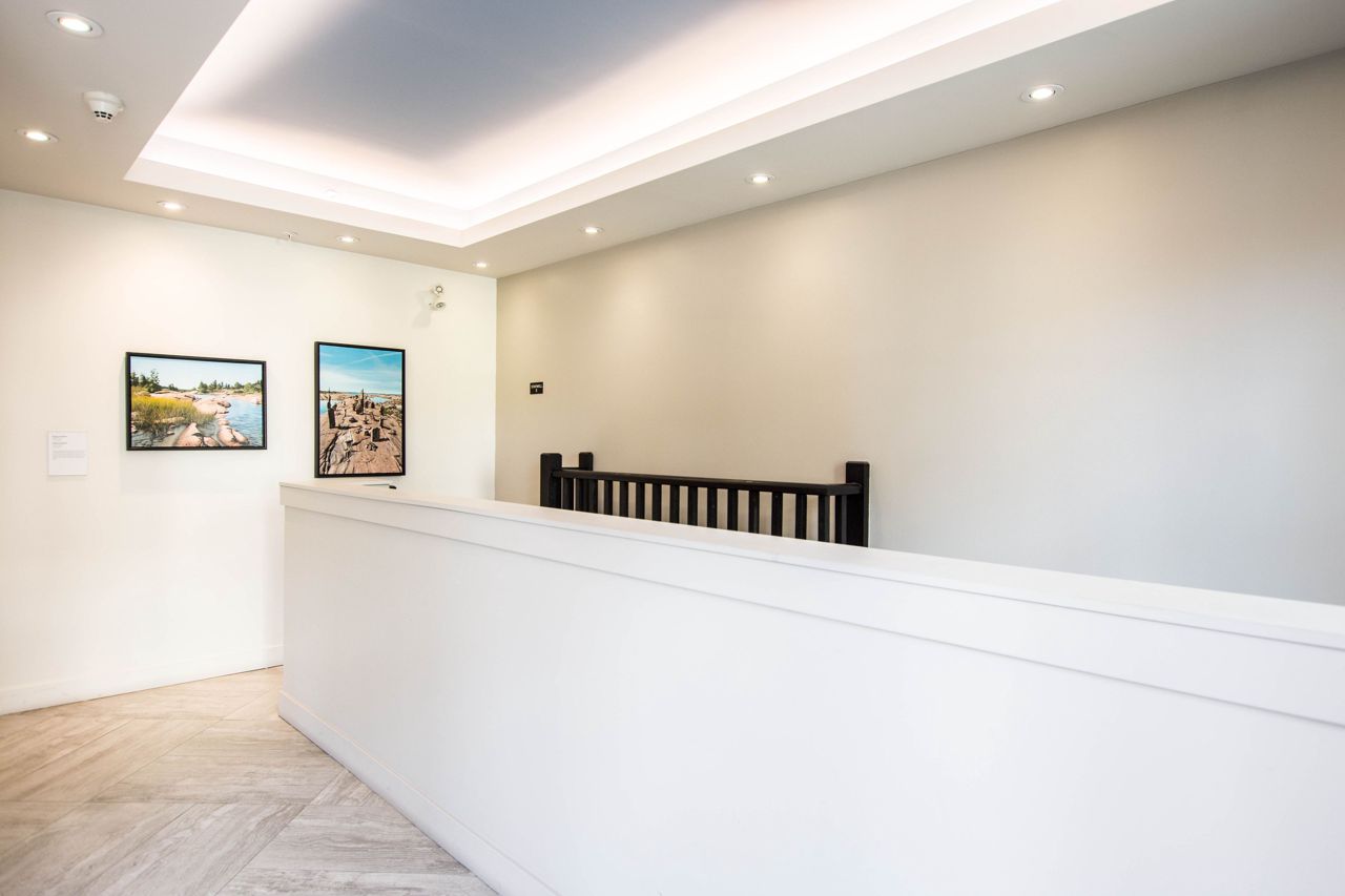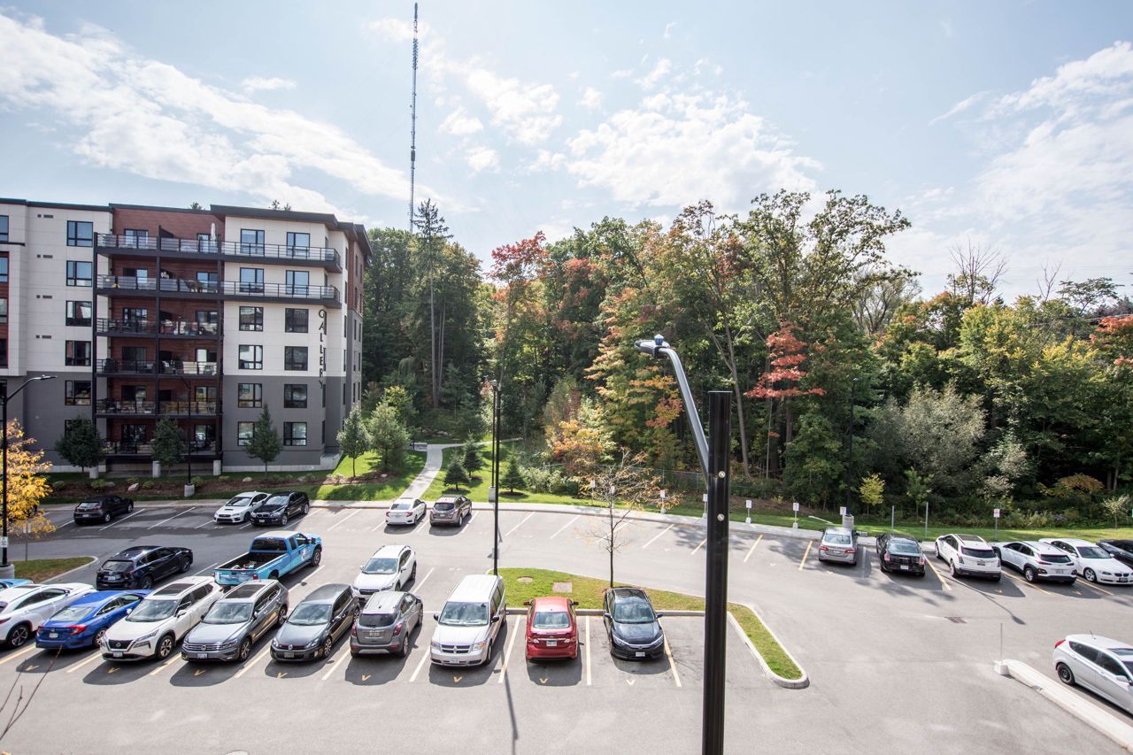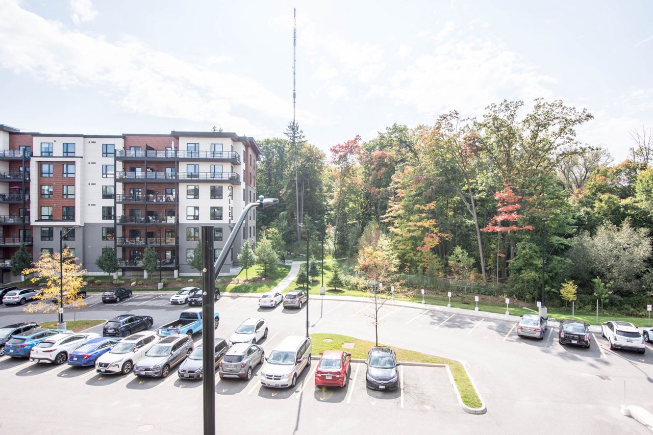 Welcome to “The Gallery”, landmark art themed condominium surrounded by 18 acres of mature forest, trails and lookouts. Convenient location is ideal. Easy access to 400 Highway for commuters. Public transit stop for Crosstown bus from Mapleview/Park Place to Downtown and RVH is right out front. Rare two deeded parking spots ( 1 indoor & 1 outdoor). Stainless steel appliances & quartz counter tops. Spacious living area with walkout to oversized balcony looking out onto forested area. Generous sleeping area with large closet. Fresh paint and new flooring in the living room and bedroom areas. Move in ready!