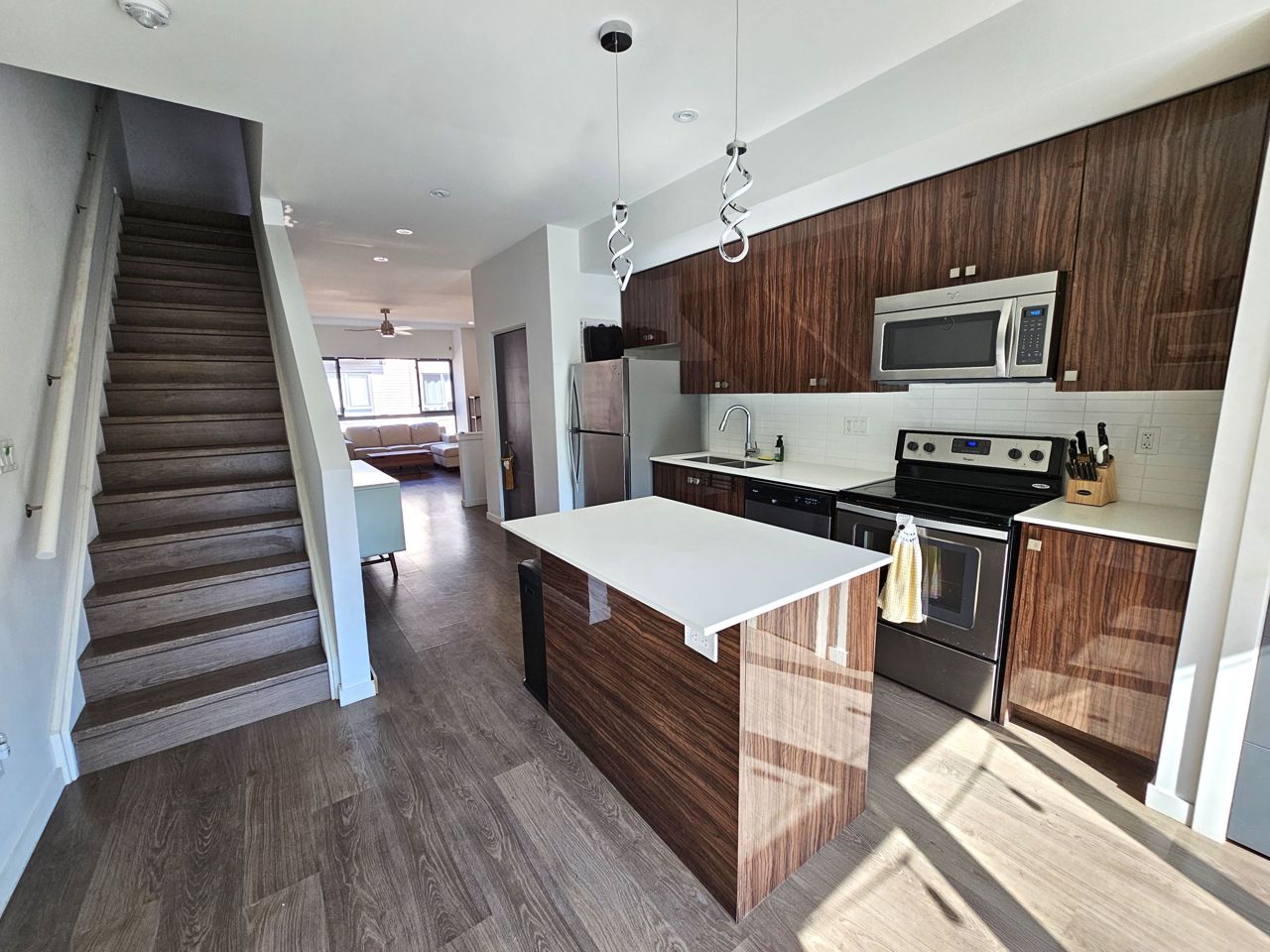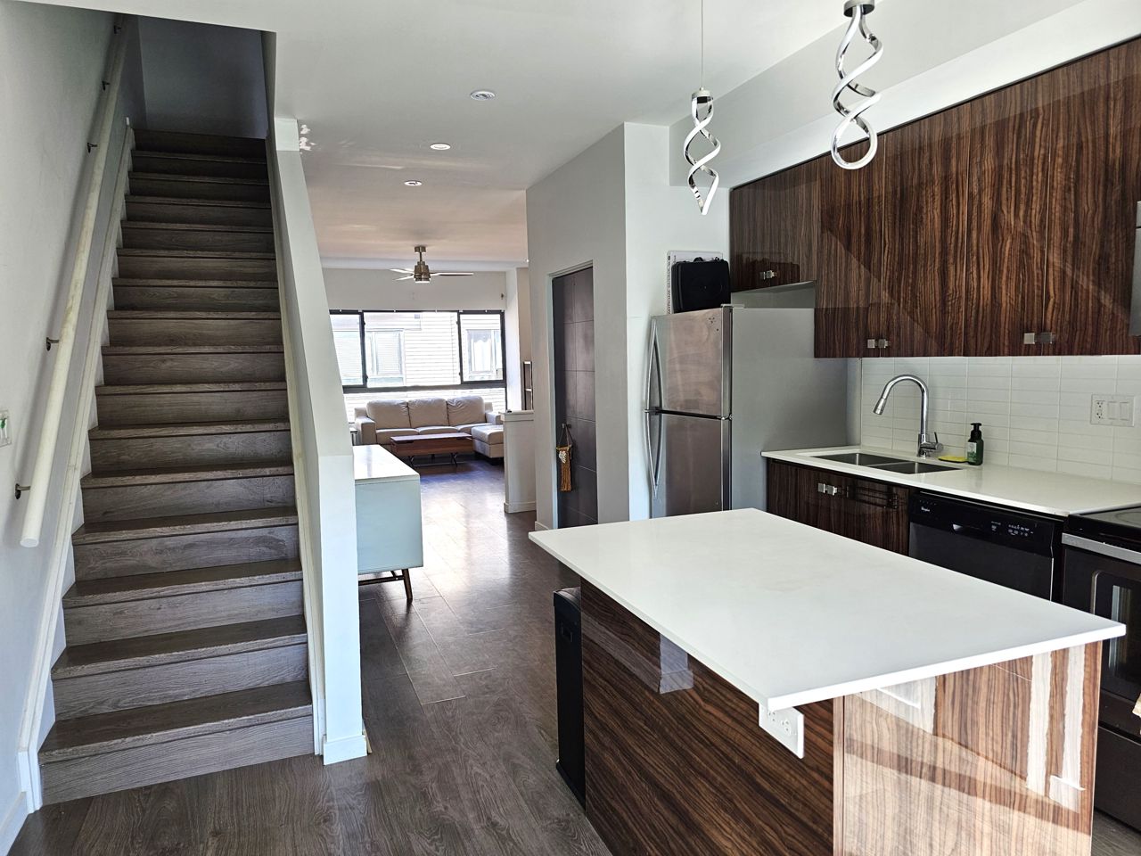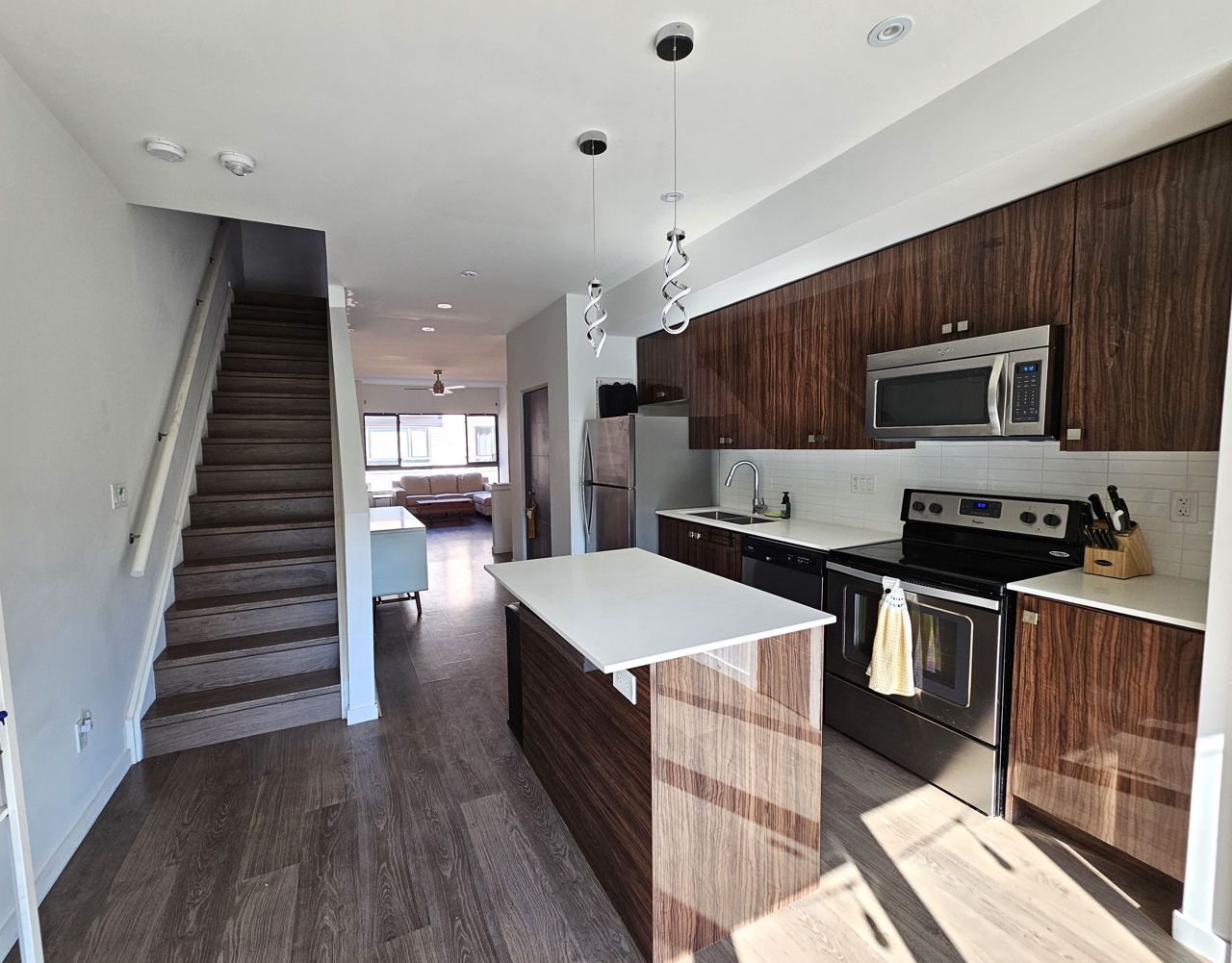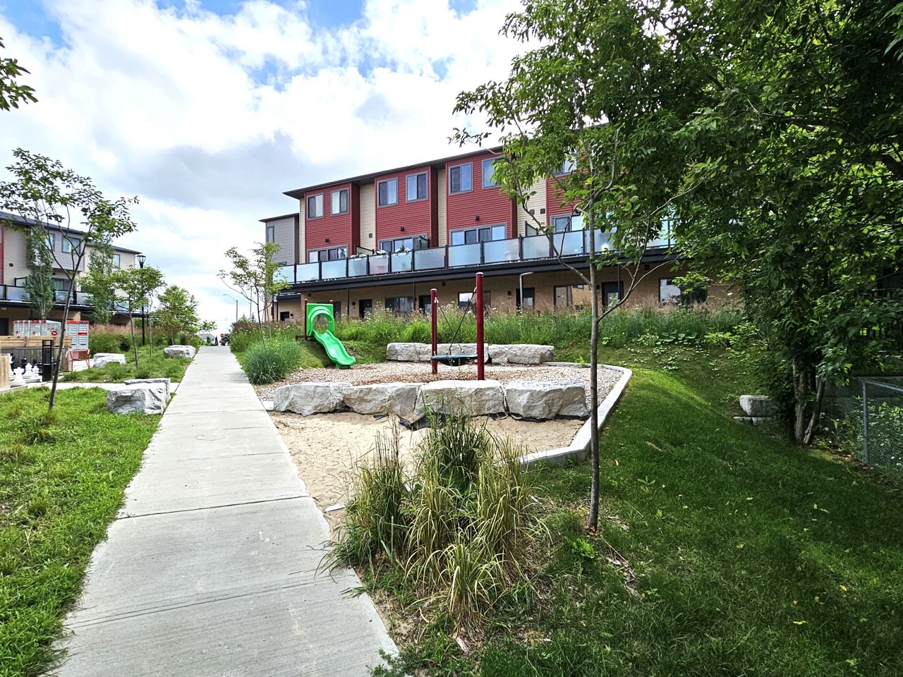 First time home buyers and Investors! Don’t miss an opportunity to own this modern 3-storey townhouse with hard to find 2 car garage with inside entry from main level sitting room. Energy efficient home with tankless hot water heater, Ecobee thermostat, cell phone charge ports, fibre optic Tech.Cam. Upgrades including kitchen Quartz countertops & central island, stainless steel appliances, pot lights. Extra storage closet. NO carpet. 3 bedroom & 2+1 bath. Upgraded primary ensuite with walk in glass shower. Second floor open concept with sliding door to the balcony overlooking trees and common area with garden and canopy set up. Large windows & 9’ ceilings make this home bright and spacious. Total finished area 1,500 SqFt. Easy access to HWY 400 and shopping.