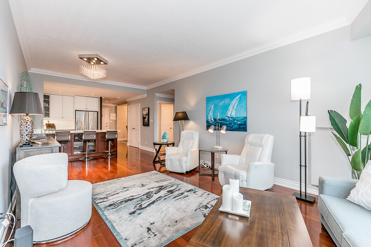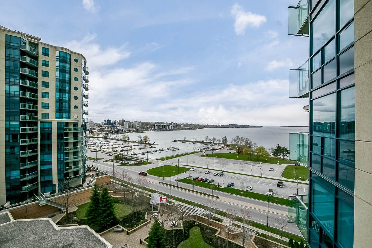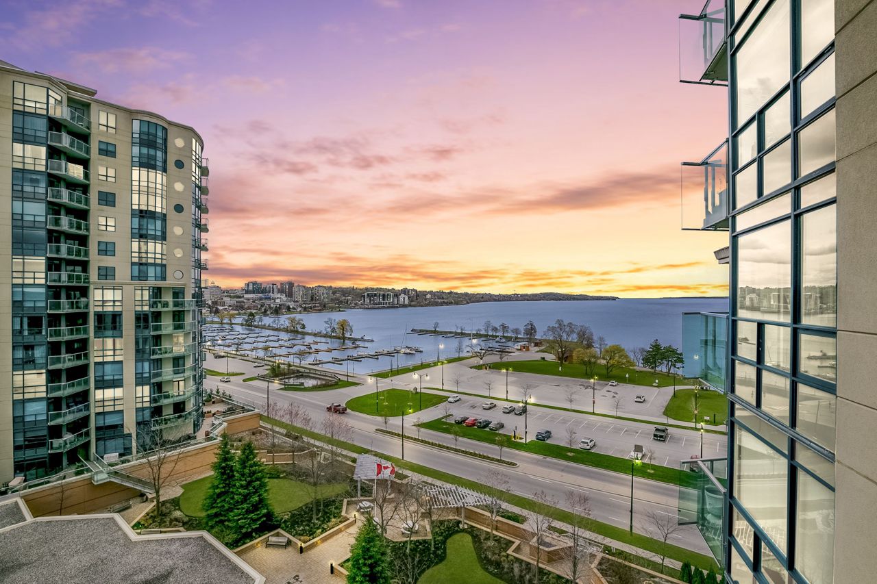 Barrie Condo Corner Presents - Stunning 2 bedroom + den, 2 bath condo in Barrie's Nautica Condominiums. This 1381 square foot condo features a modern chef's kitchen, hardwood floors, crown molding, pot lighting, large windows with lots of natural light. Upgraded kitchen with breakfast bar, granite countertop, tiled backsplash, High end Jenn-air stainless steel stove & refrigerator, under-mount lighting, deep double sinks & oversized double pantry. Walkout onto balcony with gorgeous water & city view. Master bedroom - his/hers walk-in closets with built-in