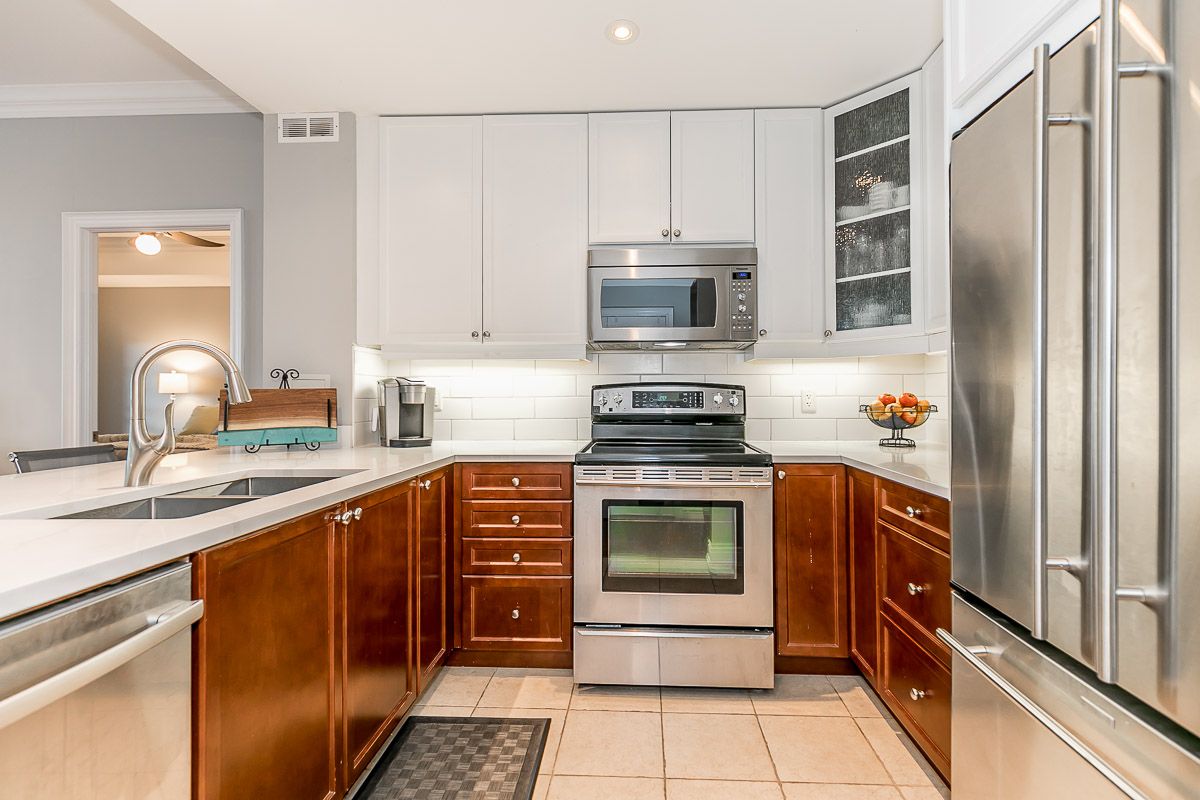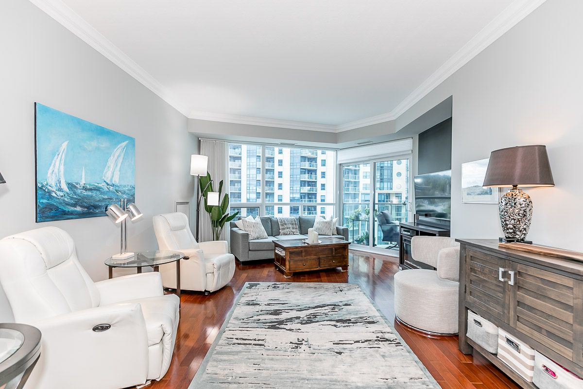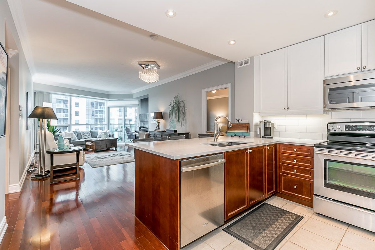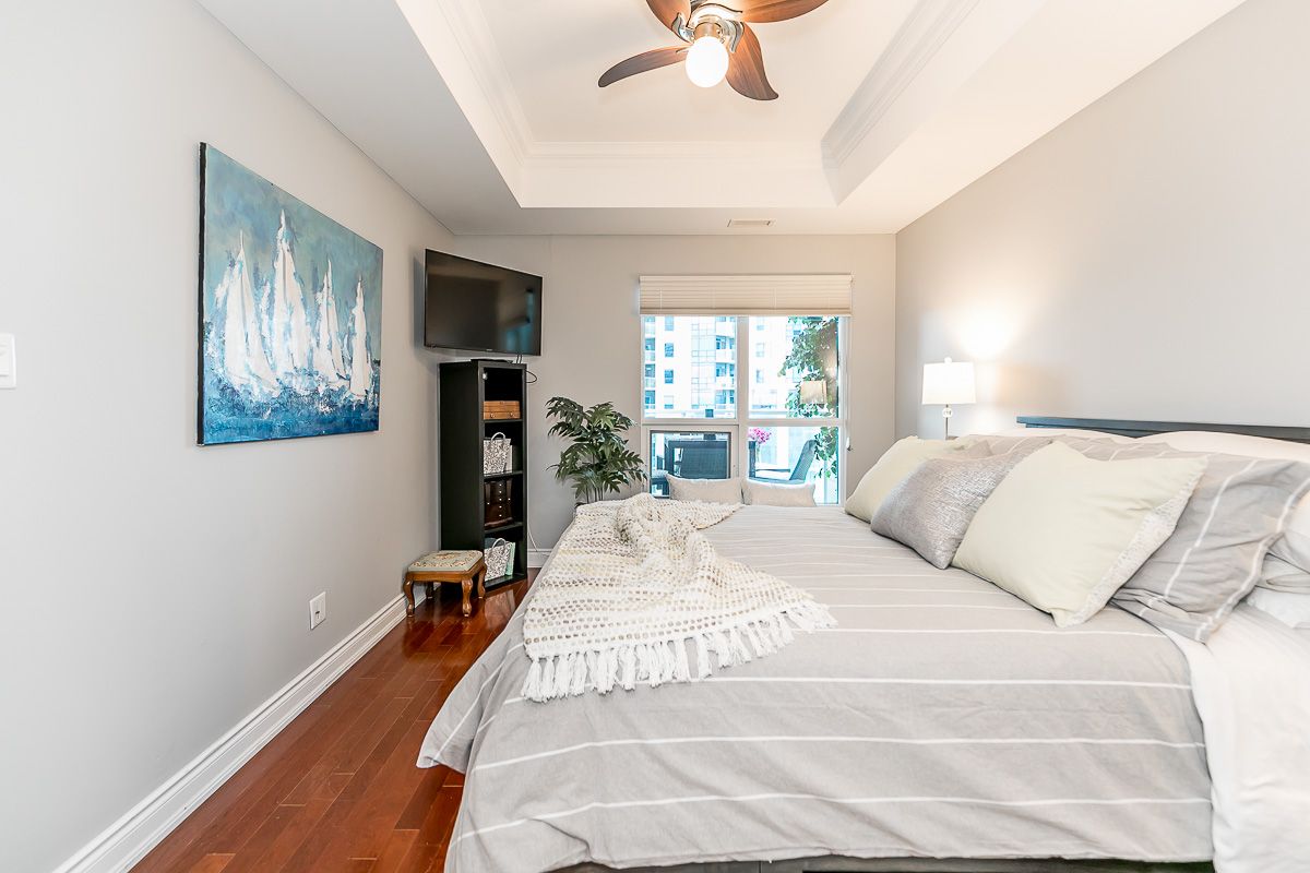 Barrie Condo Corner Presents - Stunning 2 bedroom + den, 2 bath condo in Barrie's Nautica Condominiums. This 1381 square foot condo features a modern chef's kitchen, hardwood floors, crown molding, pot lighting, large windows with lots of natural light. Upgraded kitchen with breakfast bar, granite countertop, tiled backsplash, High end Jenn-air stainless steel stove & refrigerator, under-mount lighting, deep double sinks & oversized double pantry. Walkout onto balcony with gorgeous water & city view. Master bedroom - his/hers walk-in closets with built-in