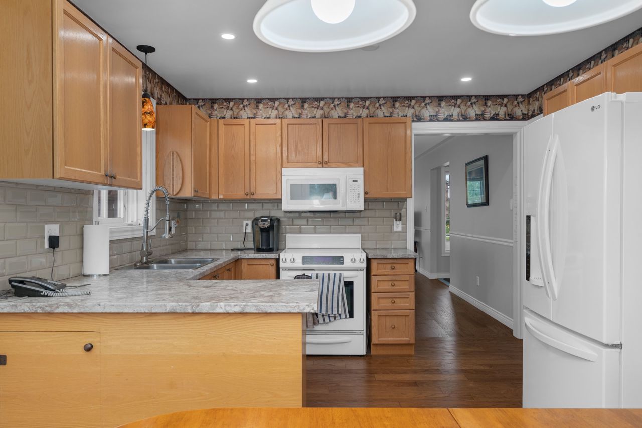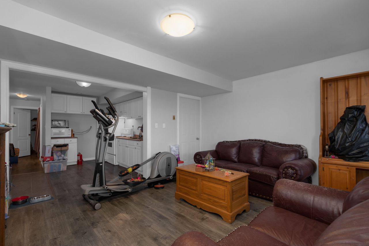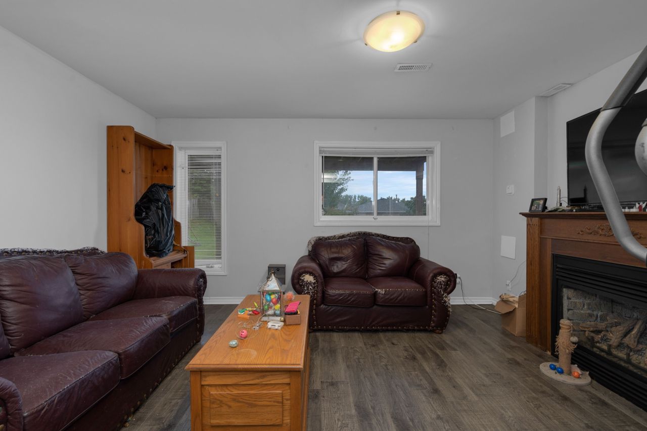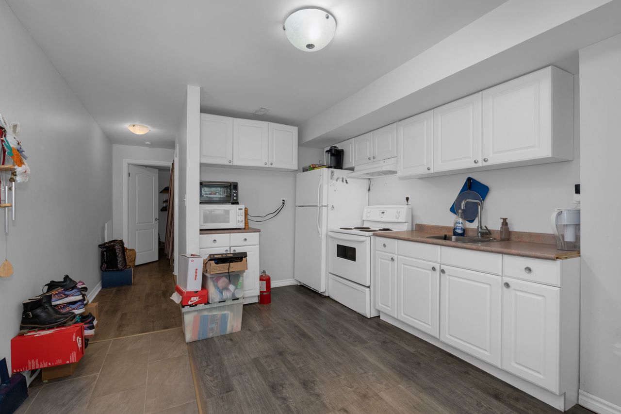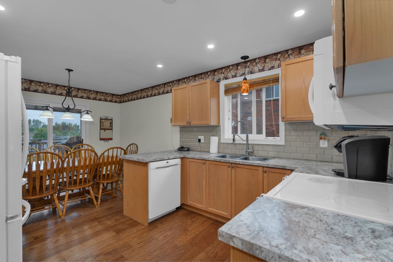 All brick over 3200 square foot ranch bungalow with 3 kitchens perfect for extended family or to rent out to supplement your monthly bills! Main floor boasts engineered hardwood flooring, painted 2023, two living areas and spacious kitchen with subway backsplash, new counters, pot lighting and crisp white appliances. The massive covered back deck is perfect for taking in the miles of scenic views. Back inside and down the hall you are greeted with double doors to the oversized primary bedroom with huge walk-in closet and 4 piece ensuite Two other bedrooms plus full bathroom round out this level. Downstairs past the shared laundry you can access the home via the inside garage entrance to basement or via the walk-out basement. The two one bedroom apartments are both spacious and drenched with natural sunlight and completely separate. Extra insulation between floors and walls, safe and sound insulation is perfect for noise dampening and all plumbing is plastic.New counter in bedroom ensuite and bedroom carpet (2022). Play-set can stay or go.