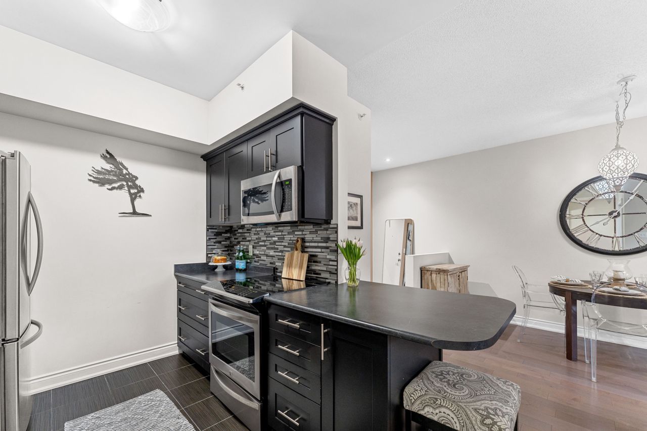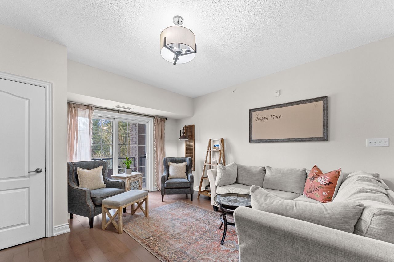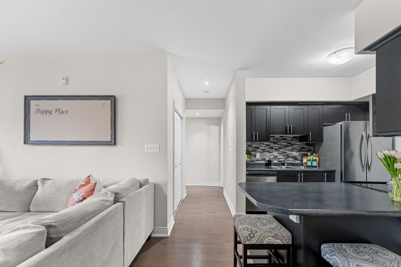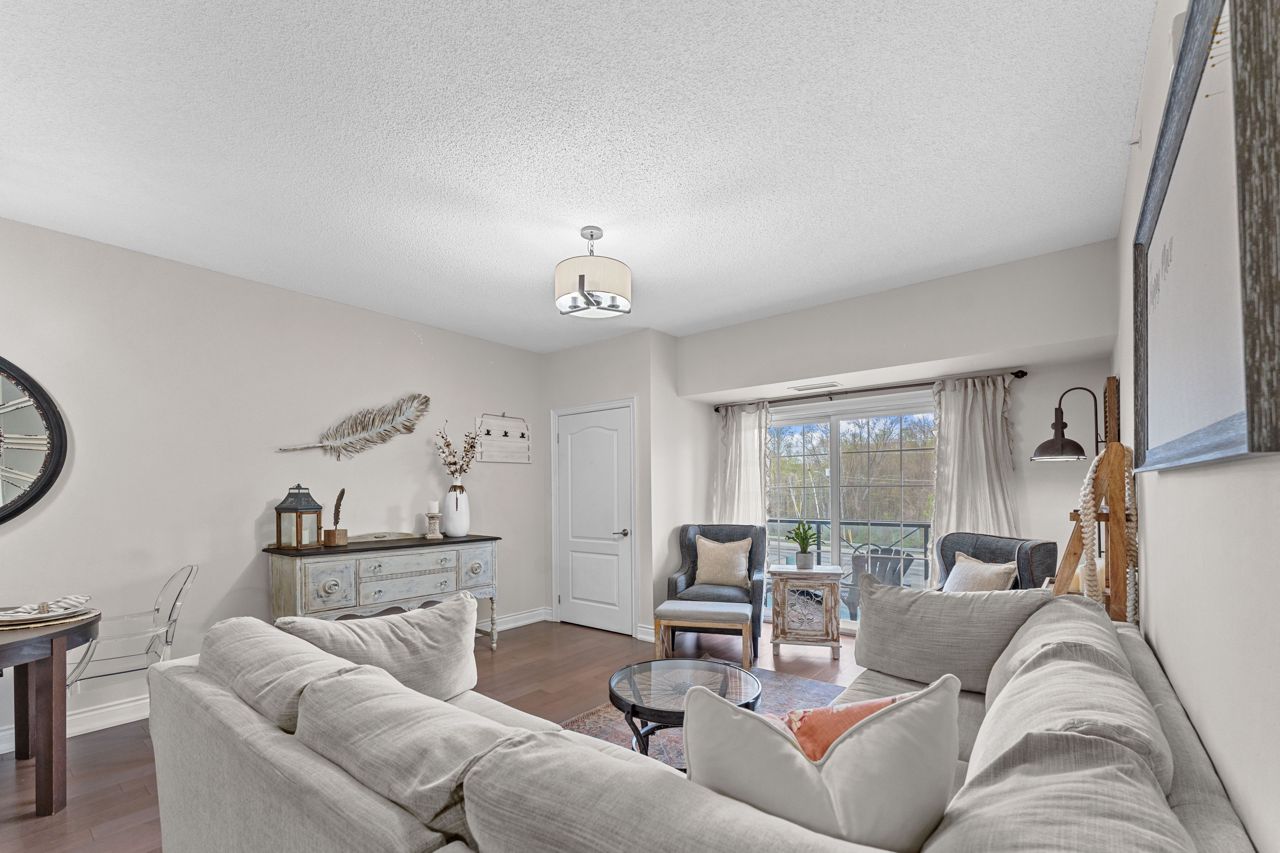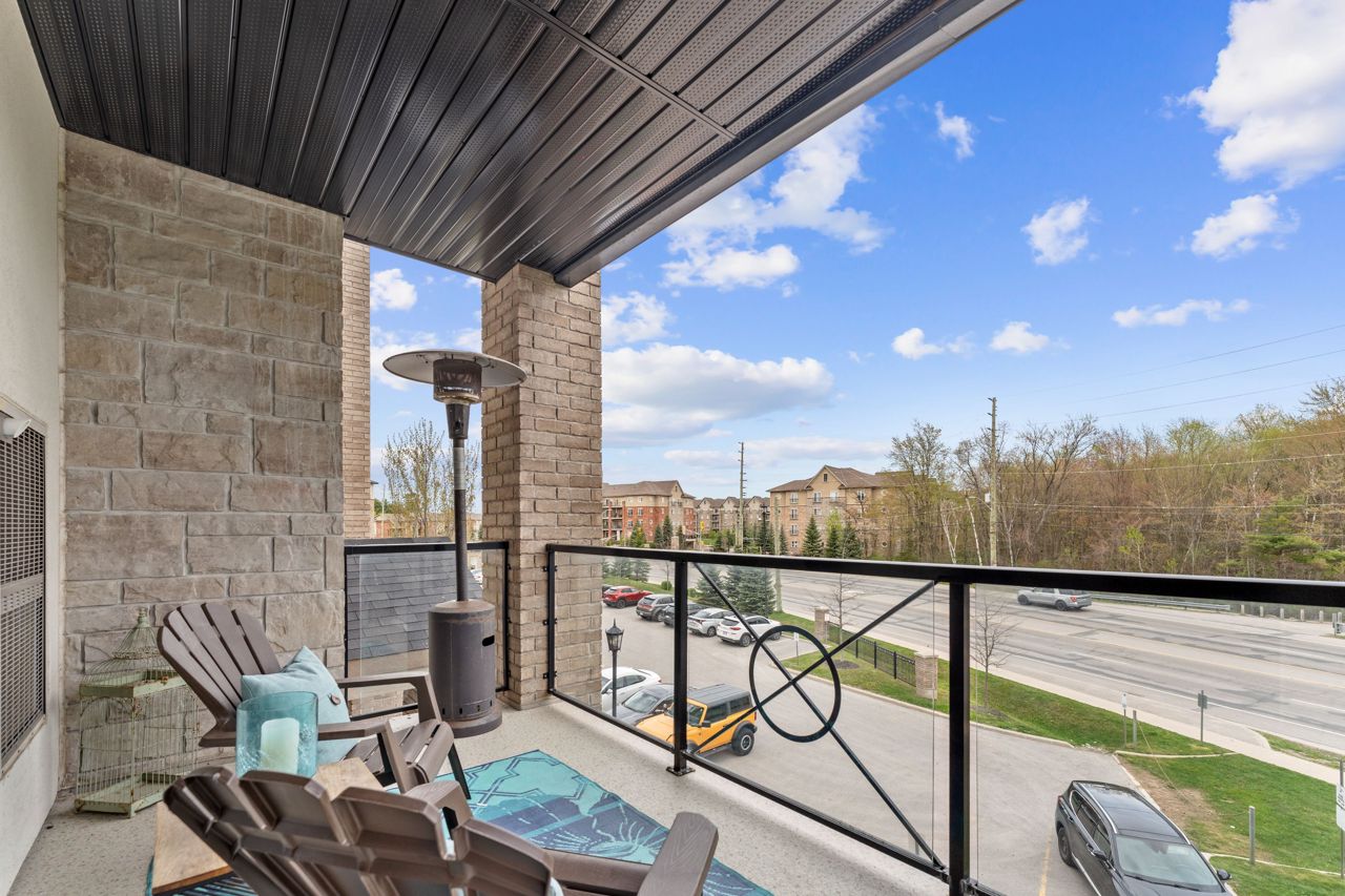 Stunning 2 bedroom unit in sought-after location *bright open concept floorplan* large underground parking spot w/ convenient storage locker attached. Private balcony w/ view of Bear Creek Conservation. Wonderful location close to 400, GO, shopping, downtown amenities incl restaurants/pubs, beaches/Lakeshore. Just steps to multiple walking trails including Bear Creek.Fully upgraded with 9' ceilings, engineered hardwood/porcelain tile (no carpet), stainless steel appliances, full sized ensuite laundry, custom lighting and window coverings