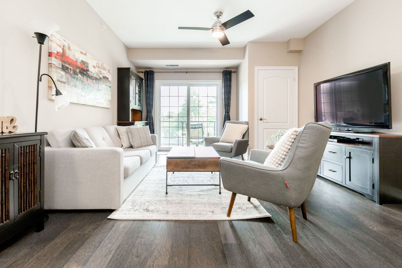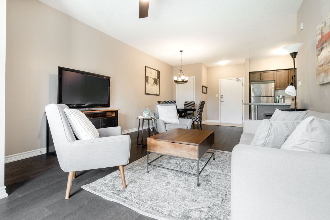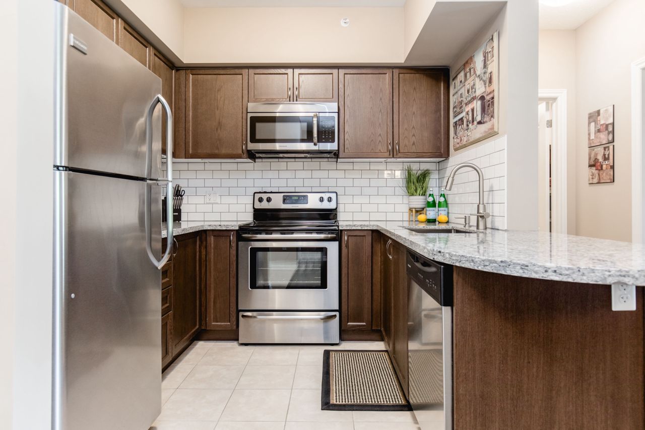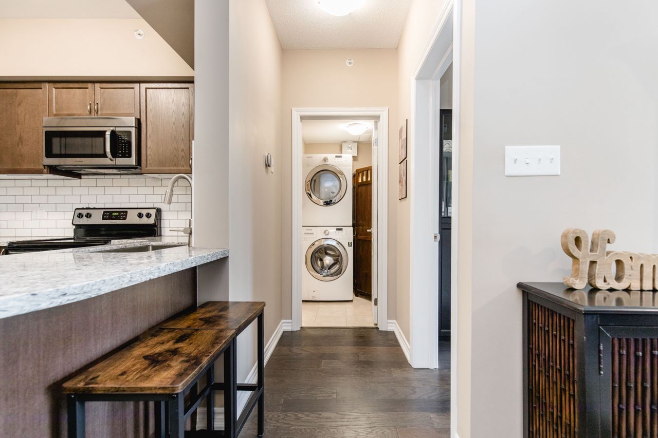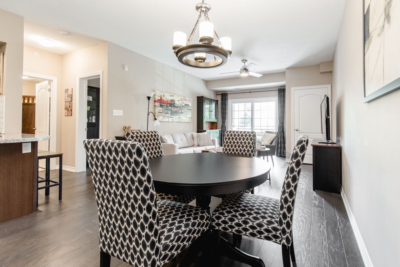 The location of the condo offers easy access to Barrie's downtown area, waterfront, shopping centers, the GoTrain station, and Highway 400, making it convenient to enjoy various amenities and commute to different destinations. The 1-bedroom condo boasts an open layout, where the kitchen, living, and dining areas seamlessly blend together, creating a spacious and inviting atmosphere. The kitchen is equipped with stainless steel appliances, including a Built-in microwave, Under cabinet lighting, Stone Counter Tops and a Double under-mounted sink. The sizable balcony is accessible from the living/dining area. With an east-facing orientation, the balcony receives ample morning sunlight. Hardwood floors grace the living area and bedroom, adding a touch of elegance to the overall design. n-unit laundry facility. In terms of parking, the suite includes an exclusively owned parking space, which is located underground. Additionally, there is ample guest parking and rental spaces