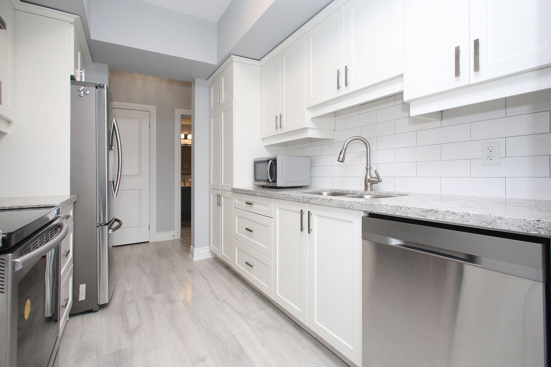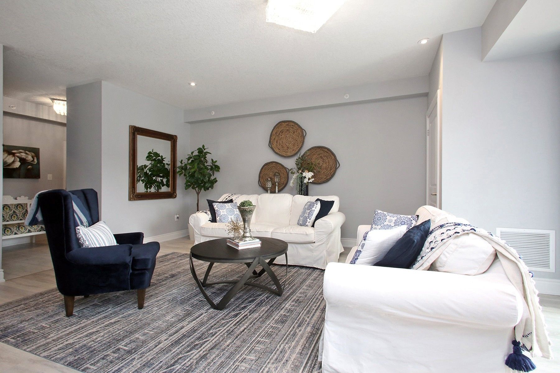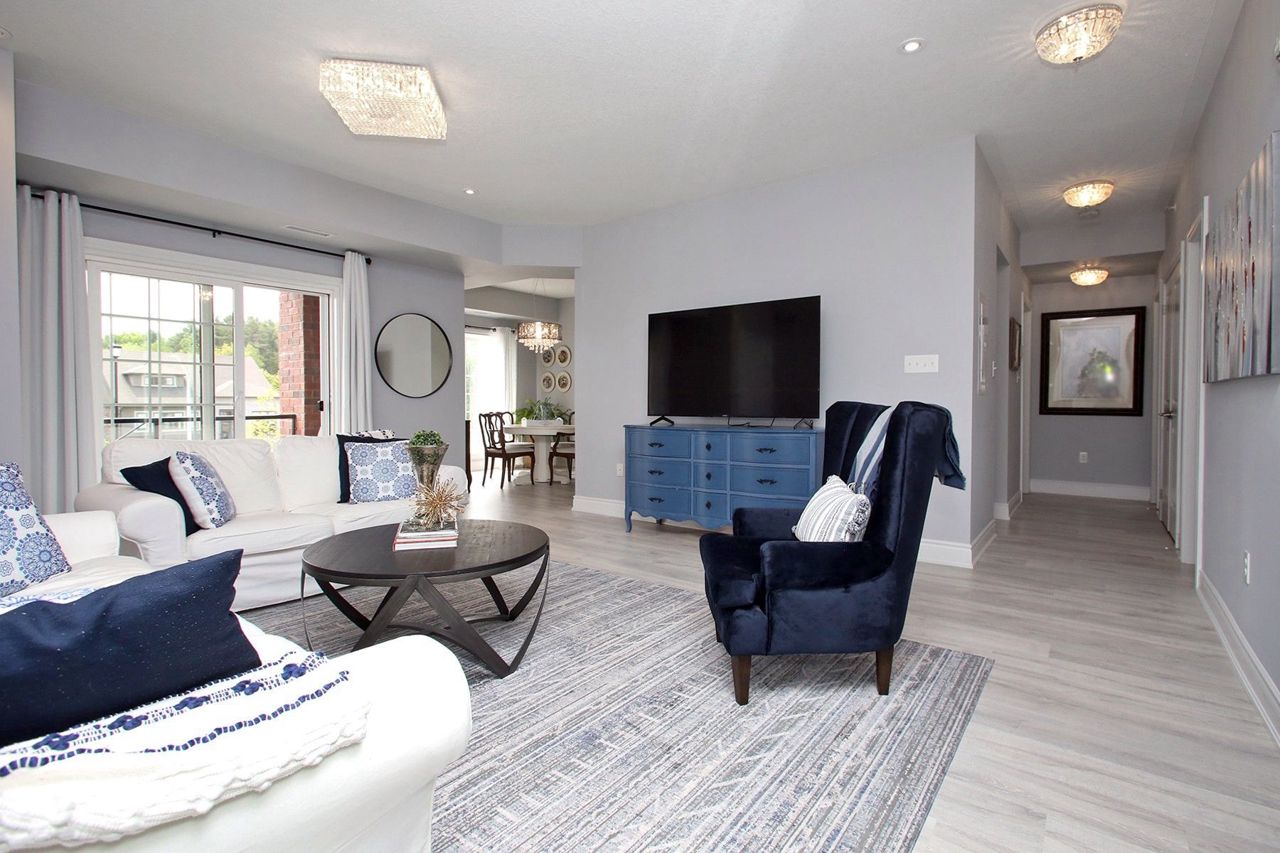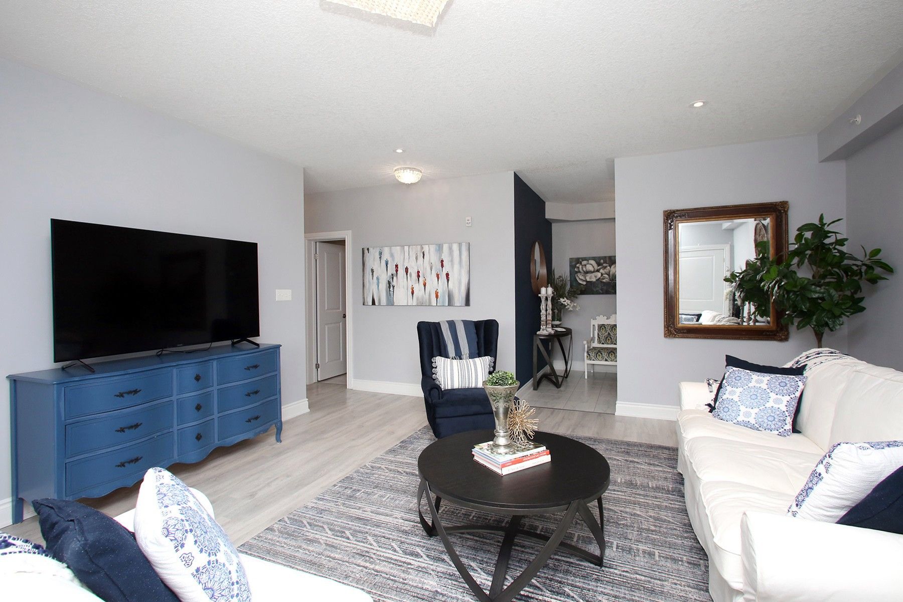 Immaculate, Luminous, and Airy Residence Large 1464 sq ft Condo in an Exquisite and Elegant Building Situated on a Serene Cul-de-Sac, Merely Minutes Away from Highway 400, the Waterfront, Adagh Bluffs, and Premier Schools. This Unit Boasts a Plethora of Upgrades, Including Expansive Ceilings, Timeless Neutral Tones, and Premium Laminate Flooring. The Kitchen Showcases Stainless Steel Appliances, Quartz Countertops, a Subway Tile Backsplash. The Den Features A Custom-Built Library with an Electric Fireplace. Indulge in the Luxurious Glass Shower and Other Upscale Features. Additionally, Revel in the Splendor of the Spacious Covered Balcony with Scenic Views. Benefit from Affordable Condo Fees, and Delight in the Warm and Inviting Common Areas Embellished with "Greenwich Village" Style Decor.
