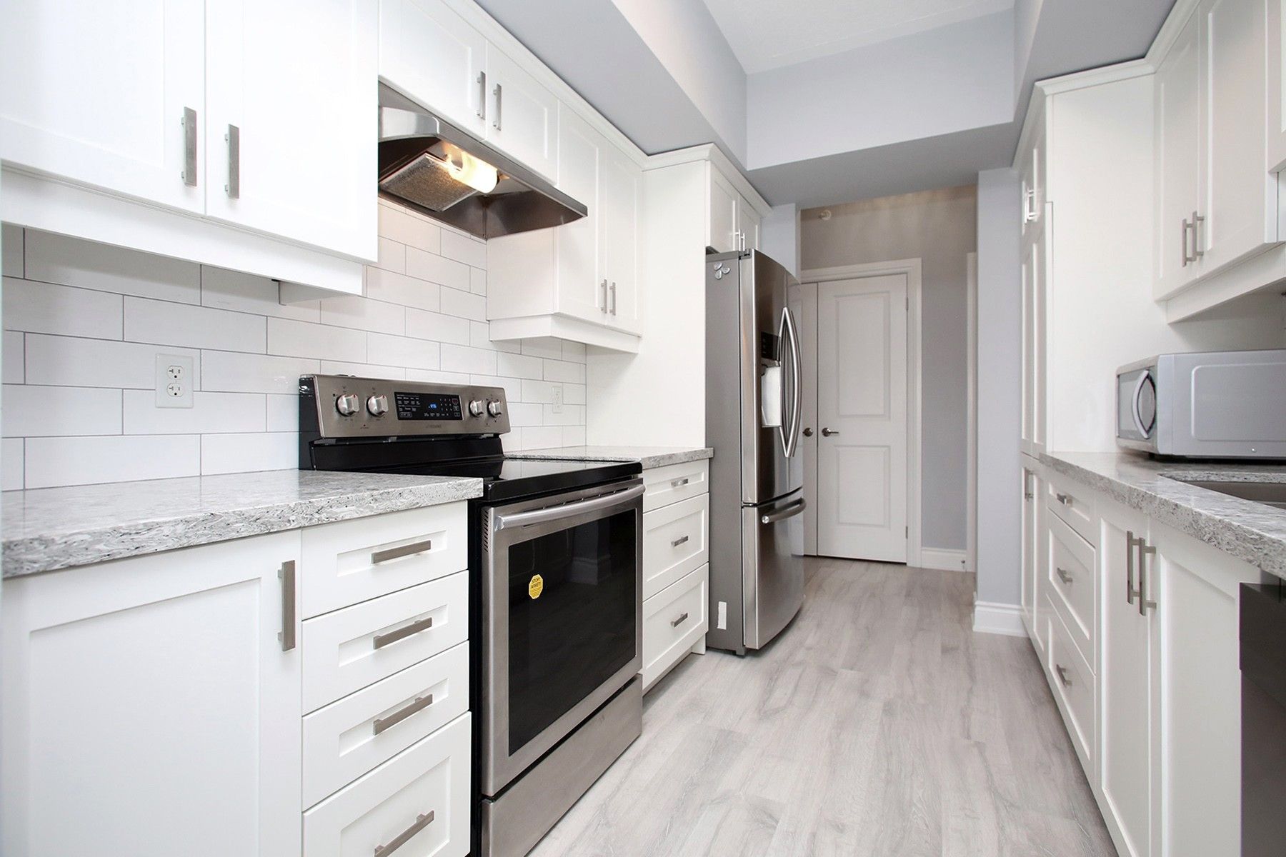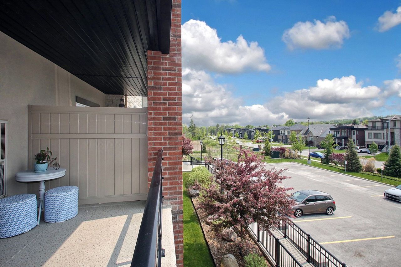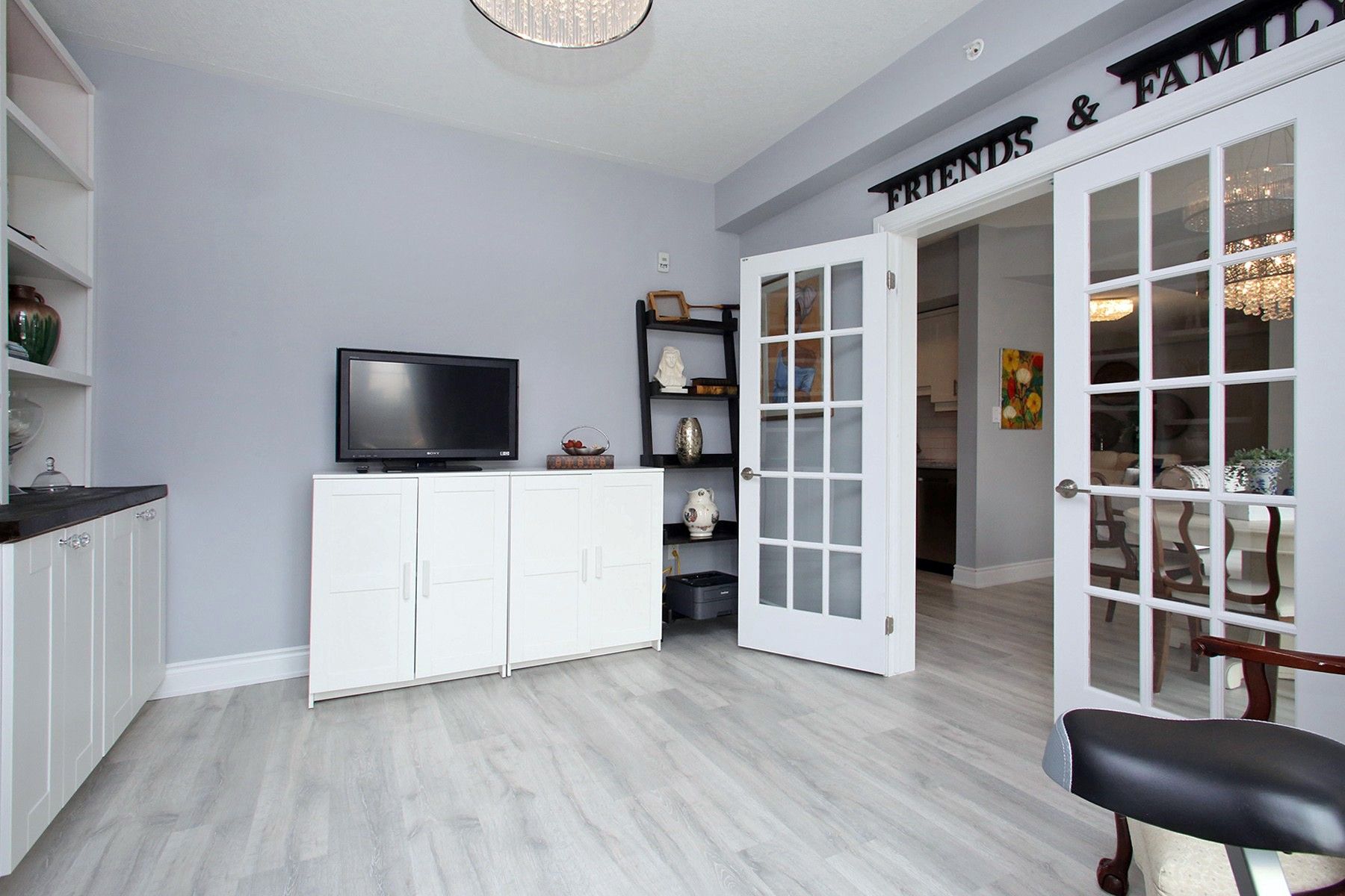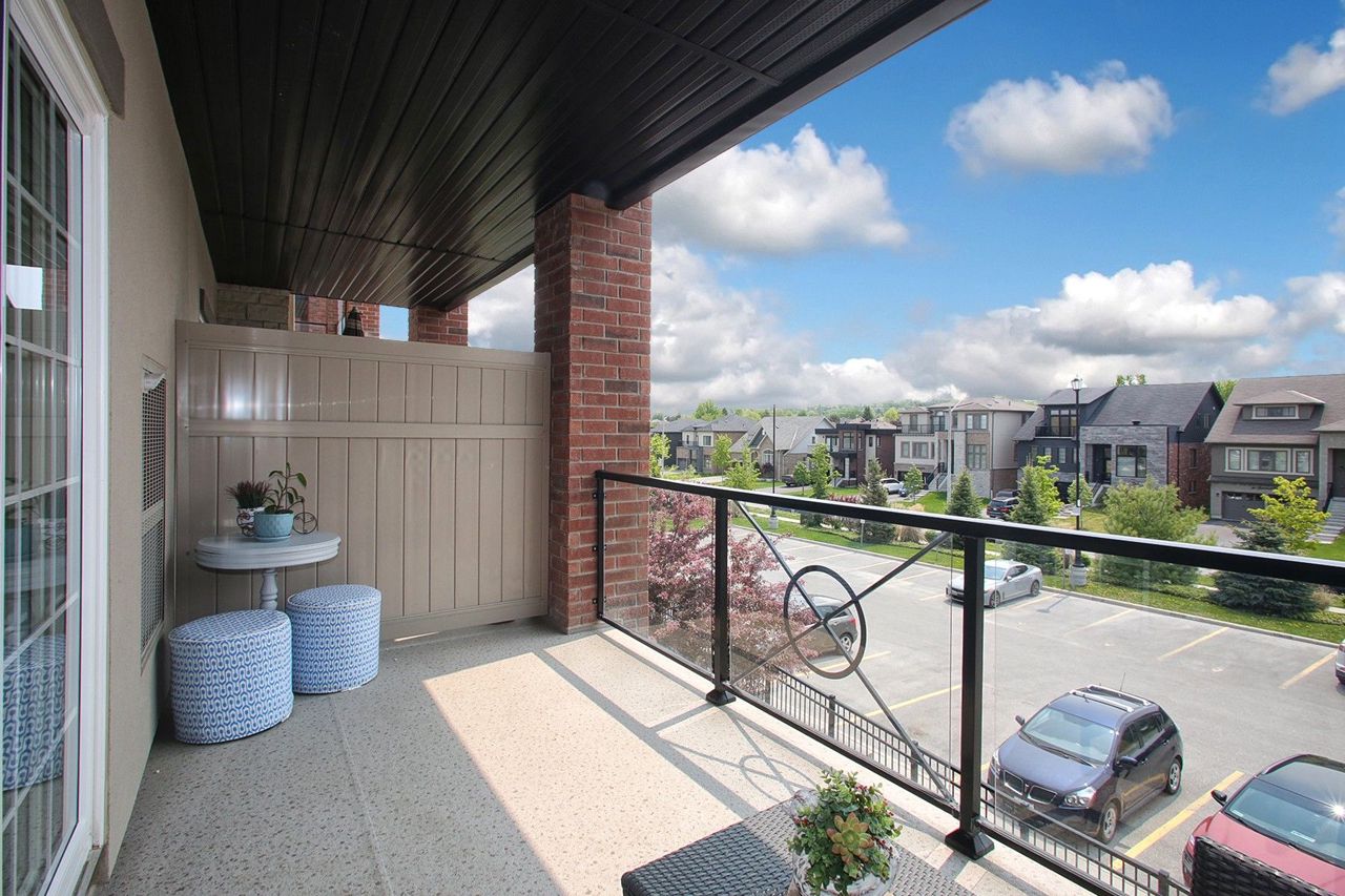 Immaculate, Luminous, and Airy Residence Large 1464 sq ft Condo in an Exquisite and Elegant Building Situated on a Serene Cul-de-Sac, Merely Minutes Away from Highway 400, the Waterfront, Adagh Bluffs, and Premier Schools. This Unit Boasts a Plethora of Upgrades, Including Expansive Ceilings, Timeless Neutral Tones, and Premium Laminate Flooring. The Kitchen Showcases Stainless Steel Appliances, Quartz Countertops, a Subway Tile Backsplash. The Den Features A Custom-Built Library with an Electric Fireplace. Indulge in the Luxurious Glass Shower and Other Upscale Features. Additionally, Revel in the Splendor of the Spacious Covered Balcony with Scenic Views. Benefit from Affordable Condo Fees, and Delight in the Warm and Inviting Common Areas Embellished with "Greenwich Village" Style Decor.