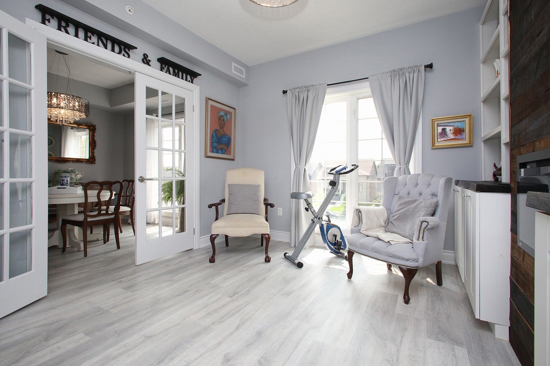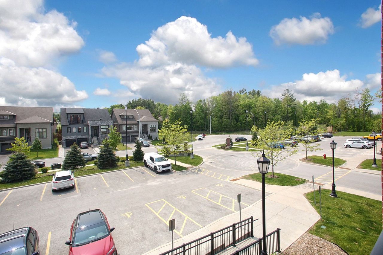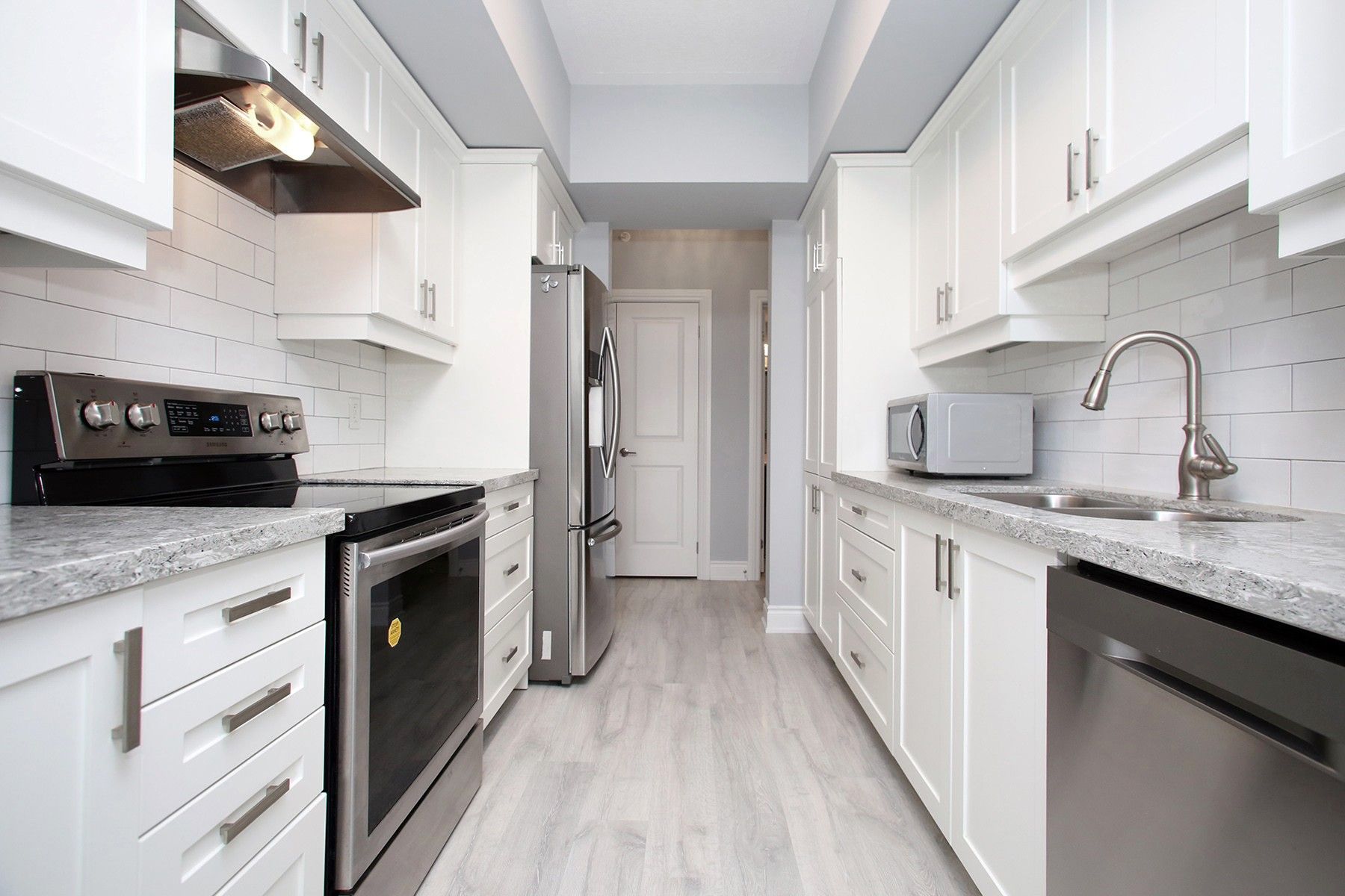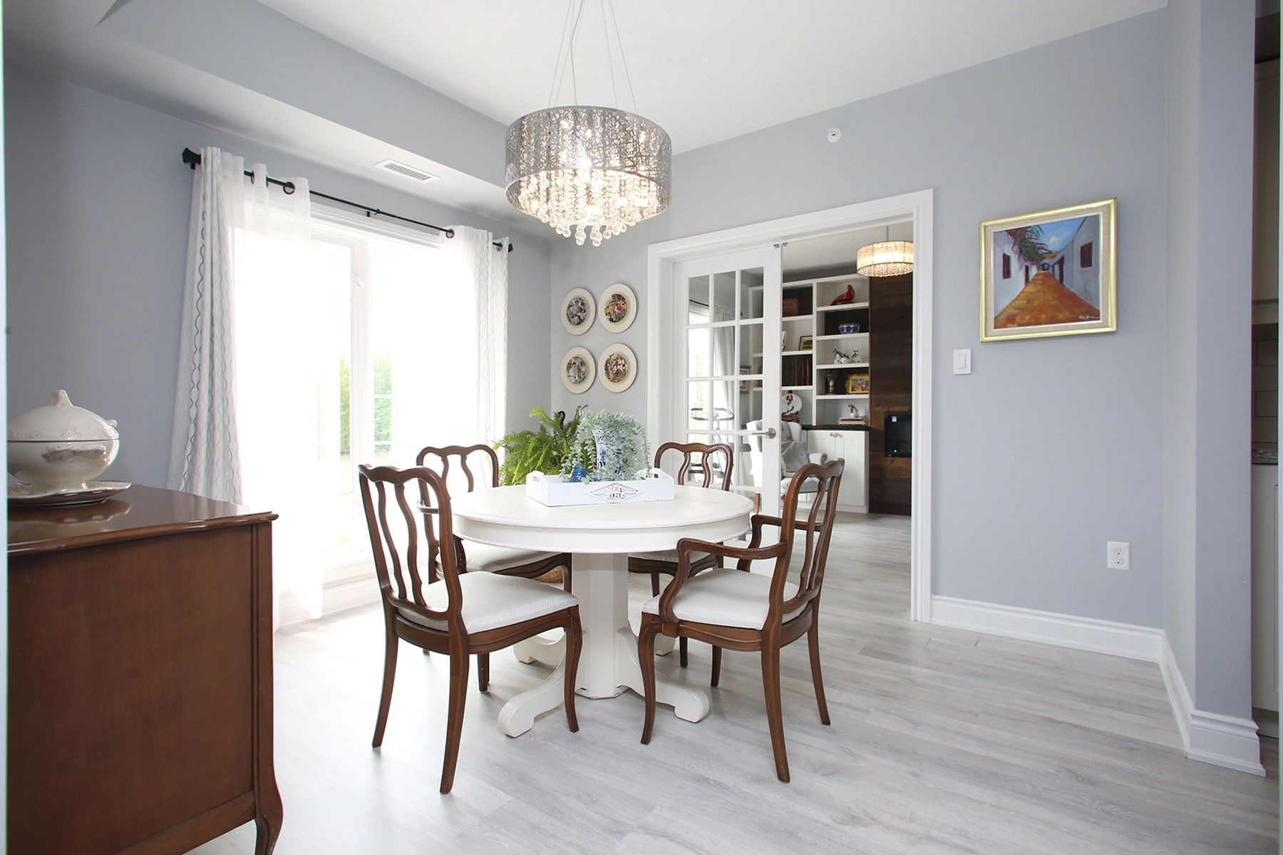 Immaculate, Luminous, and Airy Residence Large 1464 sq ft Condo in an Exquisite and Elegant Building Situated on a Serene Cul-de-Sac, Merely Minutes Away from Highway 400, the Waterfront, Adagh Bluffs, and Premier Schools. This Unit Boasts a Plethora of Upgrades, Including Expansive Ceilings, Timeless Neutral Tones, and Premium Laminate Flooring. The Kitchen Showcases Stainless Steel Appliances, Quartz Countertops, a Subway Tile Backsplash. The Den Features A Custom-Built Library with an Electric Fireplace. Indulge in the Luxurious Glass Shower and Other Upscale Features. Additionally, Revel in the Splendor of the Spacious Covered Balcony with Scenic Views. Benefit from Affordable Condo Fees, and Delight in the Warm and Inviting Common Areas Embellished with "Greenwich Village" Style Decor.