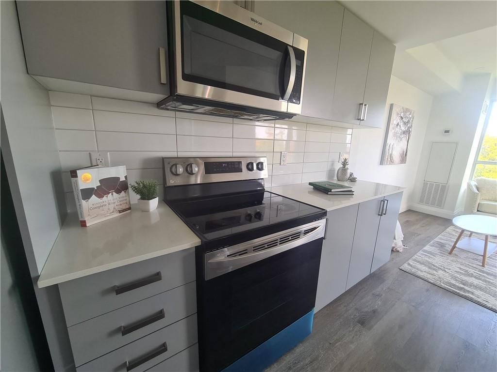 Welcome to this beautiful 2-bed plus den unit in the LakeVu Condo. Start your morning coffee with the breathtaking view of Little Lake. The unit features upgraded kitchen cabinets, tiles, backsplash, and engineered vinyl flooring throughout. Large windows throughout. SS appliances include fridge, stove, dishwasher, Built-in Microwave and in-unit washer and dryer. This modern building includes amenities; a party room, games room, rooftop patio, guest suite, pet spa. Underground parking space. Storage Locker. Ideal Location Close To HWY 400, Hospital, Little Lake Health Centre, College, Public Transit & Shopping Centre.