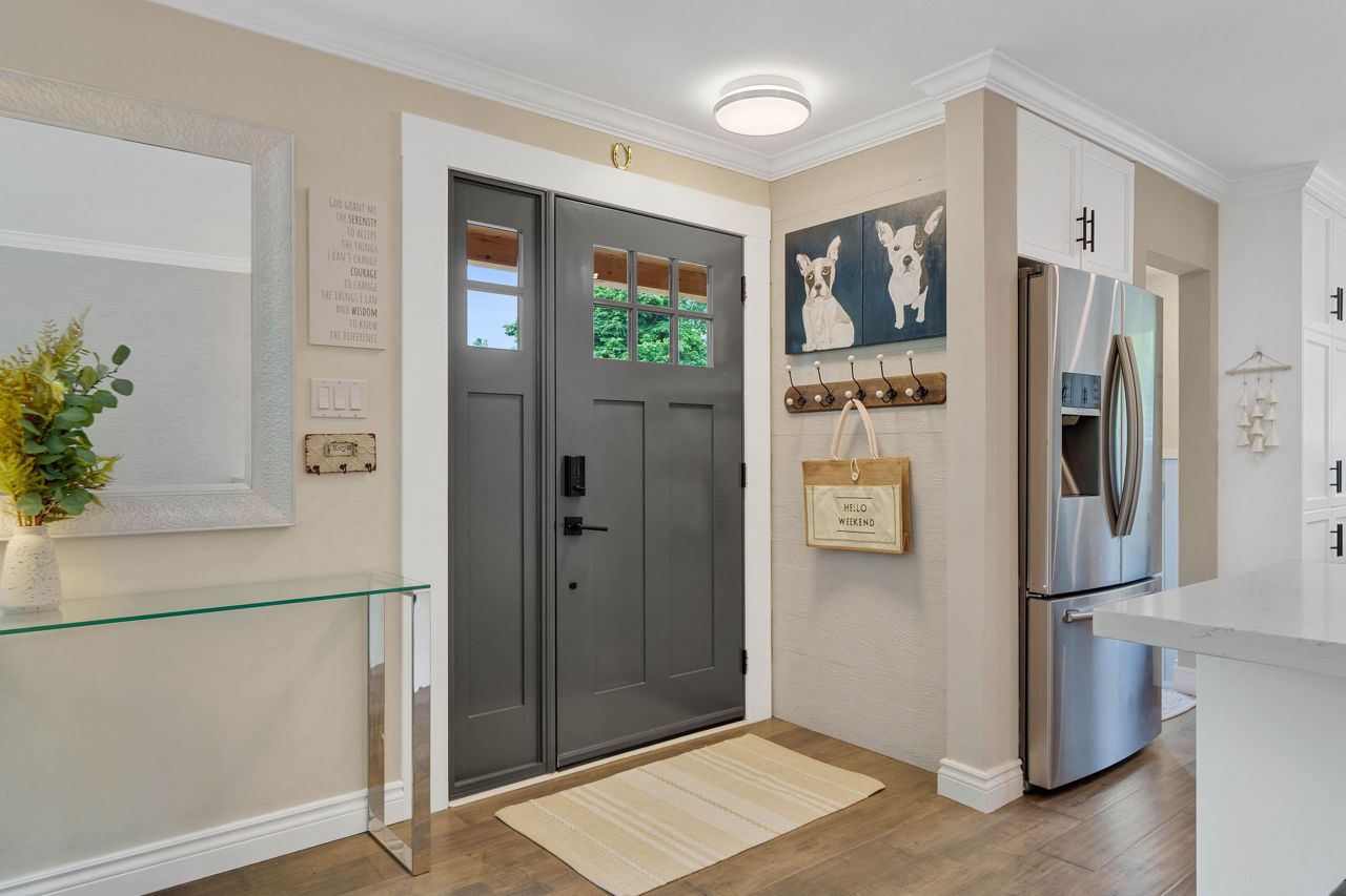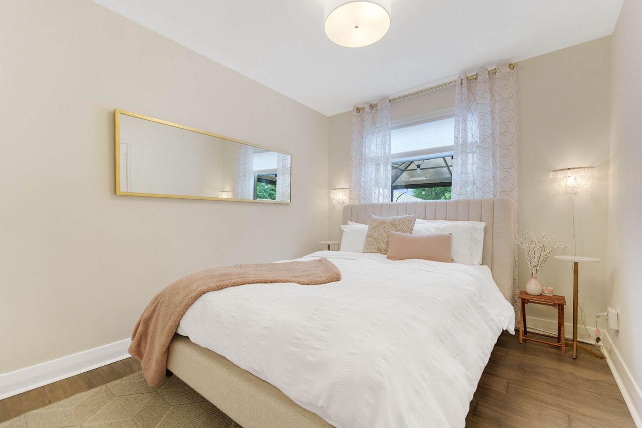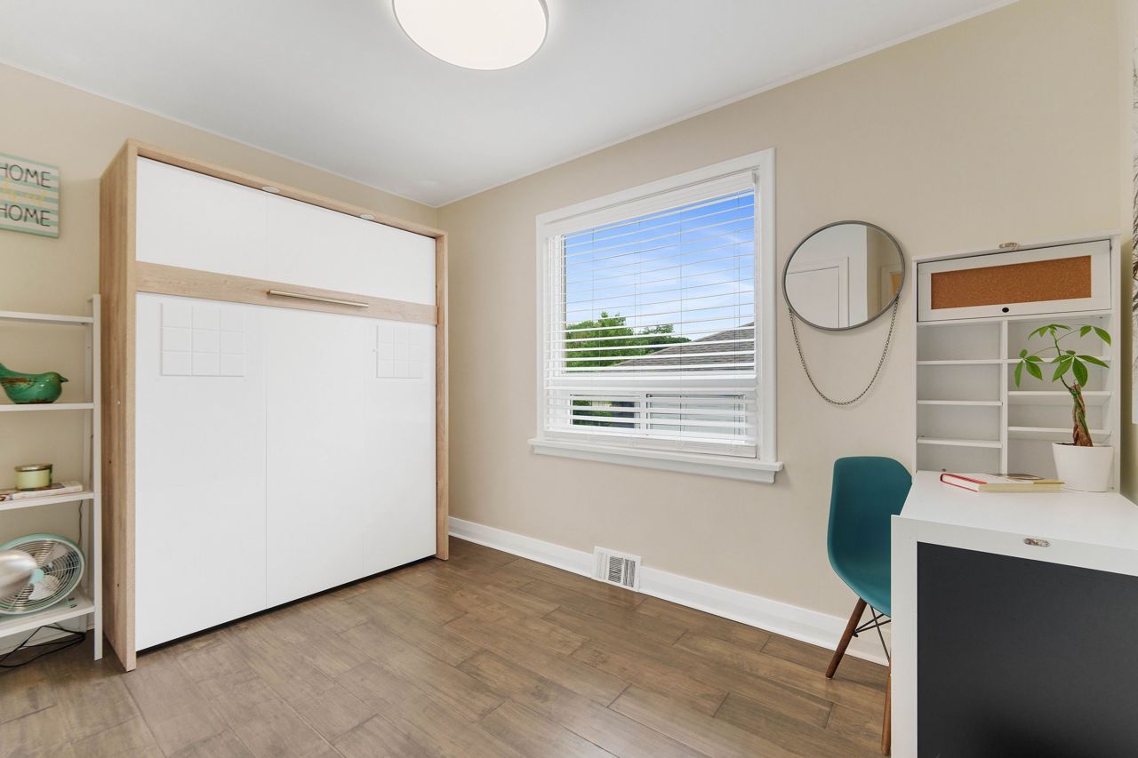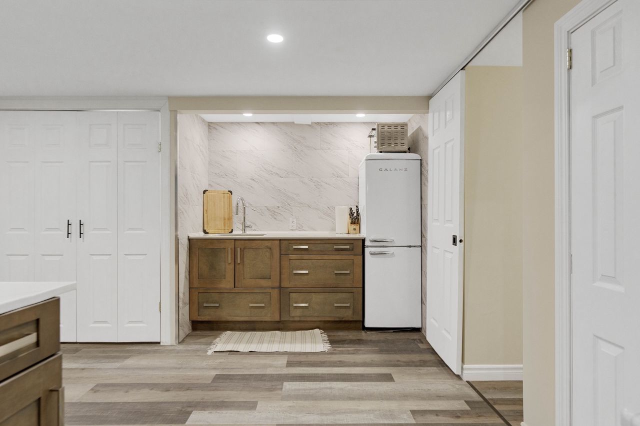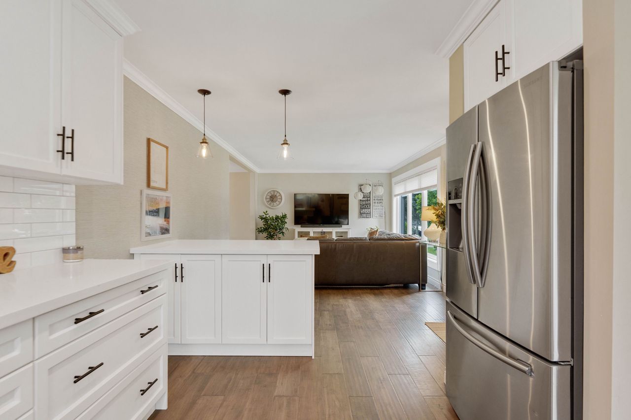 Beautifully renovated from top to bottom this raised bungalow is located on one of Barrie's very sought after East-End streets, next to Strabane Park and backing onto mature trees. The new porch and front door welcomes you into the spacious open concept kitchen; a chef's dream with all white cabinetry, black hardware and quartz countertops, complete with stainless steel appliances and a breakfast bar. Open to the kitchen is the airy and bright living room with a floor to ceiling picture window, which leads onto the dining area and walk-out to the rear deck. The primary and 2nd bedroom are served by an immaculate white and black accented 3 piece bathroom. The 2nd bedroom is multi-functional with a built-in murphy bed and foldaway desk ideal for working from home or tucking away for guests not wanting to leave. The basement with separate entry was fully reno'd in 2019 offering spacious family room, 2 additional bedrooms both with windows and a 4 pc ensuite with oversized shower.Updates include: engineered hardwood floors (2017), mostly all new windows (2021), new exterior doors including garage, shingles (@2016), furnace (2019), basement reno (2020).
