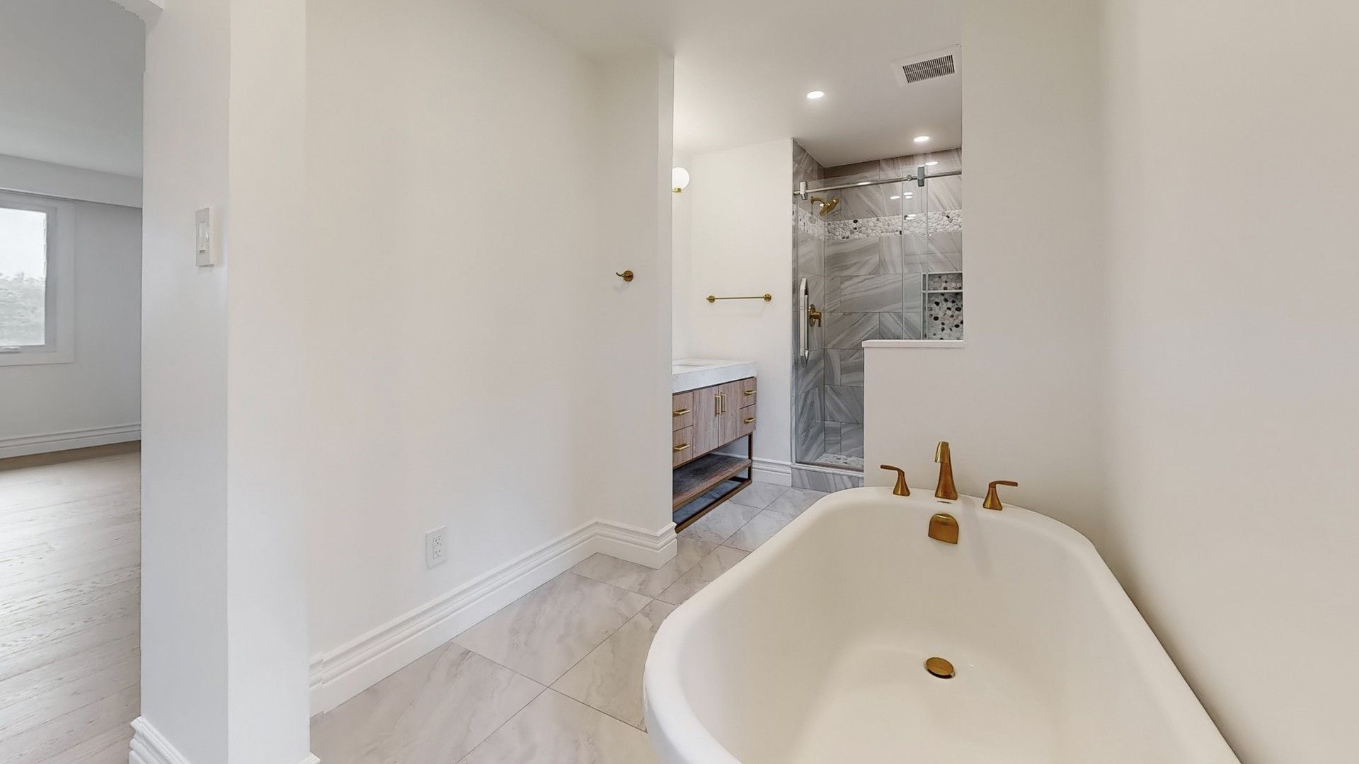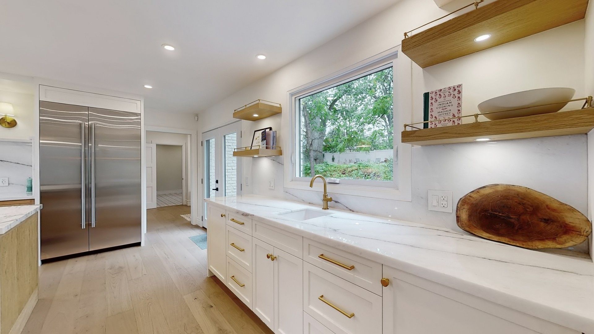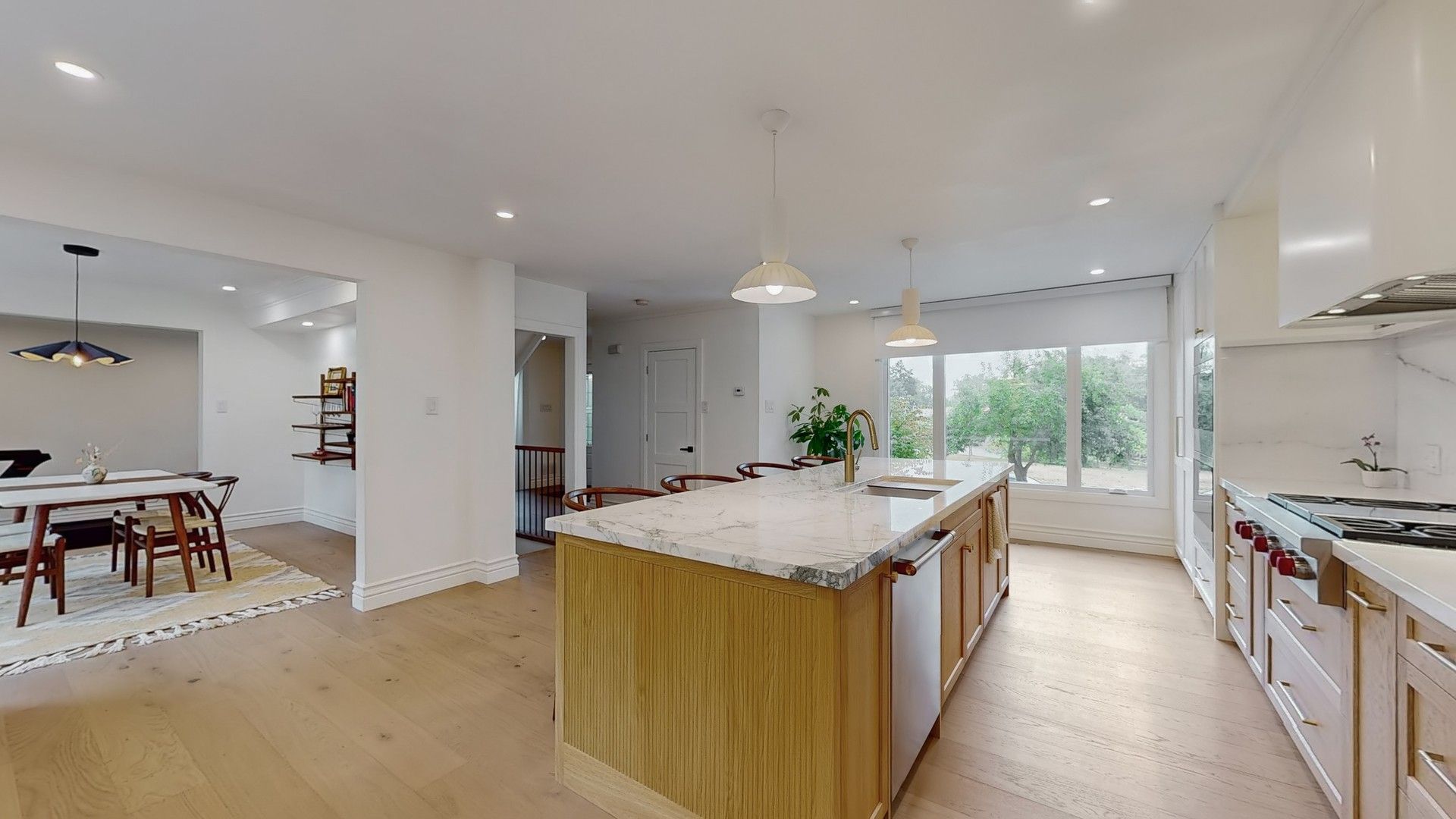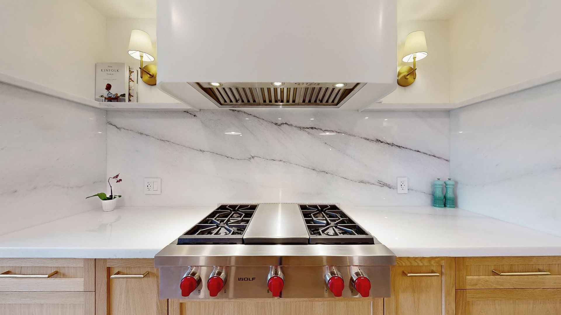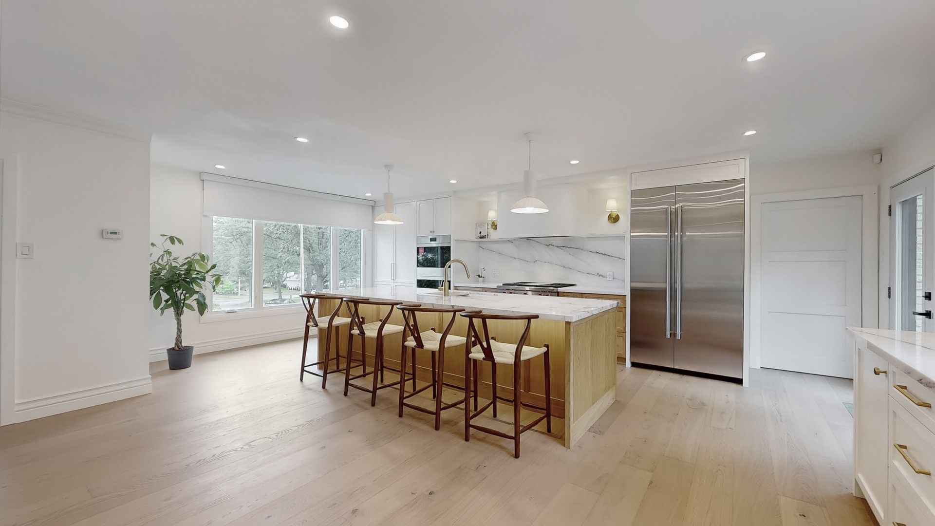 屋内铺设了百年古老的法国白橡木地板,配有Luminaires Authentik定制灯具,石砌燃木壁炉,以及超大窗户,让每个房间都沐浴在自然光中。房子的核心是一个全新的400平方英尺专业厨师厨房,拥有定制橡木橱柜、Calcutta大理石台面,以及高端嵌入式电器,包括Wolf双烤箱和JennAir冰箱。来自Rove Concepts和CB2等奢侈品牌的精心挑选家具,提升了室内格调,与房子的精致美学完美融合。
