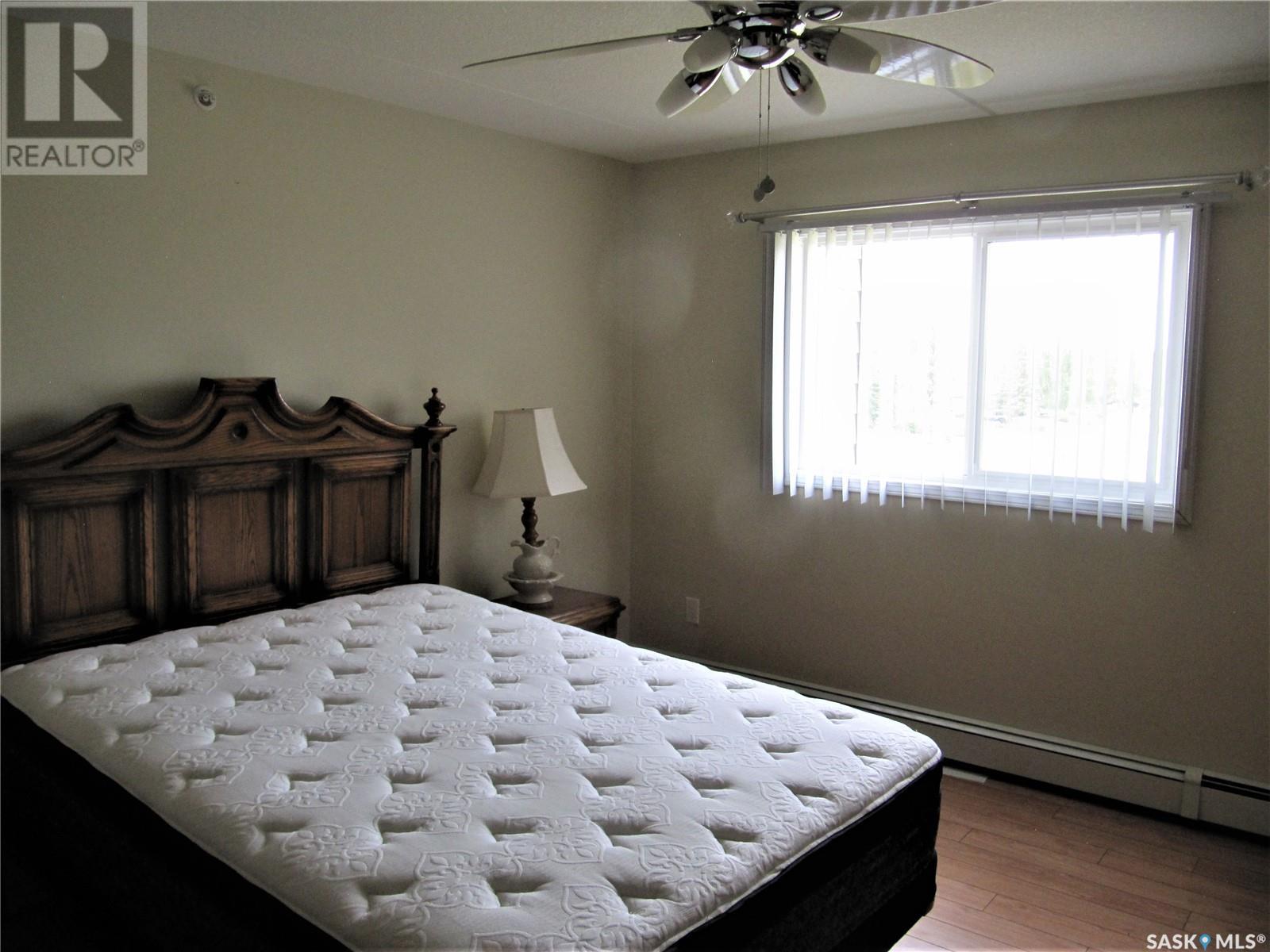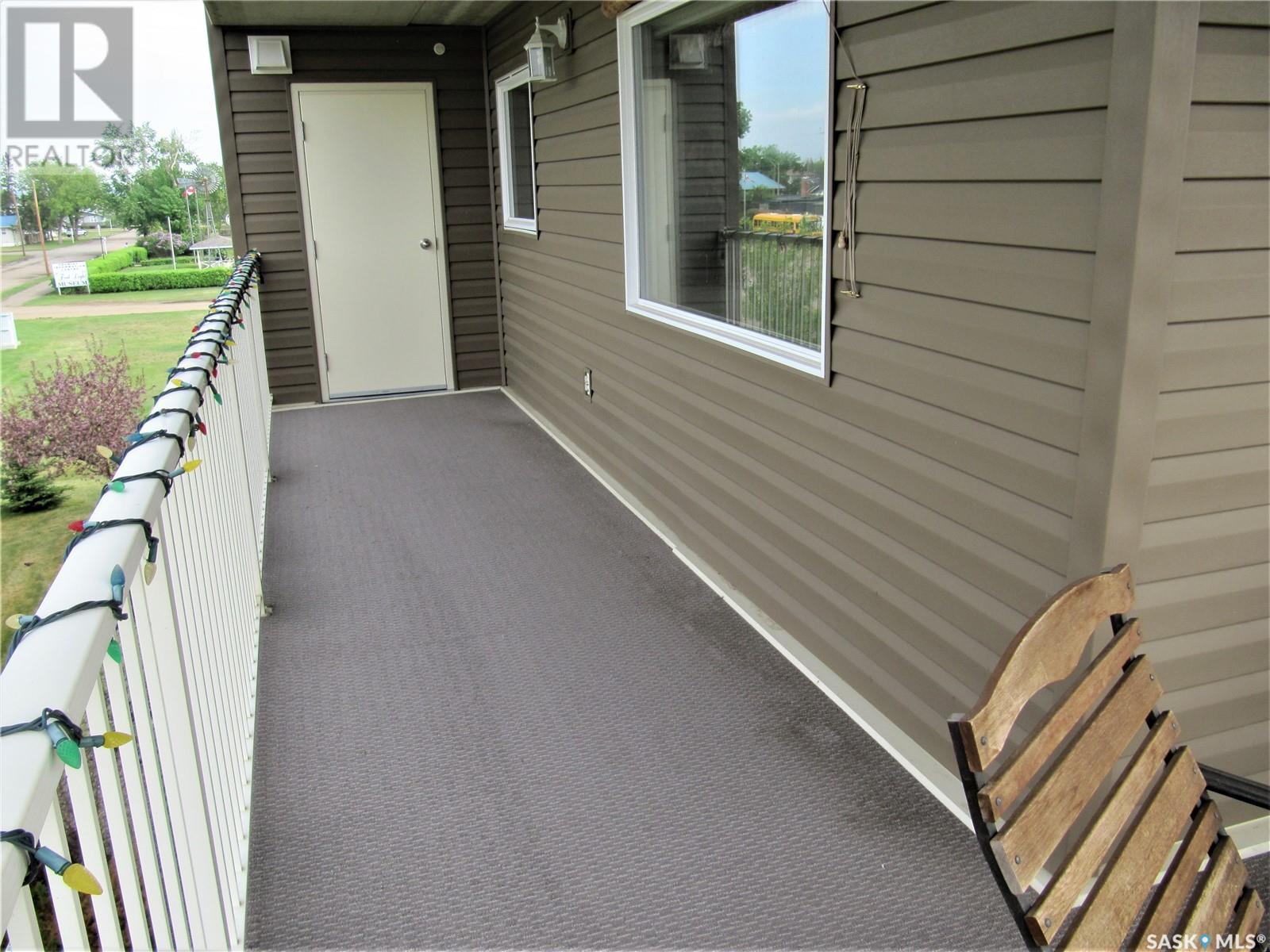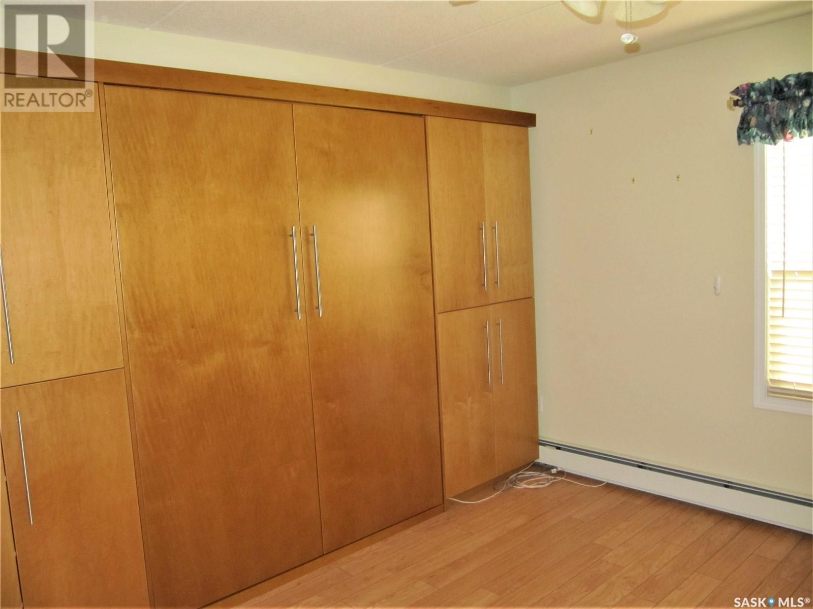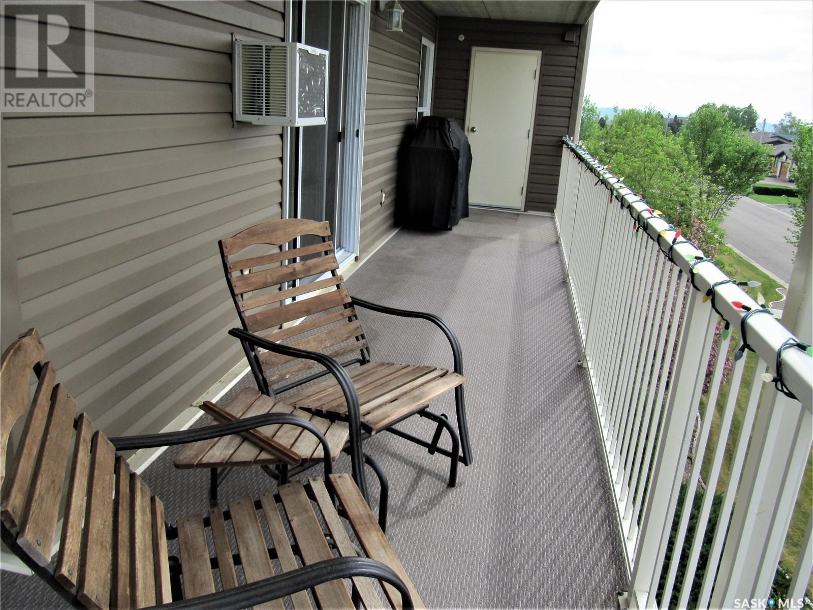 An amazing opportunity to purchase a third level corner unit that has been well managed with a healthy surplus fund in River Valley Estates Condominiums, Battleford, SK. The proud original owners had a hand in designing the layout of their 1208 sq. ft. at the time of the condominium was being built. Starting with a spacious entry into this condo unit that has a large double closet, then moving on into the dining, kitchen, living room area you will appreciate an open flow design throughout. Kitchen having a L shaped layout, loads of cabinets and with an Island, large windows on two sides of the living room space provides warm natural lighting throughout this area. On to the wraparound balcony where you will be preparing meals on the BBQ and enjoying the western sunsets, there are two storage units on either end of the balcony. Entering back into the condo to the front entry the master bedroom is tucked behind the kitchen, having a 3-piece ensuite and large closets. On the other side of the entry is a full bath, a second bedroom with a murphy bed and build in corner desk, laundry and storage are adjacent to the front entry. This unit includes a heated underground parking stall #18 and as well #30 detached garage that can be used for a second vehicle and storage. Give us a call for a view, this one will not last long. (id:22211)