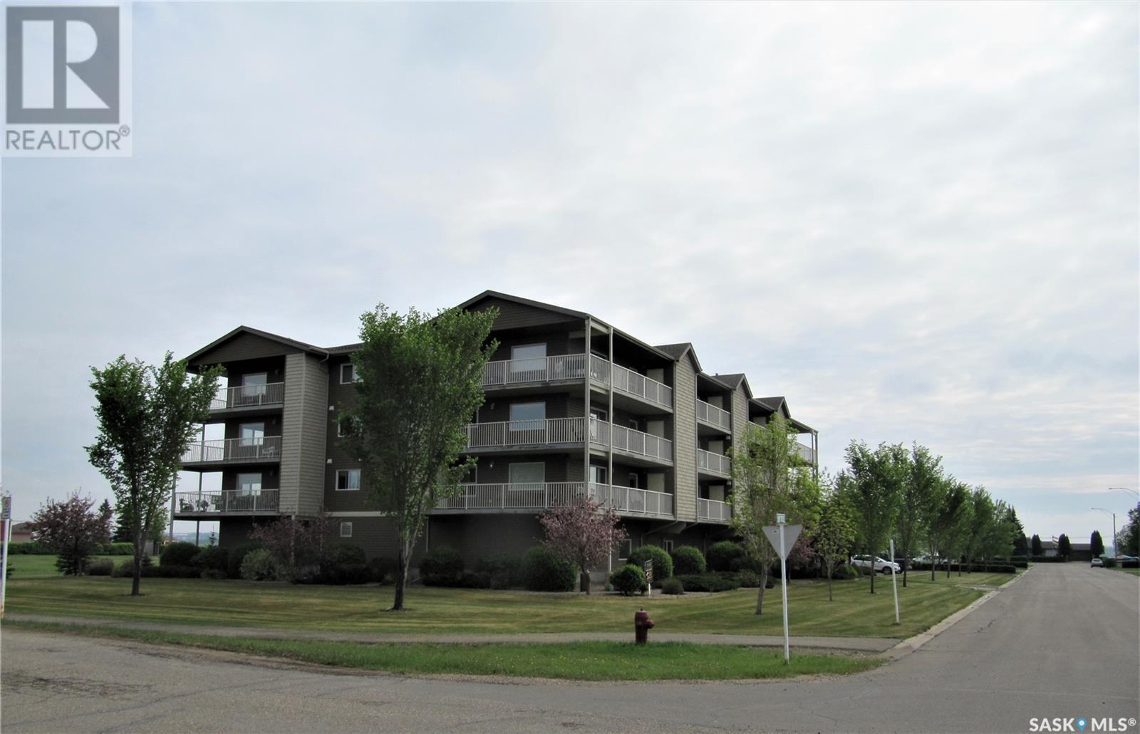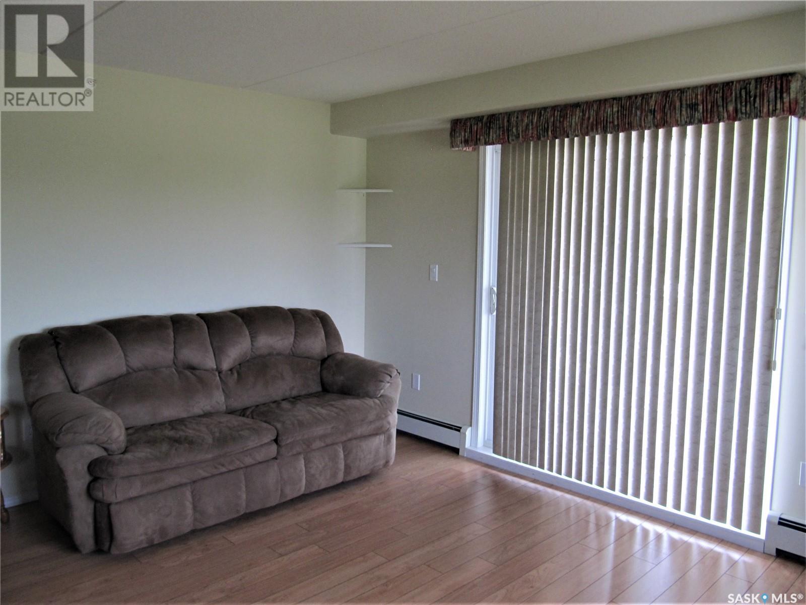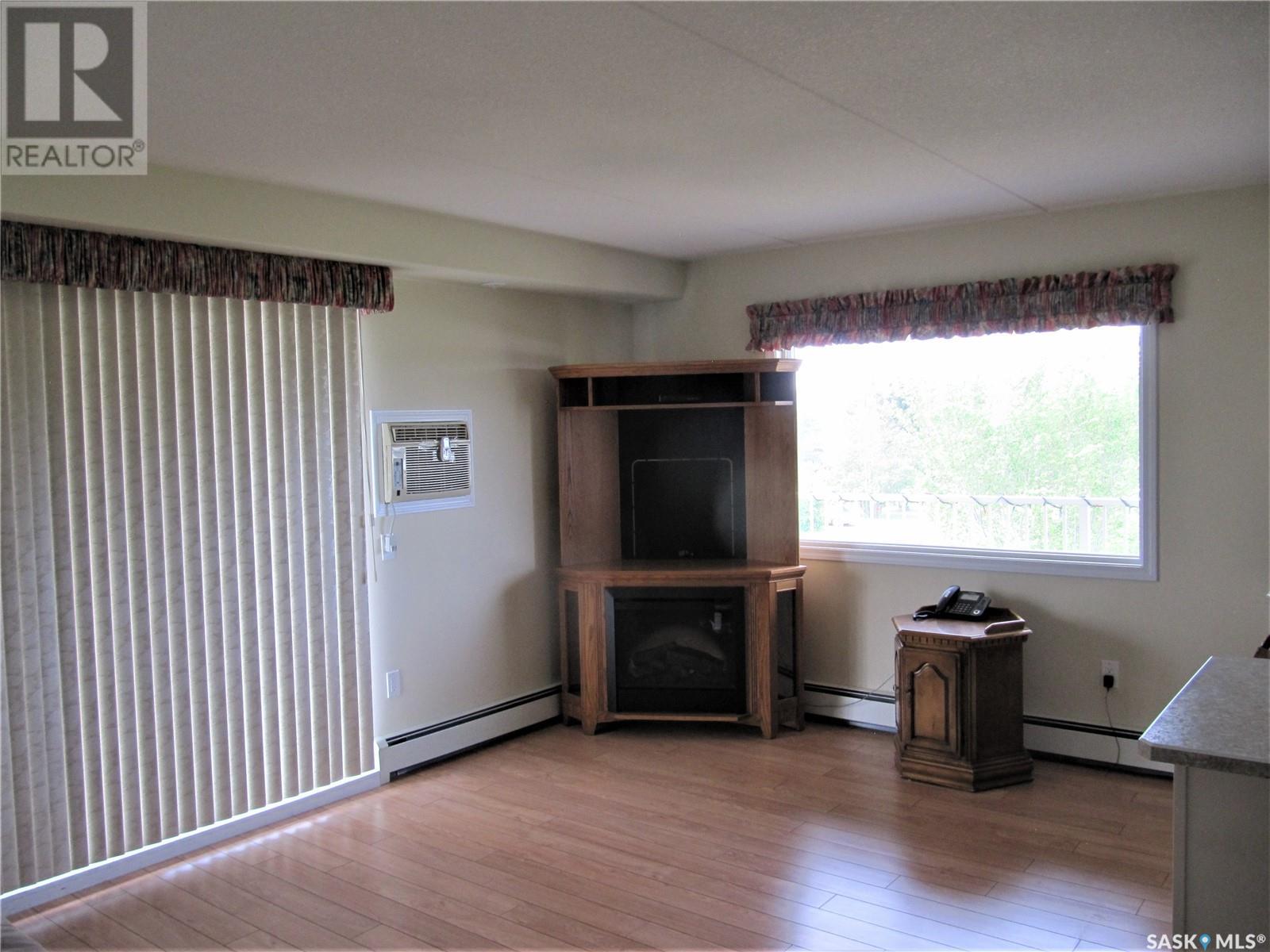 An amazing opportunity to purchase a third level corner unit that has been well managed with a healthy surplus fund in River Valley Estates Condominiums, Battleford, SK. The proud original owners had a hand in designing the layout of their 1208 sq. ft. at the time of the condominium was being built. Starting with a spacious entry into this condo unit that has a large double closet, then moving on into the dining, kitchen, living room area you will appreciate an open flow design throughout. Kitchen having a L shaped layout, loads of cabinets and with an Island, large windows on two sides of the living room space provides warm natural lighting throughout this area. On to the wraparound balcony where you will be preparing meals on the BBQ and enjoying the western sunsets, there are two storage units on either end of the balcony. Entering back into the condo to the front entry the master bedroom is tucked behind the kitchen, having a 3-piece ensuite and large closets. On the other side of the entry is a full bath, a second bedroom with a murphy bed and build in corner desk, laundry and storage are adjacent to the front entry. This unit includes a heated underground parking stall #18 and as well #30 detached garage that can be used for a second vehicle and storage. Give us a call for a view, this one will not last long. (id:22211)
