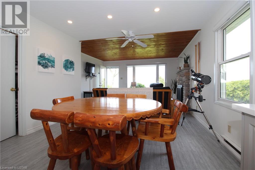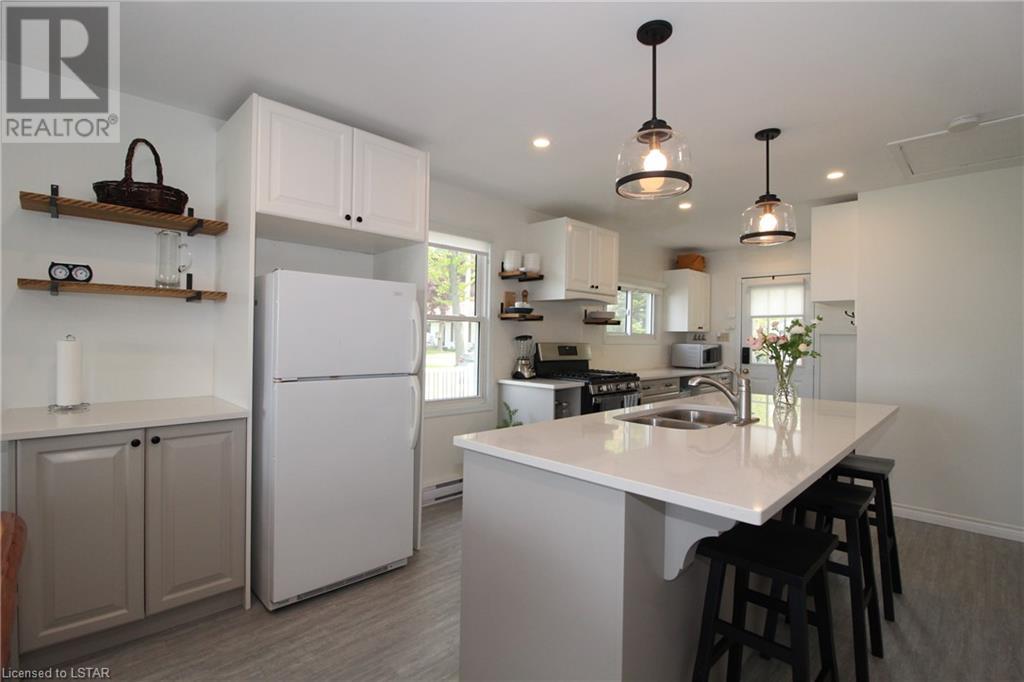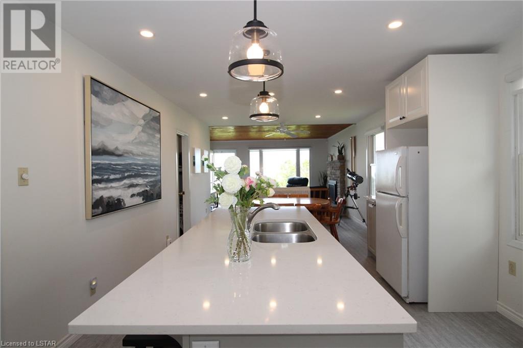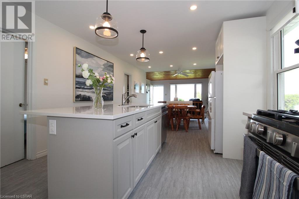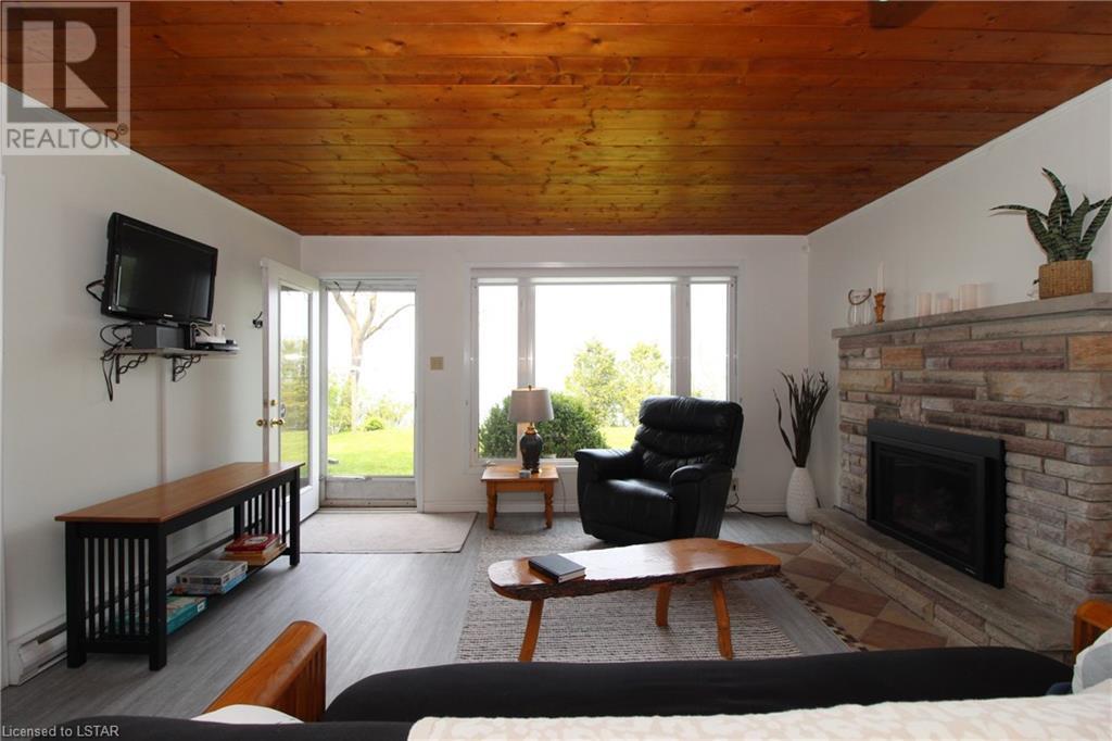 Welcome to this turnkey fully updated lakefront home or cottage at 71209 Karen Drive in Highlands 1 just north of Grand Bend! So close that you can walk to Grand Bend along the coastline with your toes in the sand! Enjoy all the benefits of living your best life on the sandy shores of Lake Huron. The home is fully updated from its original cottage finishing and most recently in the last year a brand new kitchen, stone retaining wall, on demand gas hot water heater, pot lights, light fixtures and luxury vinyl plank flooring. Updated vinyl exterior with metal roof installed in 2019. Nicely landscaped property with lots of space for four cars to park on private double wide gravel driveway. Entering the home you have incredible views of Lake Huron with the large windows in living room. Open concept design gives the home a great feel and makes it great for entertaining! Brand new kitchen offers two tone cabinetry with eat up island, quartz counters and brand new appliances including gas stove. Dining area offers lots of room for the whole family to sit down and enjoy dinner after a long day on the beach! Living room with brand new gas fireplace, pine ceiling and large window overlooking Lake Huron is a great spot to relax in the morning or evening. Offering three bedrooms with primary bedroom facing Lake Huron. Along with the full bathroom and laundry (full size washer and dryer) to make extended stays an easy task! With both the siding, attic and crawl space being reinsulated making this an efficient year round home or cottage for the new buyer! Septic system was totally redone in 1998. Bonus there are two sheds and the one lakeside shed would make for a super cute bunkie. Coming fully furnished minus a couple items the new buyer can come in and start enjoying the cottage this summer! Highlands 1 is a great cottage style subdivision just 2 KM north of Grand Bend and close to all amenities including grocery stores, pharmacy, hardware store and golf courses! (id:22211)