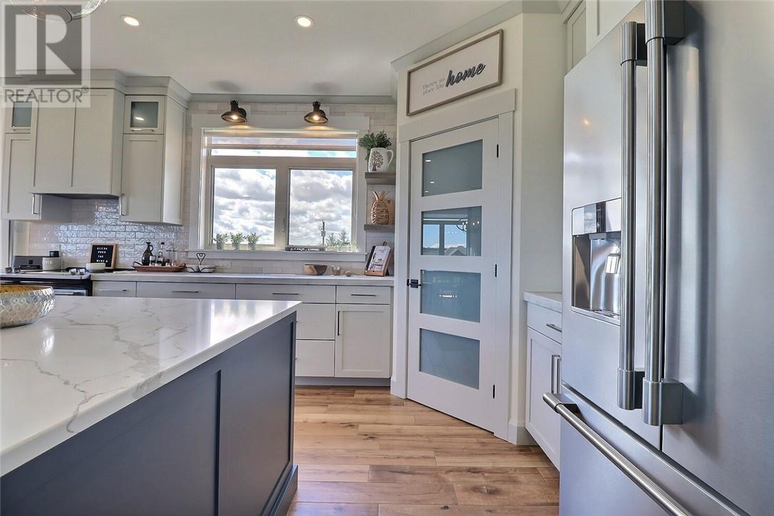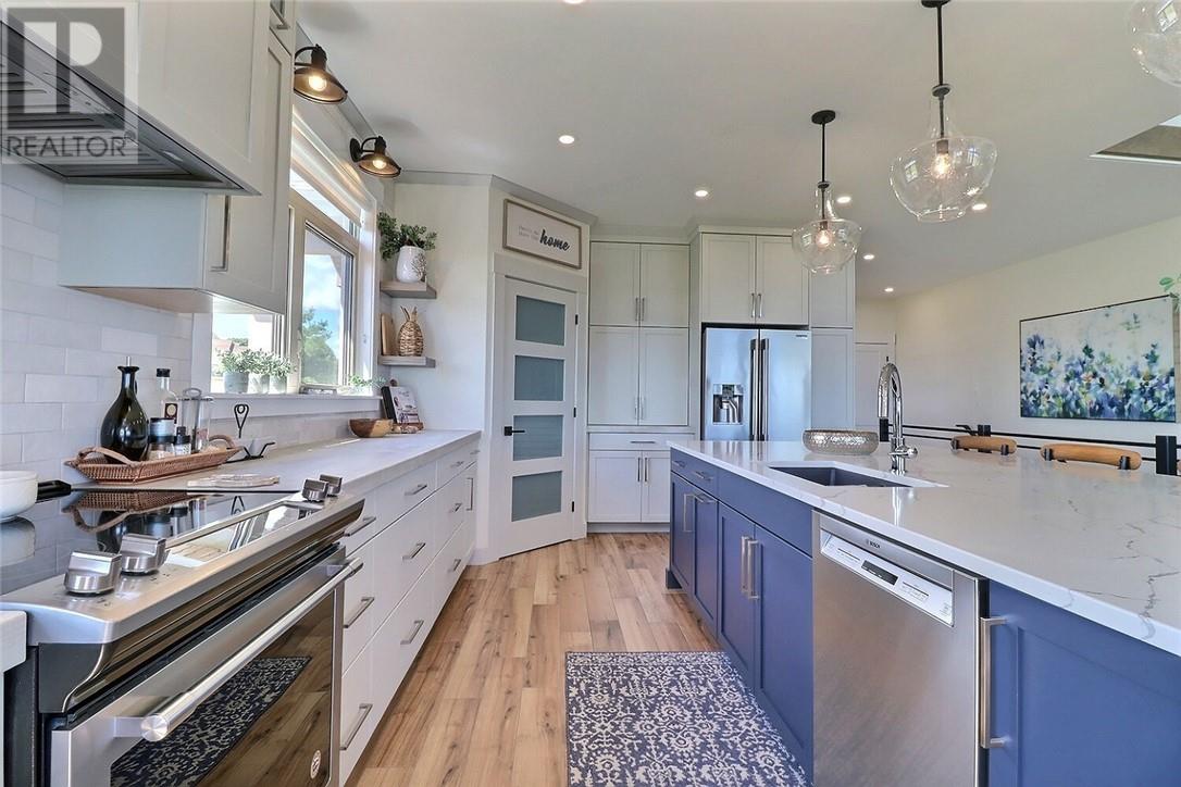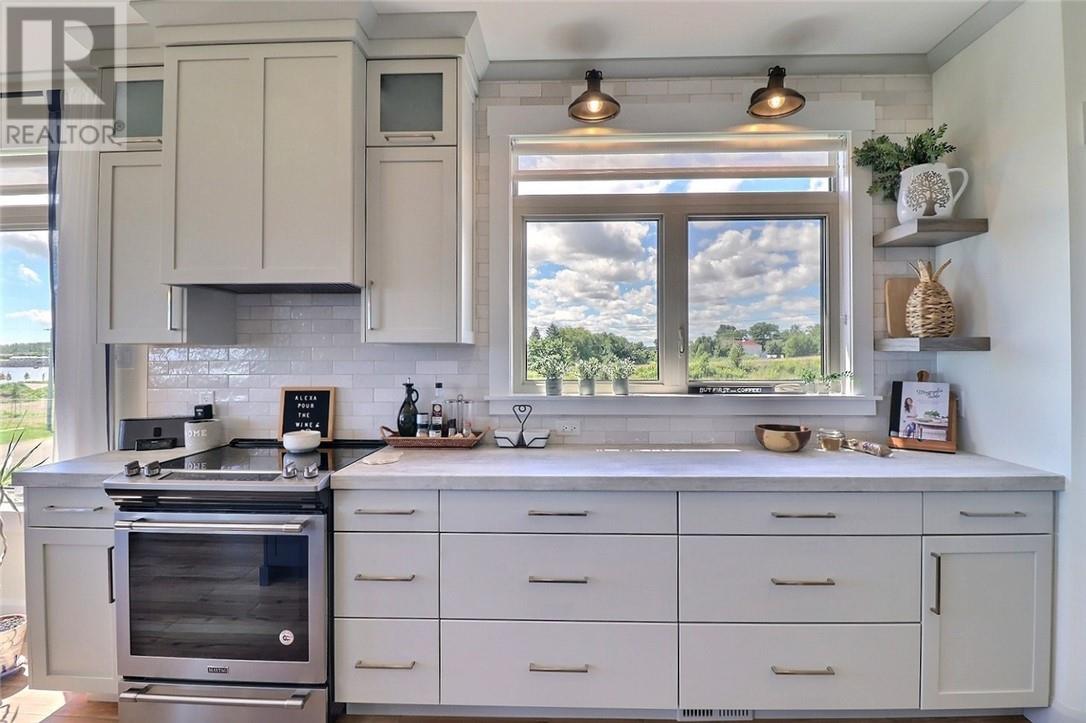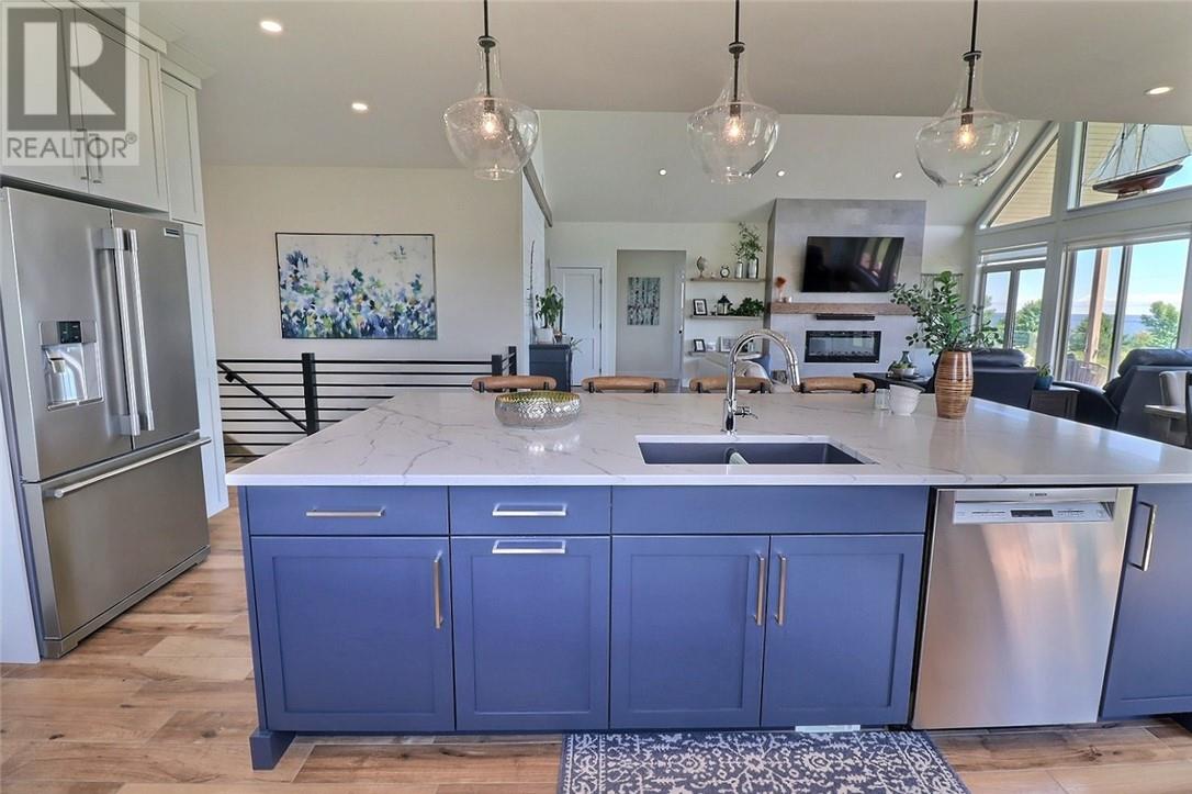 When only the best will do! This water view quality built custom bungalow is in pristine condition and won't disappoint. You will feel right at home as you walk into the inviting foyer boasting 9' ceilings. The gourmet kitchen is definitely a chef's dream with a large center island topped with beautiful white quartz countertop, corner pantry and stainless steel appliances. The bright living room features 17' architectural ceilings highlighted with a gorgeous barnwood beam fireplace mantel. The master bedroom features a luxurious infloor heated ensuite with double vanity and a beautiful tiled shower with glass doors. Descend the hardwood staircase to the lower level walk out basement where you will find two additional bedrooms, a full bathroom, a large family room and an underneath garage for all of your summer and winter toys. The infloor heated double attached garage has beautiful polyurea floors and steel walls. The exterior is beautifully landscaped, features a large double paved driveway with additional parking space and a single detached garage. Enjoy the peaceful evenings, the spectacular views and the sunsets. Entertain friends and family, host gatherings and cookouts on the large deck. Enjoy the nearby beaches, the bicycle trails, fishing, canoeing and kayaking and so much more! This piece of paradise with stunning water views from all locations is turnkey and could be your dream come true! Please call, text or email for additional information. (id:22211)