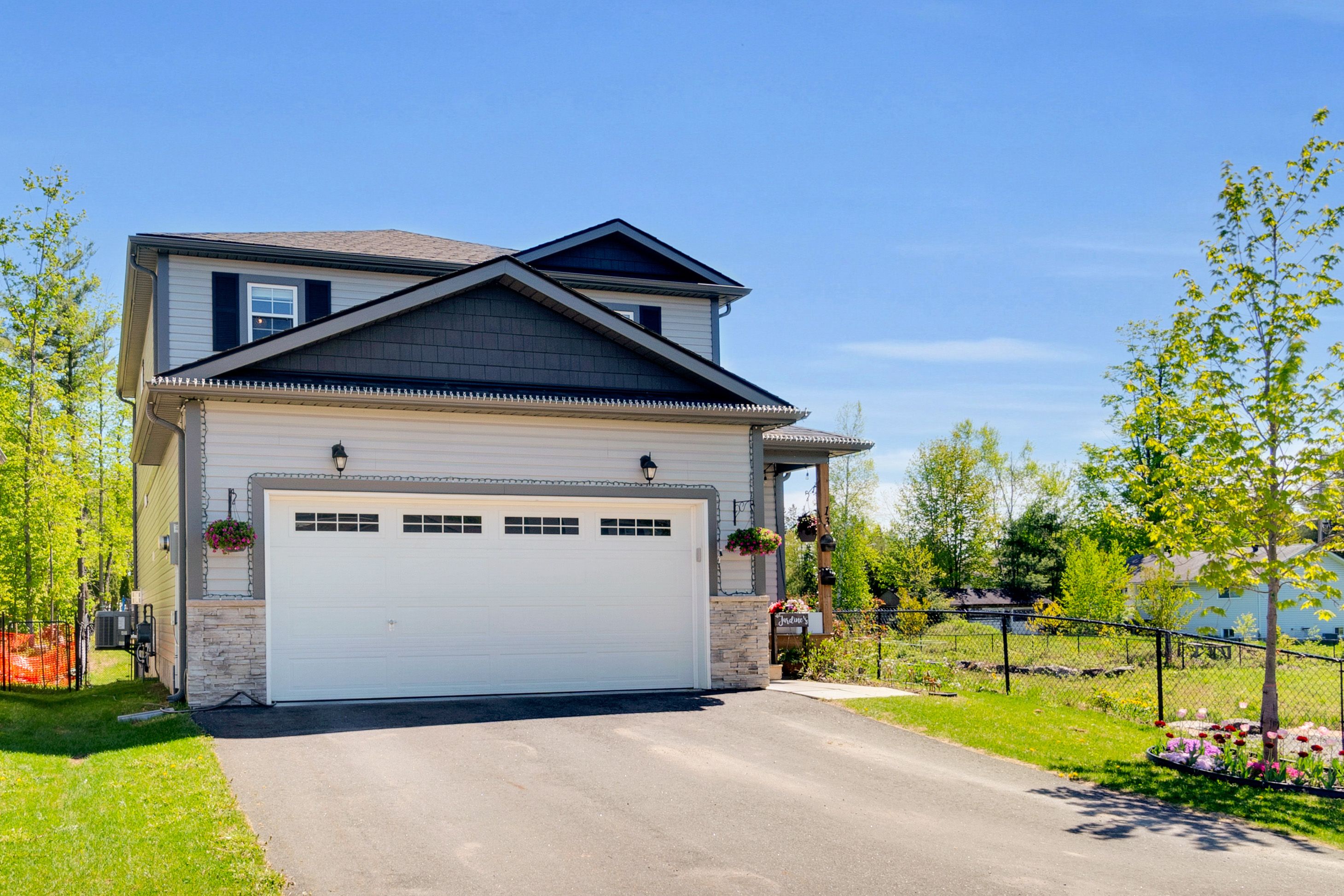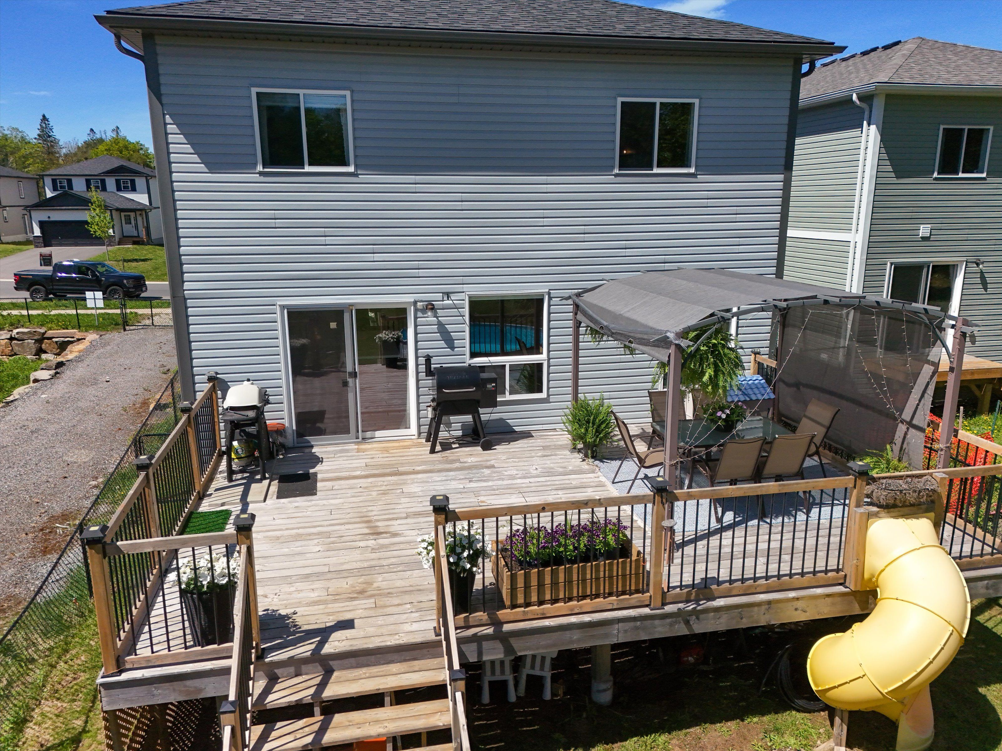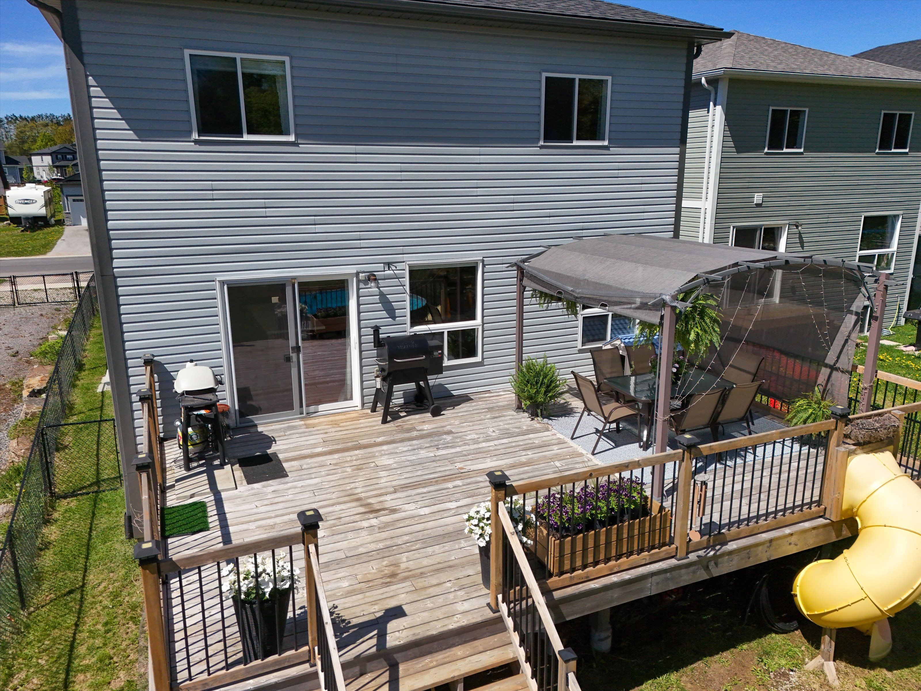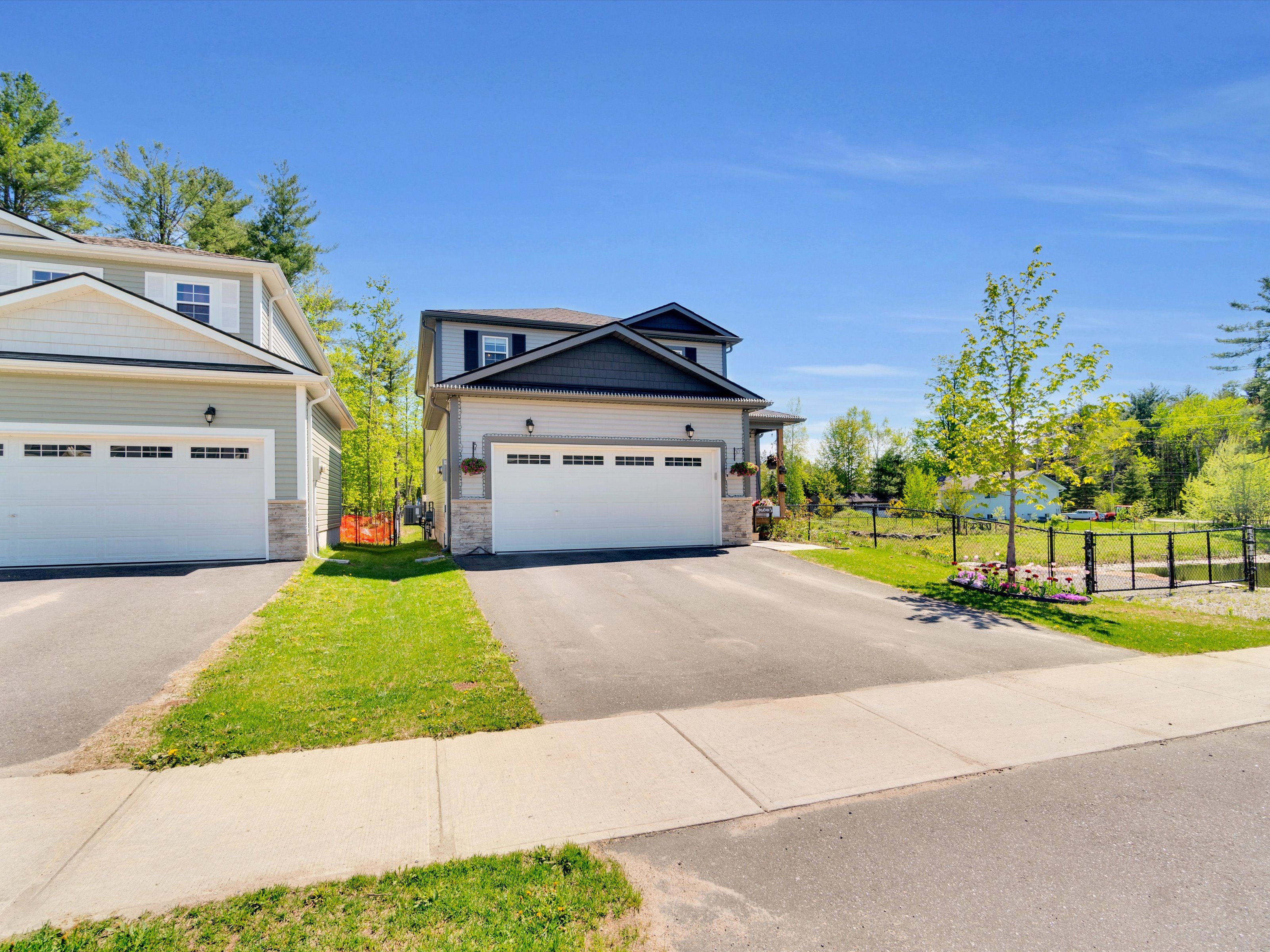 A beautifully designed family home in the heart of Bracebridge - close to schools, the Sportsplex, green spaces, and town amenities. Welcome to this beautifully presented 5-bedroom, 4-bathroom home, built in 2020 and ideally situated on a premium end lot with no neighbour to the west and a peaceful, fully fenced backyard backing onto a quiet green space. With an extra-deep lot and an extended back deck, this property offers privacy, space, and a tranquil setting that's hard to find. Inside, the home is thoughtfully designed with a bright, open-concept main floor featuring a sunlit kitchen with stone countertops, an oversized island, upgraded cabinetry, stylish backsplash, and stainless steel Samsung appliances. The spacious living area includes a gas fireplace, pot lights, and waterproof vinyl flooring - perfect for modern family living and entertaining. The main floor also includes a large front foyer, powder room, laundry room, and access to the double garage, which is extended for added storage. Upstairs, you'll find four generous bedrooms and a beautiful 4-piece main bathroom. The primary suite includes a walk-in closet and a luxurious ensuite with a deep soaker tub. The fully finished lower level offers incredible flexibility with a large rec/games room, media room (or fifth bedroom), 3-piece bathroom, and a kitchenette rough-in - plus a separate side entrance, making it ideal for an in-law suite. With its unbeatable location, thoughtful upgrades, and versatile layout, this is a home designed to grow with your family for years to come.