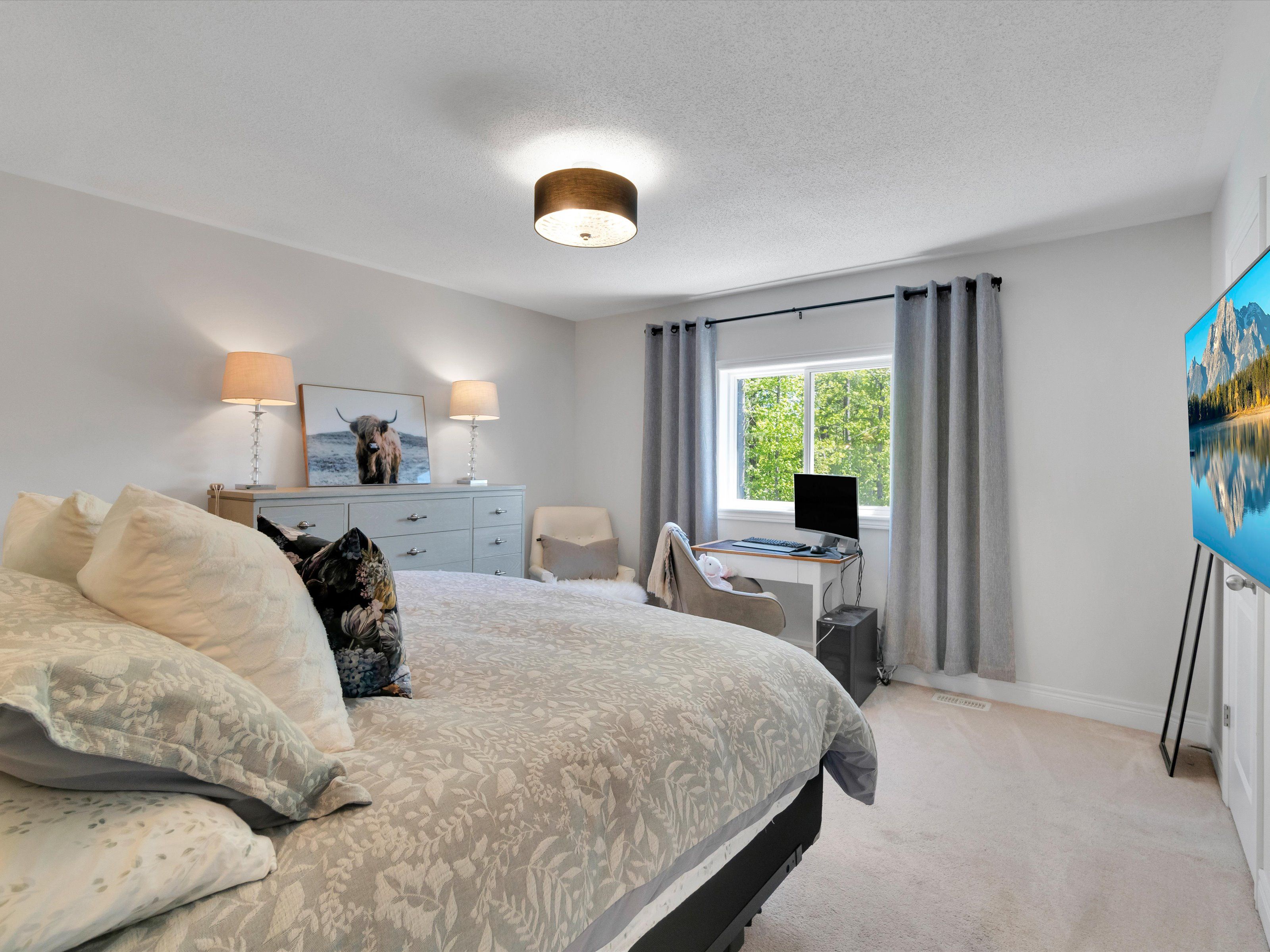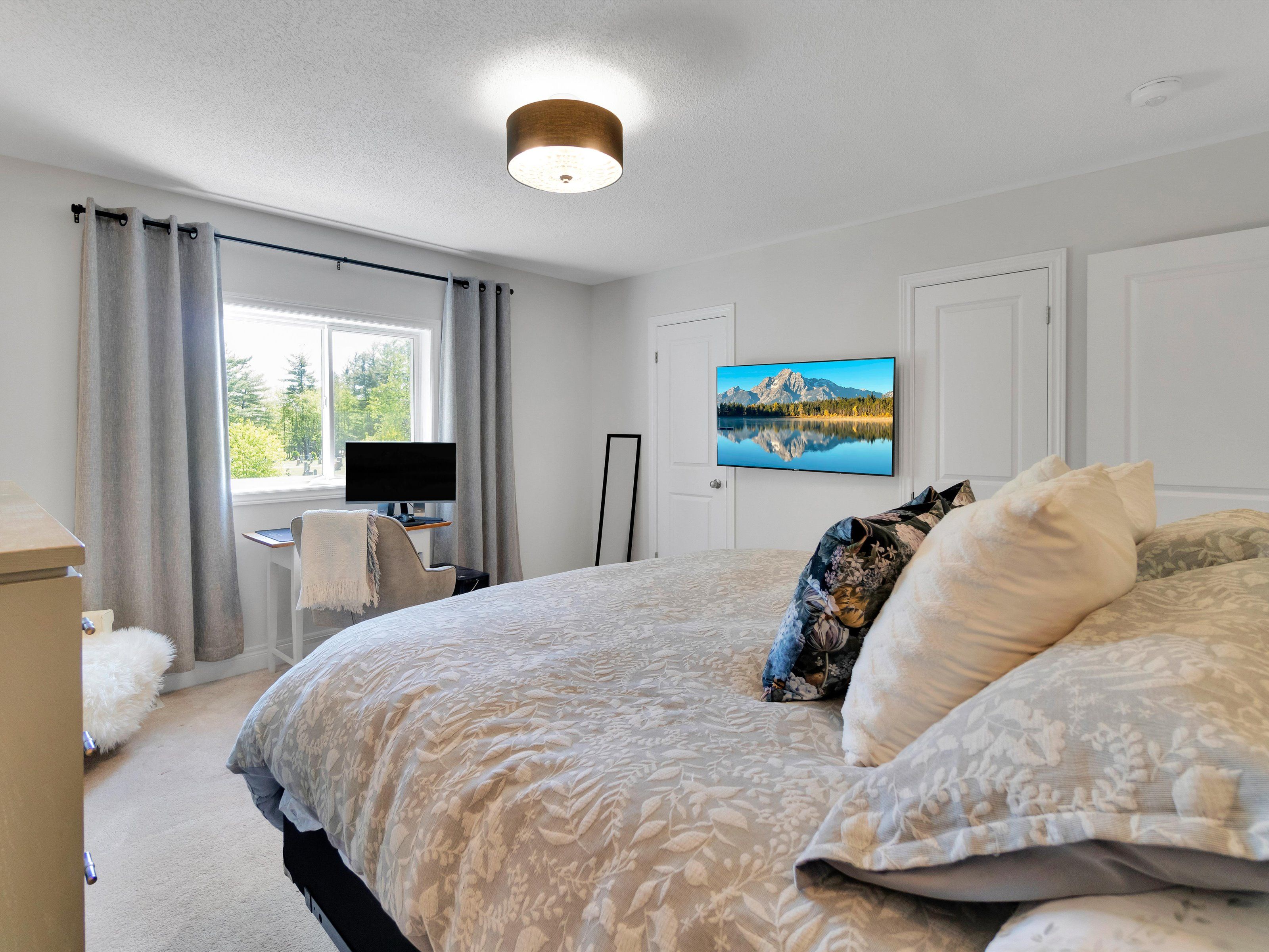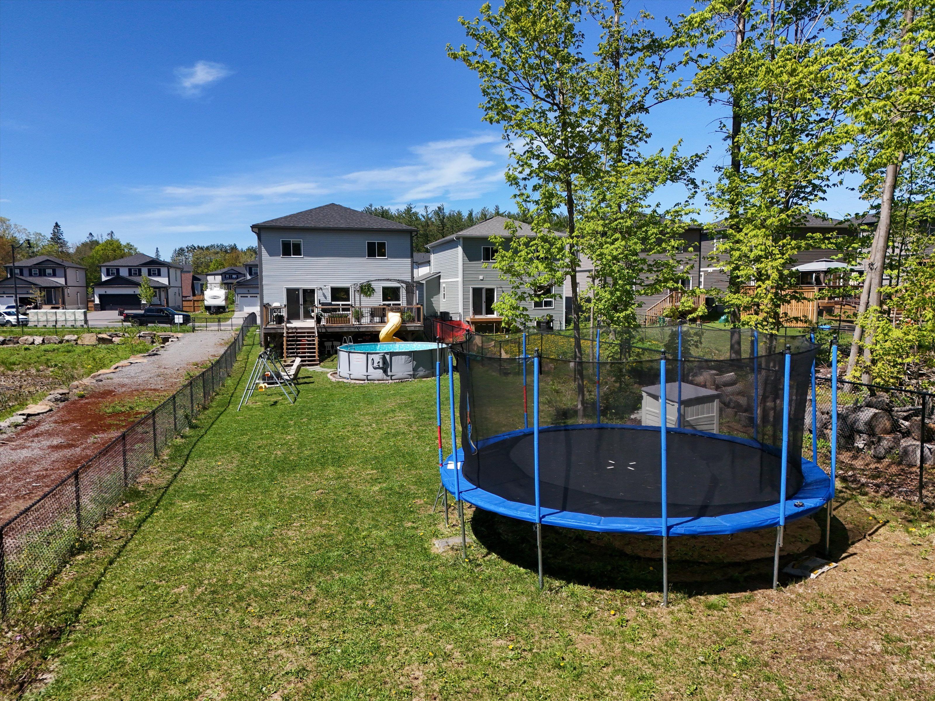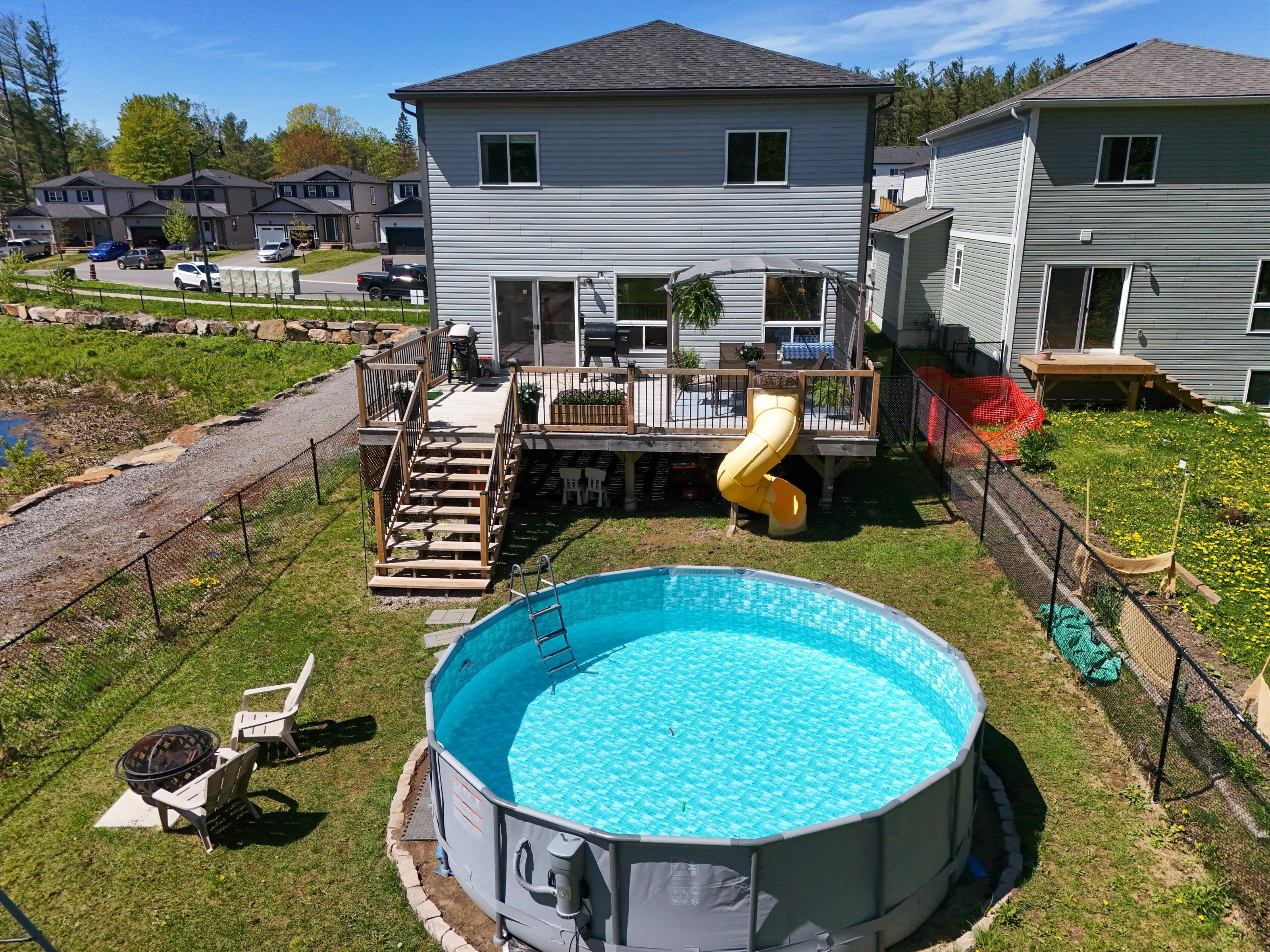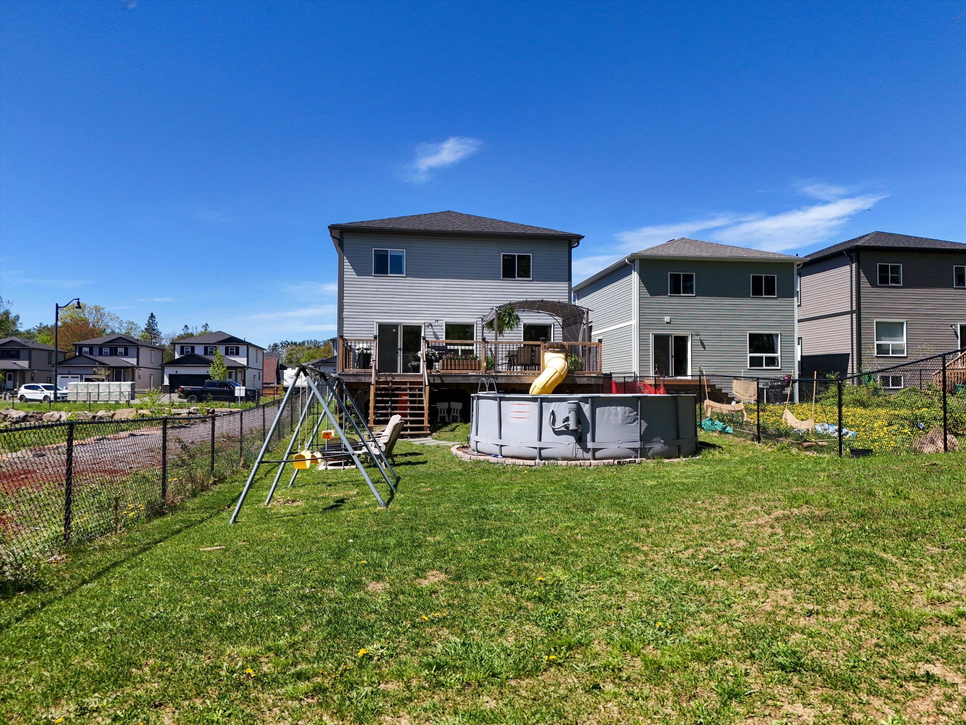 A beautifully designed family home in the heart of Bracebridge - close to schools, the Sportsplex, green spaces, and town amenities. Welcome to this beautifully presented 5-bedroom, 4-bathroom home, built in 2020 and ideally situated on a premium end lot with no neighbour to the west and a peaceful, fully fenced backyard backing onto a quiet green space. With an extra-deep lot and an extended back deck, this property offers privacy, space, and a tranquil setting that's hard to find. Inside, the home is thoughtfully designed with a bright, open-concept main floor featuring a sunlit kitchen with stone countertops, an oversized island, upgraded cabinetry, stylish backsplash, and stainless steel Samsung appliances. The spacious living area includes a gas fireplace, pot lights, and waterproof vinyl flooring - perfect for modern family living and entertaining. The main floor also includes a large front foyer, powder room, laundry room, and access to the double garage, which is extended for added storage. Upstairs, you'll find four generous bedrooms and a beautiful 4-piece main bathroom. The primary suite includes a walk-in closet and a luxurious ensuite with a deep soaker tub. The fully finished lower level offers incredible flexibility with a large rec/games room, media room (or fifth bedroom), 3-piece bathroom, and a kitchenette rough-in - plus a separate side entrance, making it ideal for an in-law suite. With its unbeatable location, thoughtful upgrades, and versatile layout, this is a home designed to grow with your family for years to come.