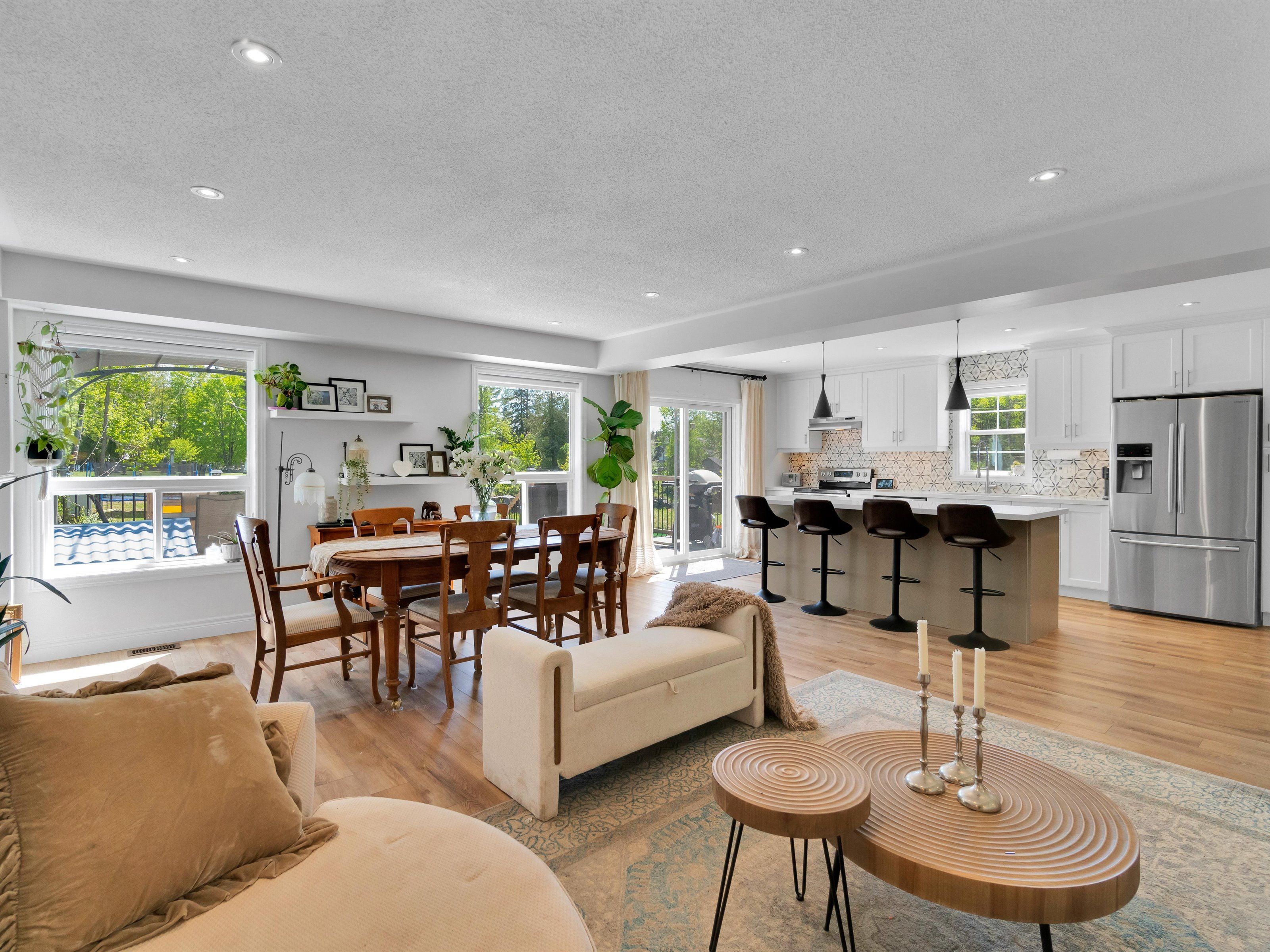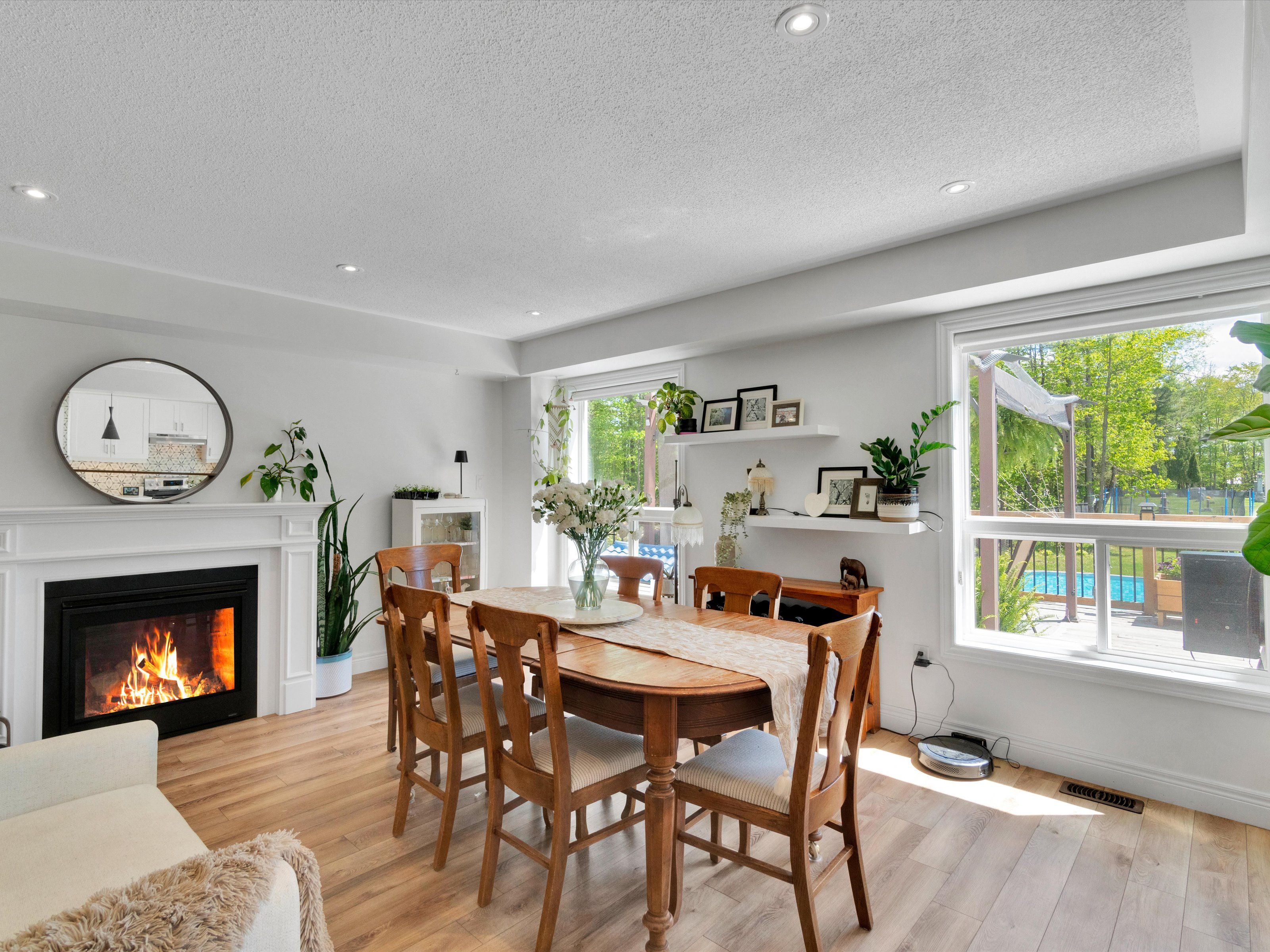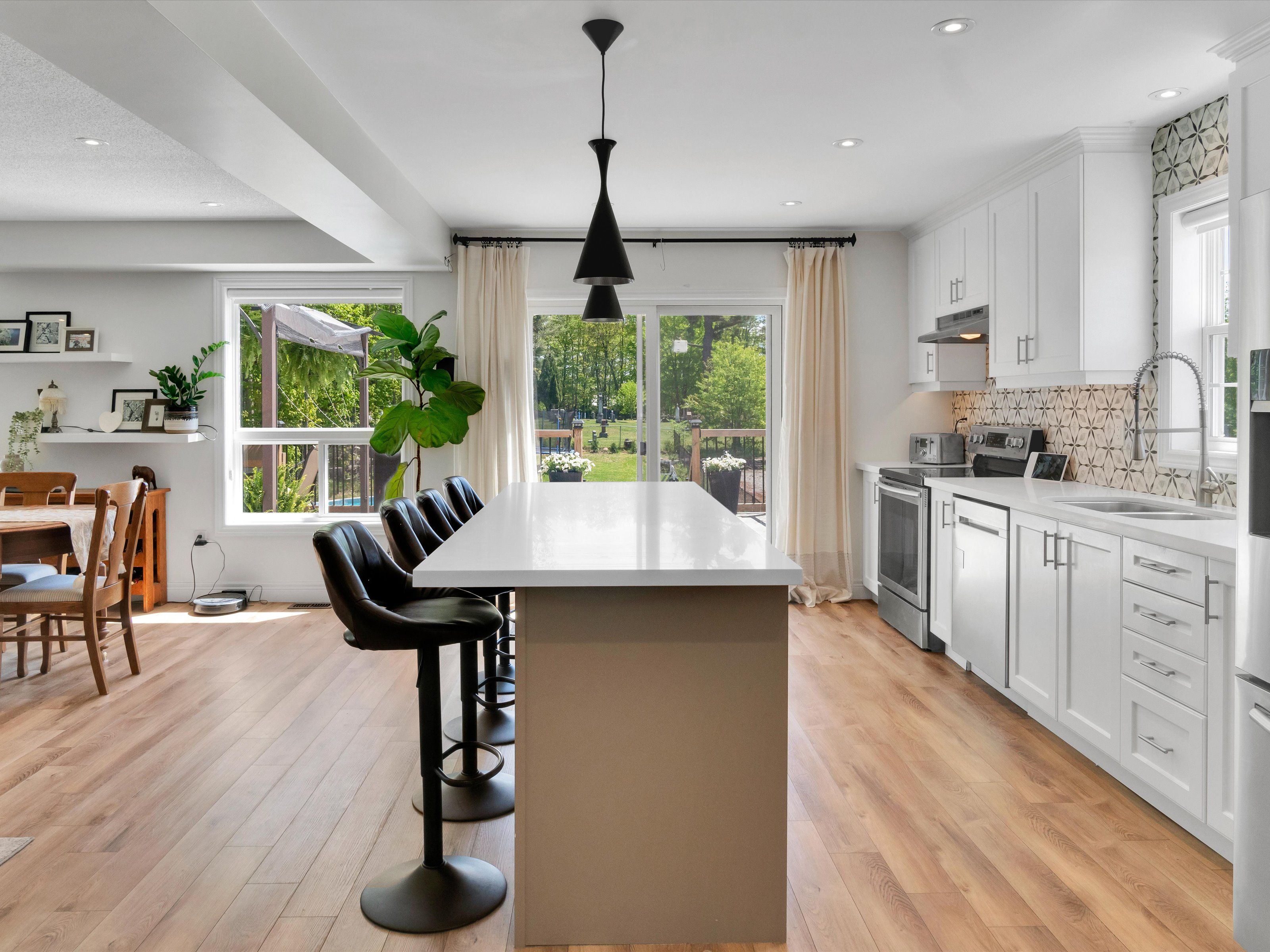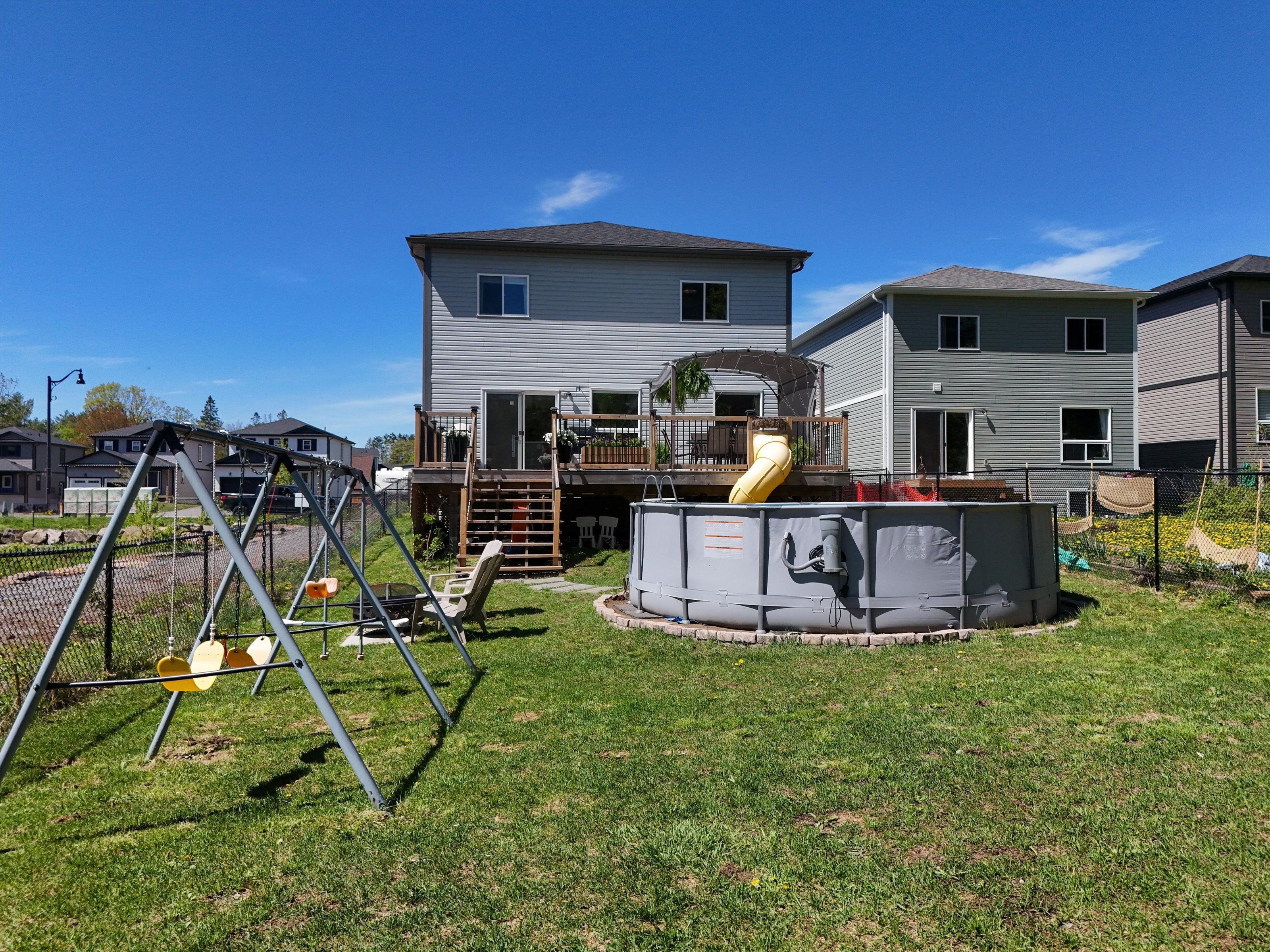 A beautifully designed family home in the heart of Bracebridge - close to schools, the Sportsplex, green spaces, and town amenities. Welcome to this beautifully presented 5-bedroom, 4-bathroom home, built in 2020 and ideally situated on a premium end lot with no neighbour to the west and a peaceful, fully fenced backyard backing onto a quiet green space. With an extra-deep lot and an extended back deck, this property offers privacy, space, and a tranquil setting that's hard to find. Inside, the home is thoughtfully designed with a bright, open-concept main floor featuring a sunlit kitchen with stone countertops, an oversized island, upgraded cabinetry, stylish backsplash, and stainless steel Samsung appliances. The spacious living area includes a gas fireplace, pot lights, and waterproof vinyl flooring - perfect for modern family living and entertaining. The main floor also includes a large front foyer, powder room, laundry room, and access to the double garage, which is extended for added storage. Upstairs, you'll find four generous bedrooms and a beautiful 4-piece main bathroom. The primary suite includes a walk-in closet and a luxurious ensuite with a deep soaker tub. The fully finished lower level offers incredible flexibility with a large rec/games room, media room (or fifth bedroom), 3-piece bathroom, and a kitchenette rough-in - plus a separate side entrance, making it ideal for an in-law suite. With its unbeatable location, thoughtful upgrades, and versatile layout, this is a home designed to grow with your family for years to come.