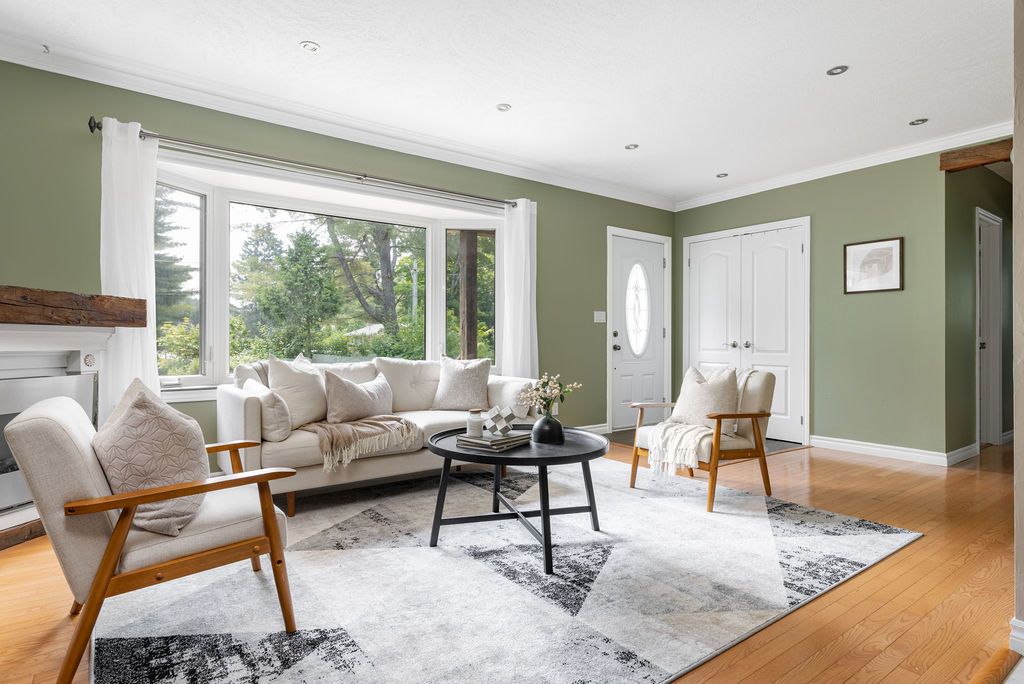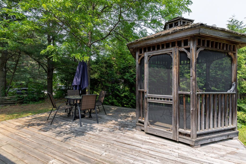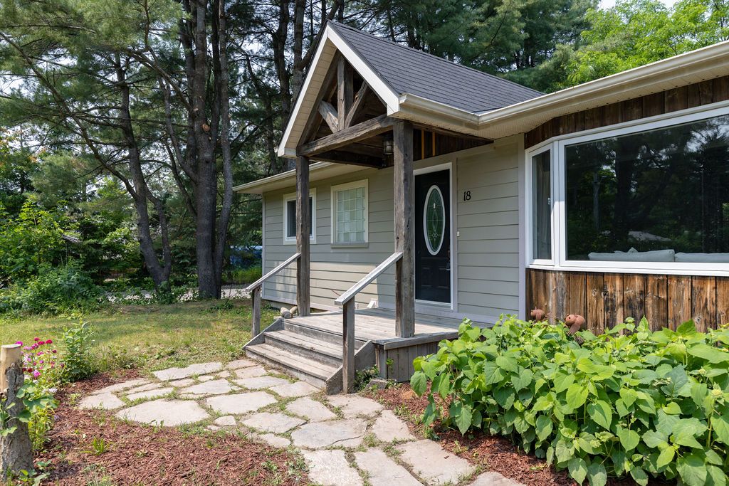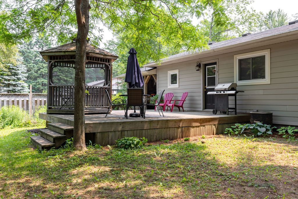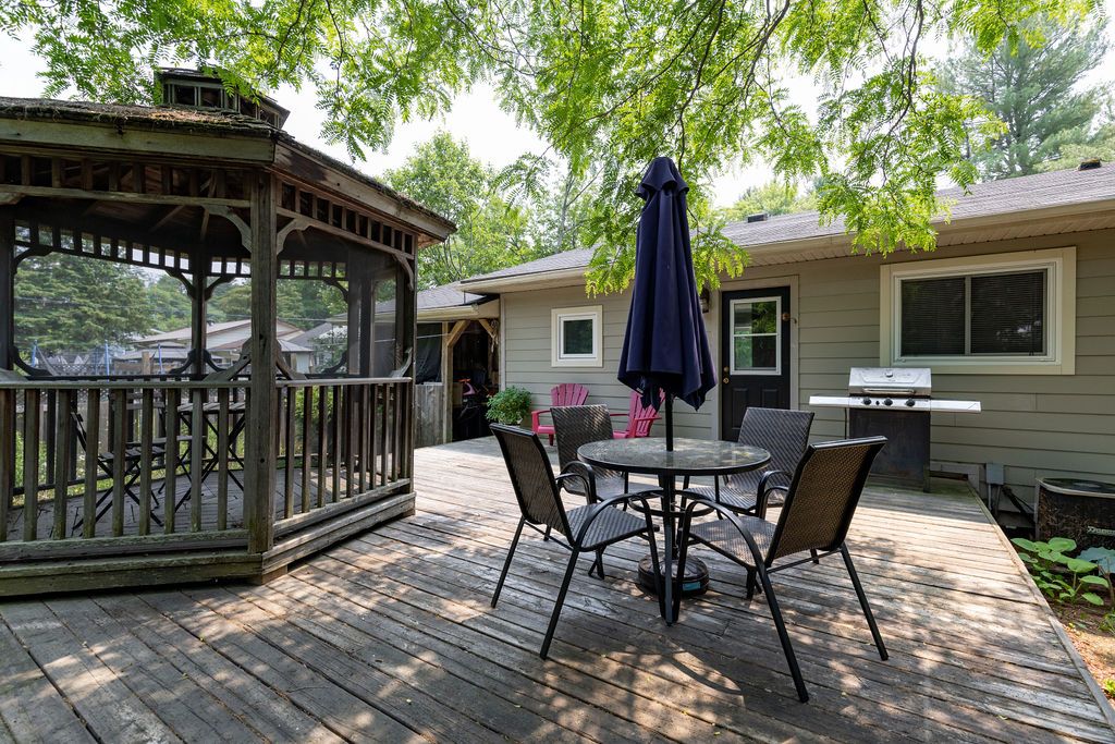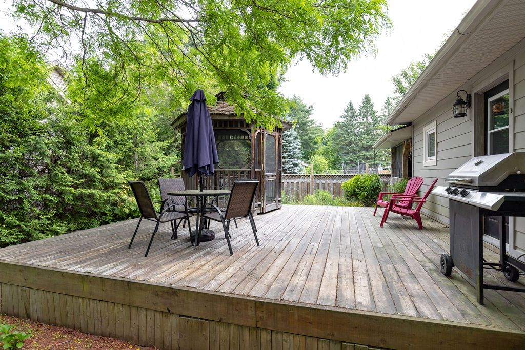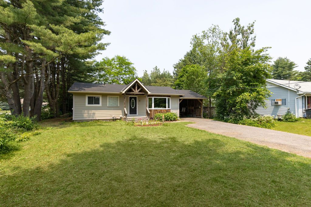 OPEN HOUSE SAT & SUN 11-1! Welcome to the stunning 18 Sander Drive, where convenience meets privacy in the heart of Bracebridge! This exceptional 4-bedroom, 2-bathroom bungalow offers a desirable location with easy access to shopping, dining, Wilson Falls walking trails, schools and Highway 11. Nestled on a deep lot adorned with mature trees, this home boasts numerous features, including a carport, fully finished basement, new nat gas furnace (2023), fire egress windows, air conditioning, full municipal services and a spacious back deck, complete with a screened-in gazebo. As you step inside from the covered front porch, you'll be greeted by a bright living room showcasing beautiful maple hardwood floors, a large bay window, and a cozy fireplace, creating an inviting ambiance. The kitchen boasts elegant wood cabinetry, stainless steel appliances generously sized pantry and multiple walkouts for easy access to the back deck convenient access to the carport.The main floor also features a spacious primary bedroom with a walk-in closet, a guest bedroom with two double-door closets, and 4pc bathroom. The fully finished lower level provides additional living space perfect for family and guests.
