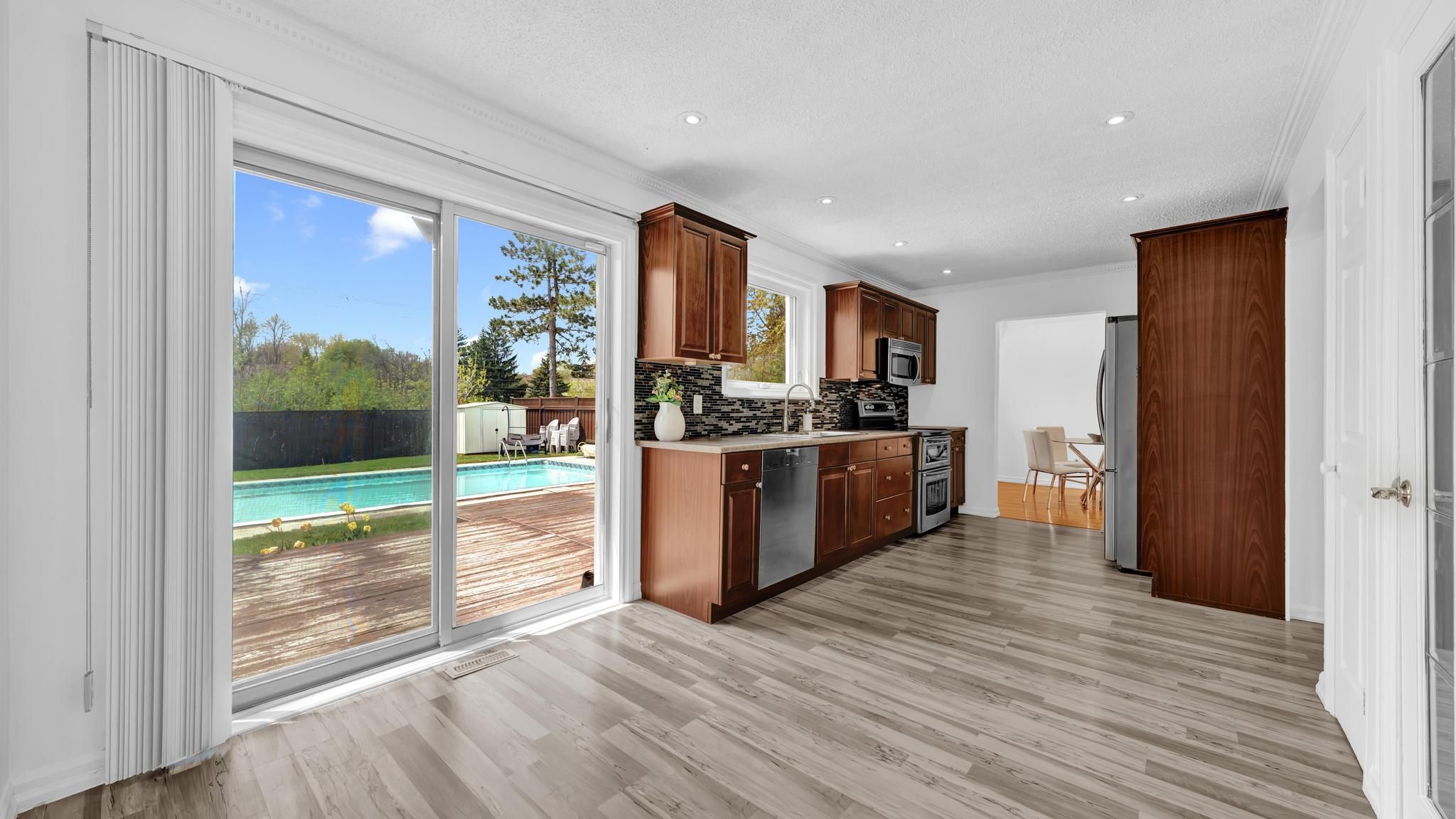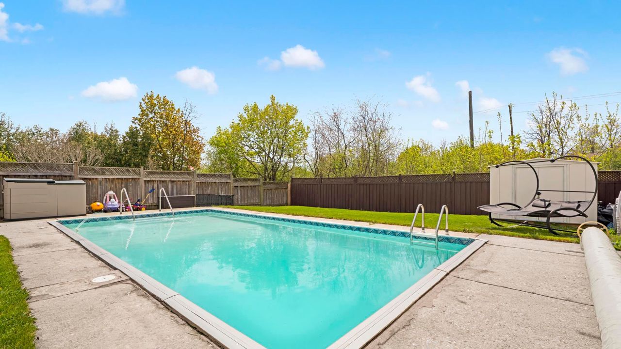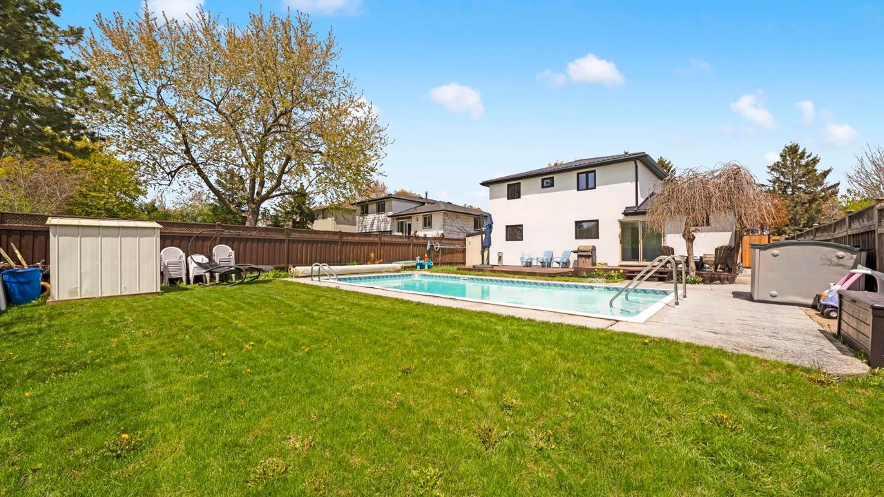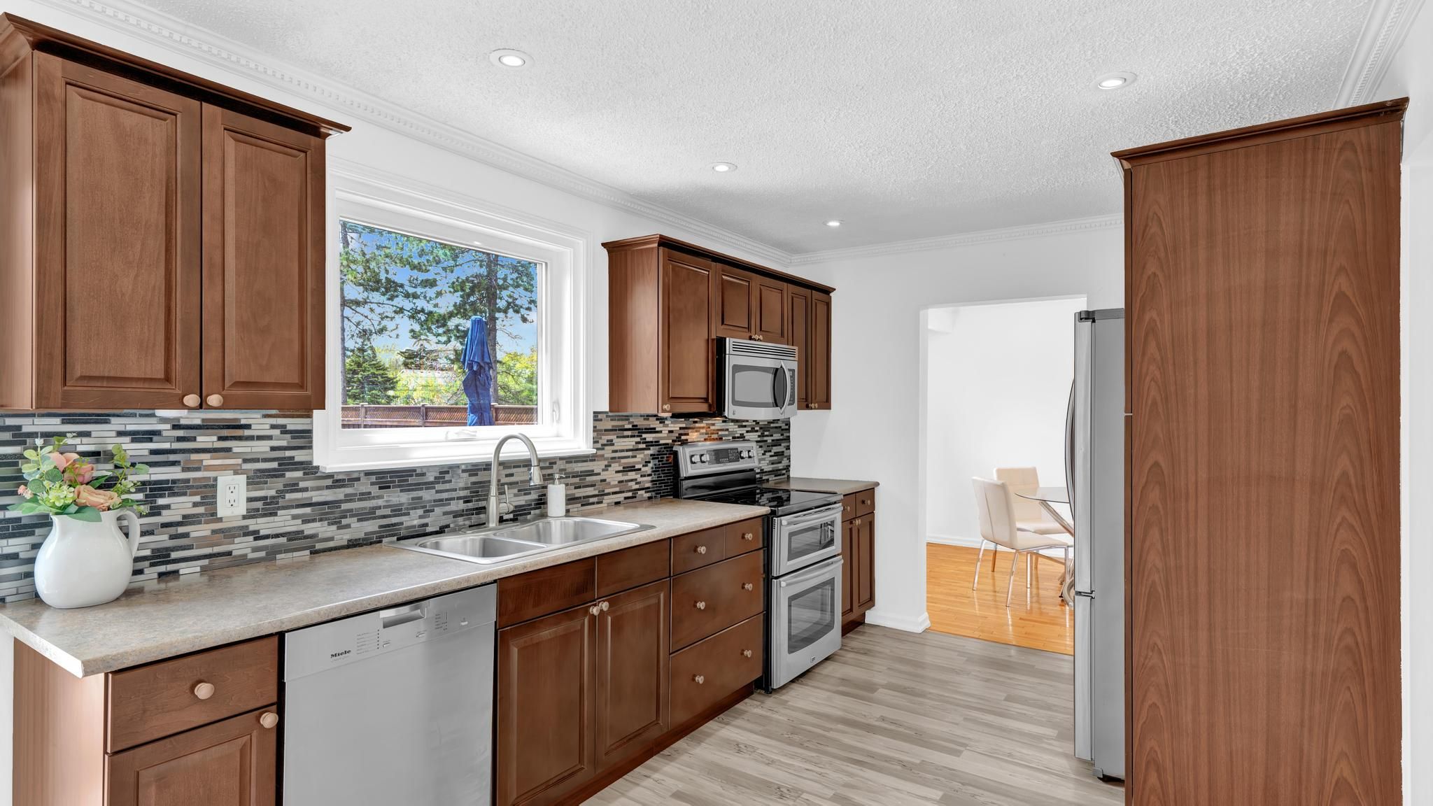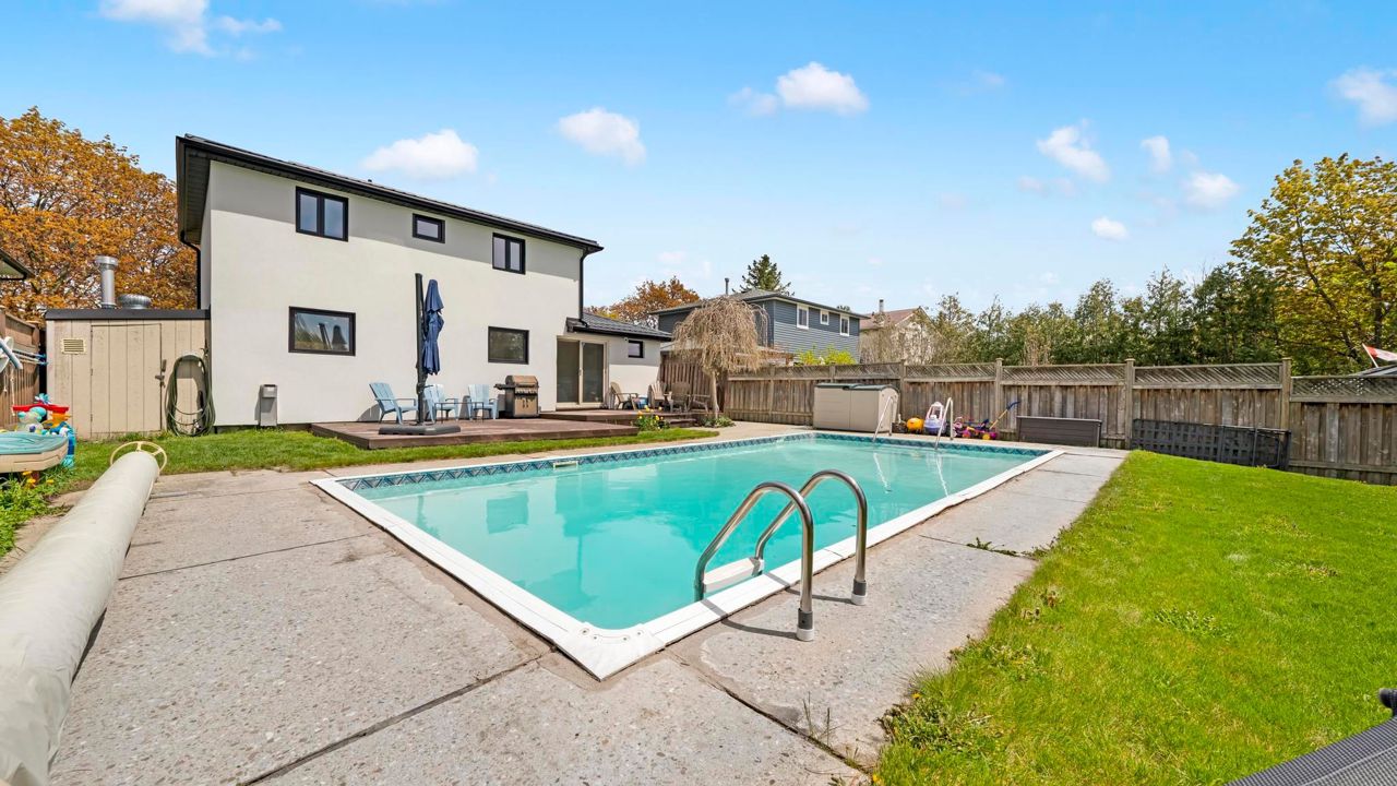 Your perfect family home is right here! This is truly a beautifully renovated (both inside and out) detached home on a large 50'x 120' lot facing a quiet, tree-lined residential street. The living room features a large picture window and a generous dining room. The ample-sized kitchen has newer kitchen cabinets, backsplash, and appliances; all stainless steel - fridge, stove, dishwasher, microwave, & beverage fridge. Walk out to the backyard oasis with a 32' x 16' in-ground saltwater pool - just in time for the summer and outdoor entertaining! There are no neighbours behind the backyard. Updates include pot lights, hardwood stairs with contemporary railings, new windows, double insulation, Alabaster white stucco, a new black metal roof, new garage door. The large rec room in the basement has new vinyl flooring and a gas fireplace. The laundry room has brand new top-of-the-line stackable washer & dryer.Other upgrades: Smart camera home security system, wireless smart thermostat. Don't miss the opportunity to make this gorgeous home yours!
