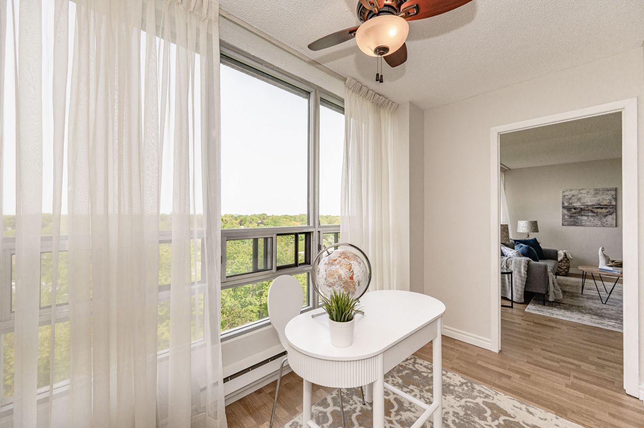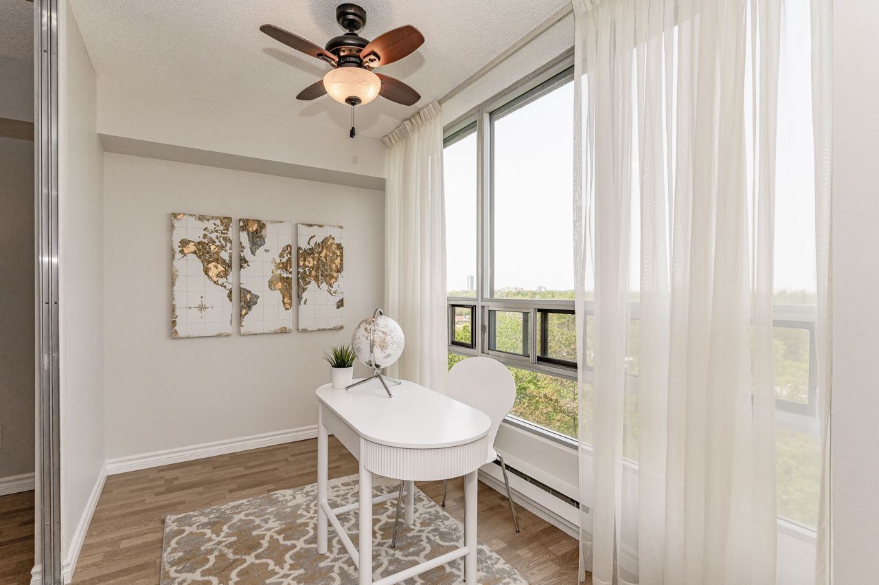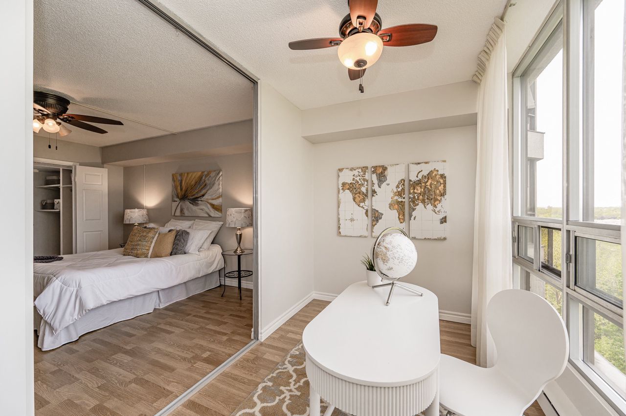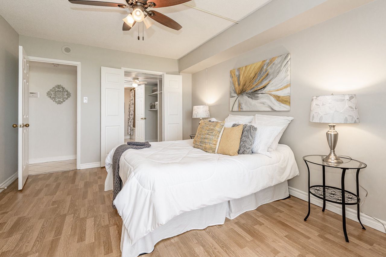 Condo hunting but everything is so small? Don't settle for a tiny box in the sky! This spacious 1055 sq ft condo is the nicest 1 bdrm + den on the market on Mill St. this year! Truly move-in ready to provide a low maintenance lifestyle, it’s freshly painted and all the big items are done incl. kitchen reno, st/steel appliances, ensuite reno, heat pump & updated flooring. 8th floor east view over the creek and green canopy means loads of natural light through the day but not the west-facing heat. The solarium/den is a perfect work from home space. An ideal location for walking the Etobicoke Creek trail system right behind you, shopping & services at Shoppers World & Brampton Mall, bus stops right outside the door, ZUM and transit along Hurontario. Building amenities incl. indoor pool, sauna, golf practice room, billiards, party room w/ kitchen, tennis court, gazebo & BBQs. These Kaneff-built condos are high quality with on-site property management and 24/7 front desk security.*This is a No Pets, No Smoking Condominium Building * A quick closing is available so call to book your viewing today, don't miss out.