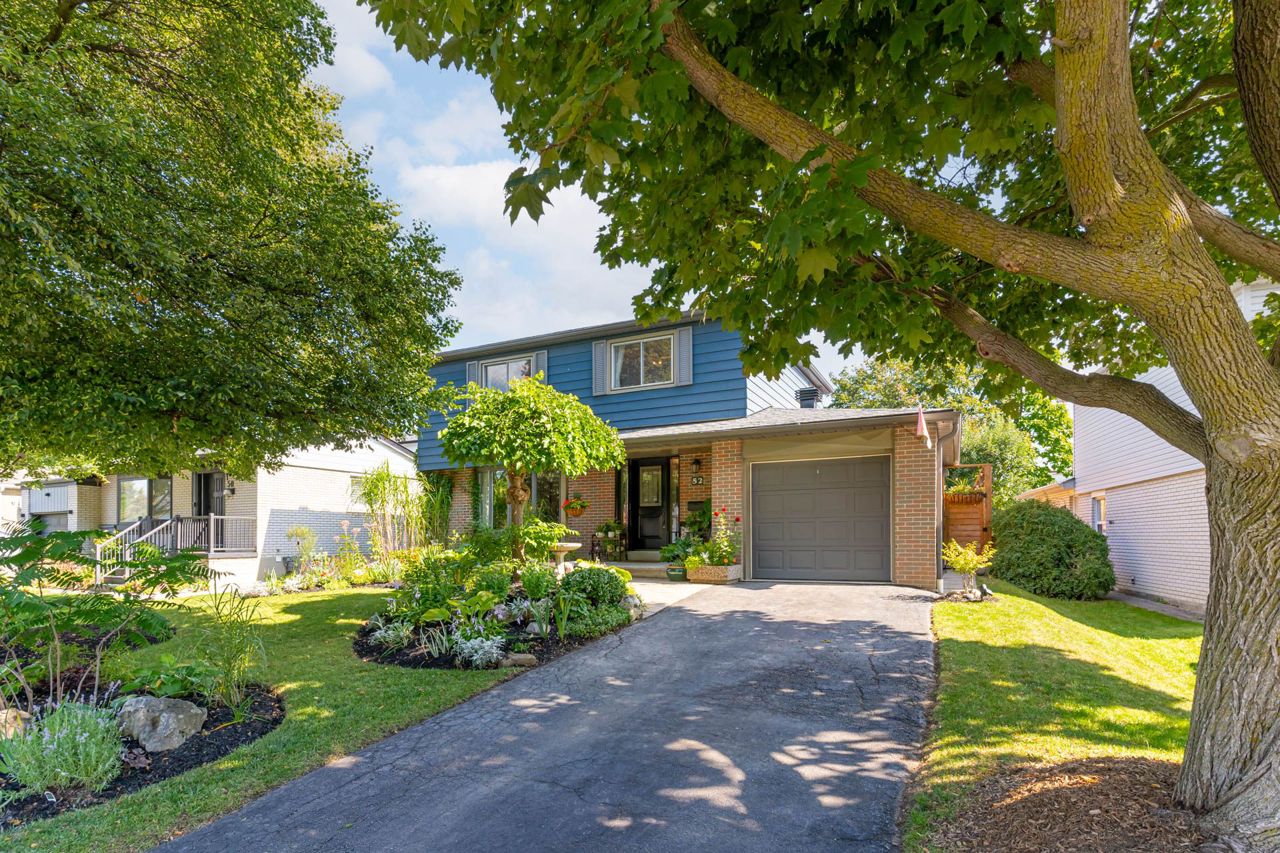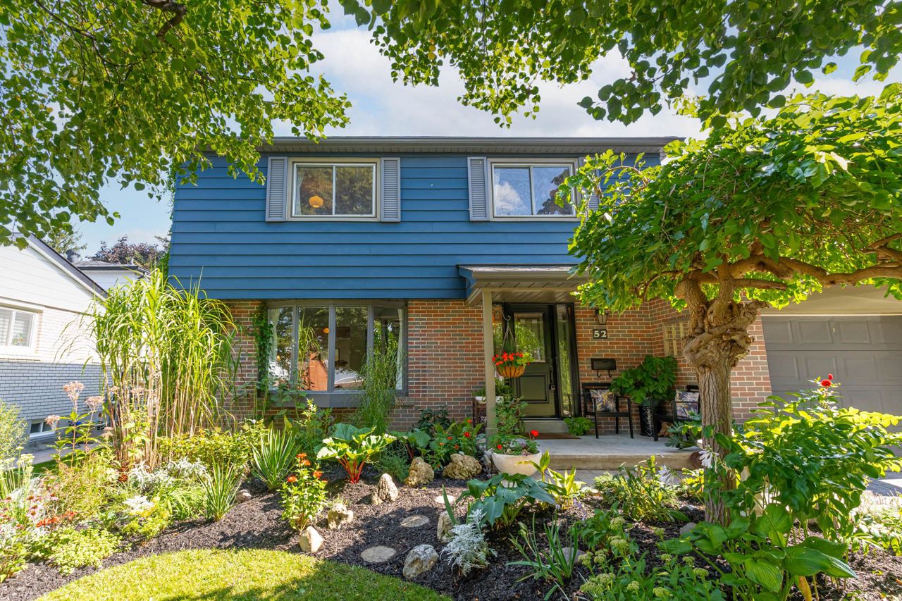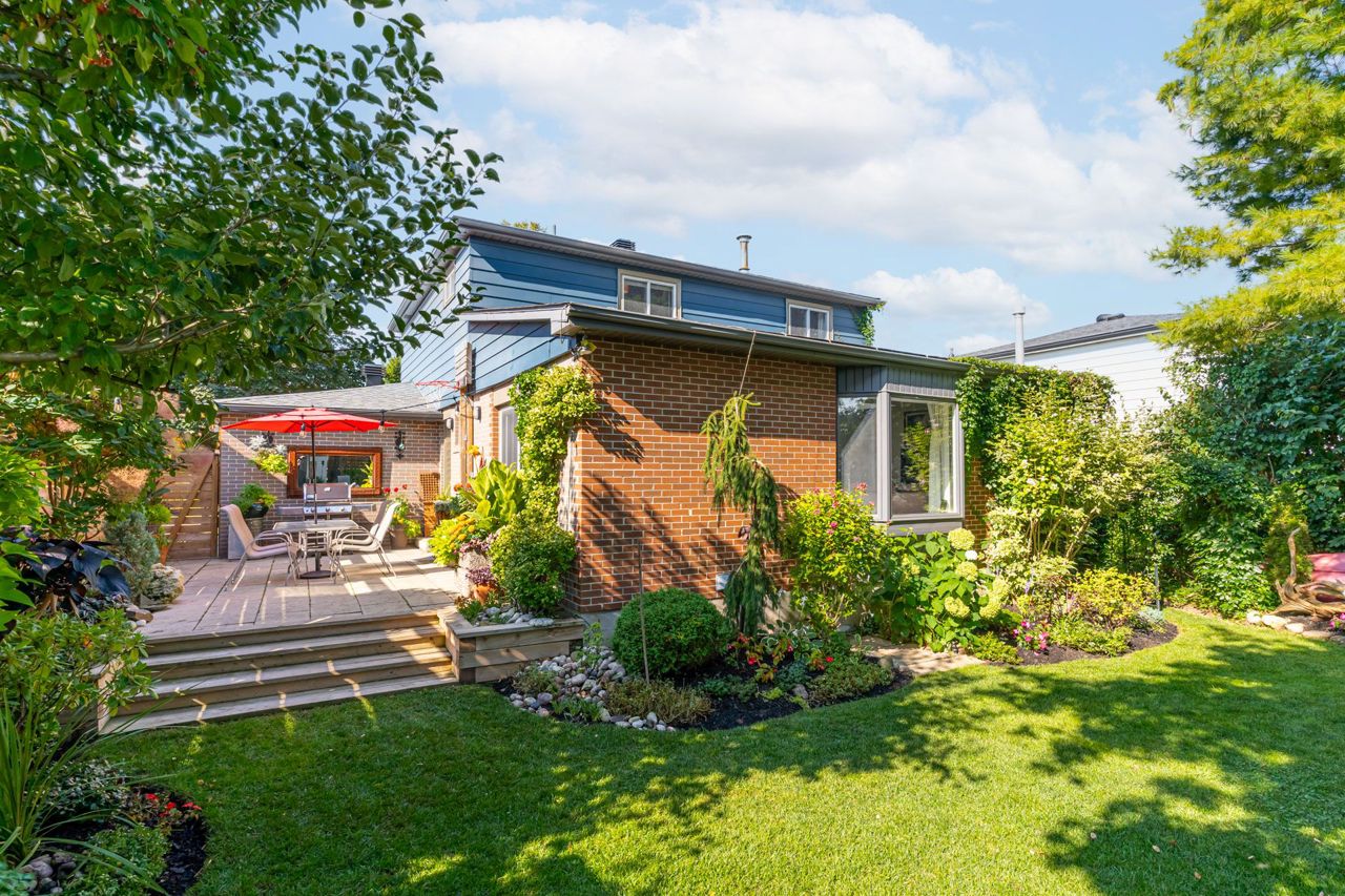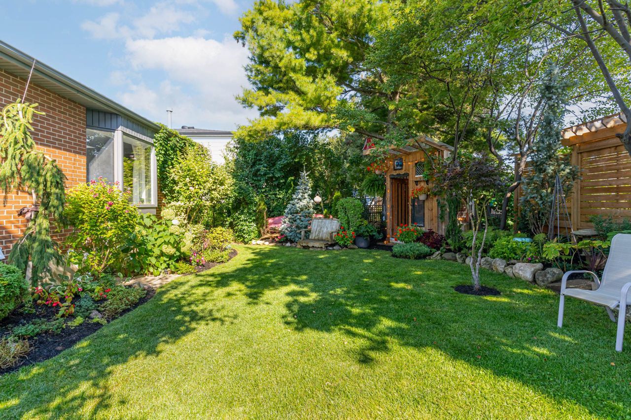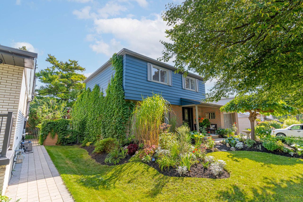 Beautiful two-storey detached home with an extra large sunfilled open concept family and dining room addition featuring two skylights, large bay window allowing for great views of the backyard, gas fireplace and a walkout to patio with a water feature. Upgraded modern gourmet kitchen with ample tall white cabinetry, backsplash, quartz counter tops, extensive pullouts, double stainless steel farmers sink, huge pantry, breakfast bar with dining area, stainless steel appliances featuring a brand new refrigerator (2023). Formal living room with bay window and open concept den. Renovated powder room and main bathroom. Four spacious bedrooms, primary bedroom with his/her closet. Dark stained hardwood floors throughout main level. Large recreation room with above ground window. Serene, private berm yard with established perennials native plants, mature trees and fruit bearing shrubs. Custom playhouse and storage shed. Truly an idyllic home in executive Ridgehill Manor neighborhood.