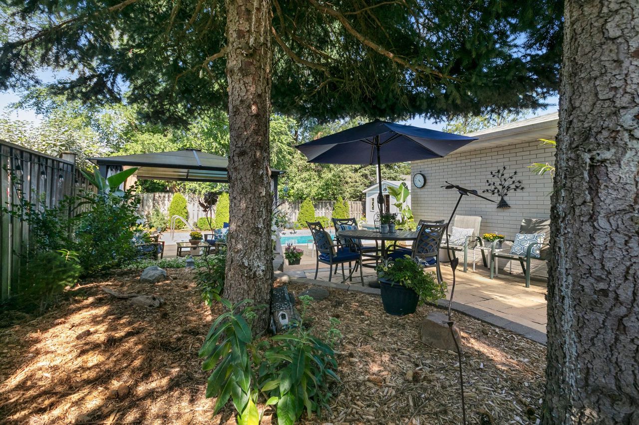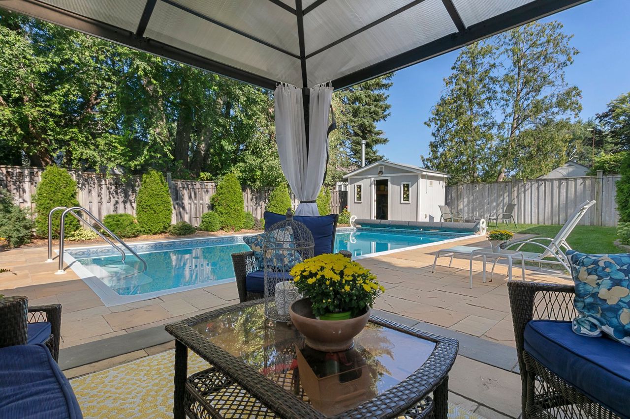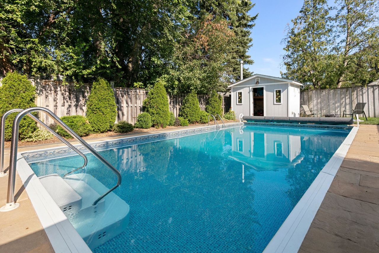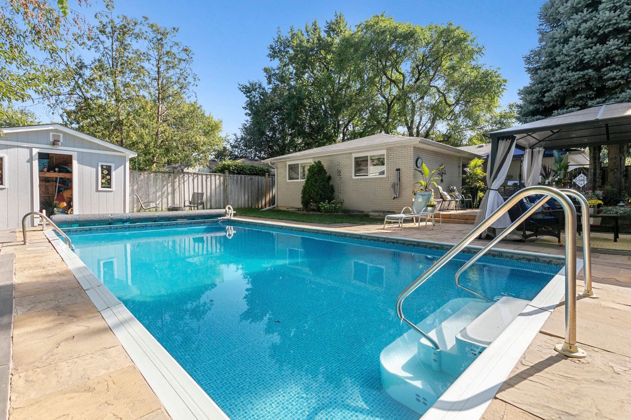 You will love living here in your gorgeous four-bedroom two full bath Peel Village bungalow. Ultra-private backyard oasis including in-ground pool, stone walkway & powered pool house/shed. Meticulous landscaping, and minimal lawn maintenance. The upper level features a light-filled eat-in kitchen, white cabinets, pot lights, ceramic tile and crown moulding.Expansive living room with a beautiful picture window, hardwood,& crown moulding. Separate dining with crown moulding and walkout to patio.Two generous-size bedrooms, both with hardwood protected by broadloom and large closets. Natural light galore throughout the main level. A separate side-entrance leads to the lower level featuring two additional bedrooms (one without a window), four-piece bathroom, office area, and an over-sized family room. The entire lower level is comfortably finished with wall-to-wall broadloom. Separate laundry room with window, sink, pot lights and folding counter.Move-in ready,an absolute bungalow delight!Many updates throughout including new garage door, windows, countertop & freshly painted – see spec sheet for all updates. Close to highways, transit, shopping & network of schools and parks.