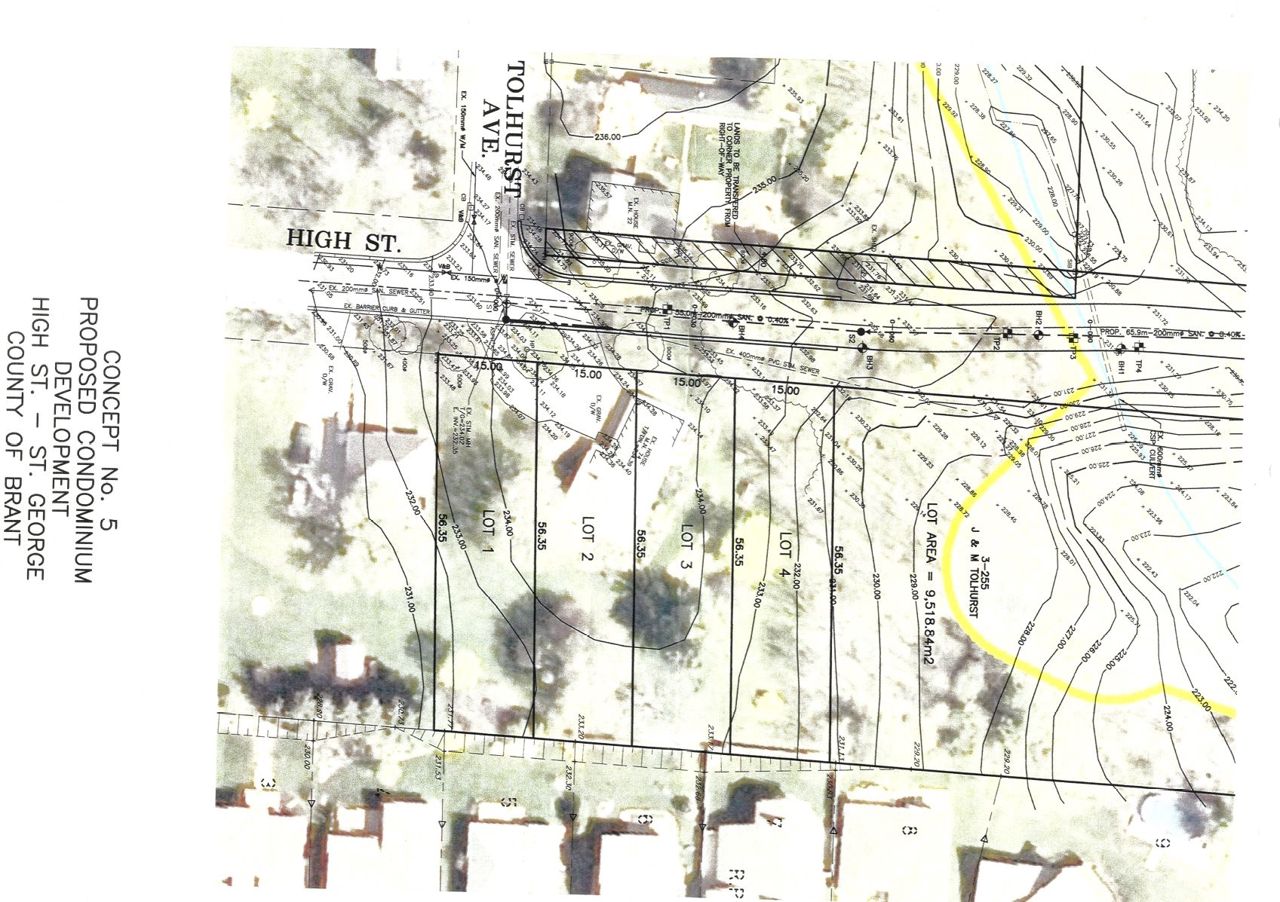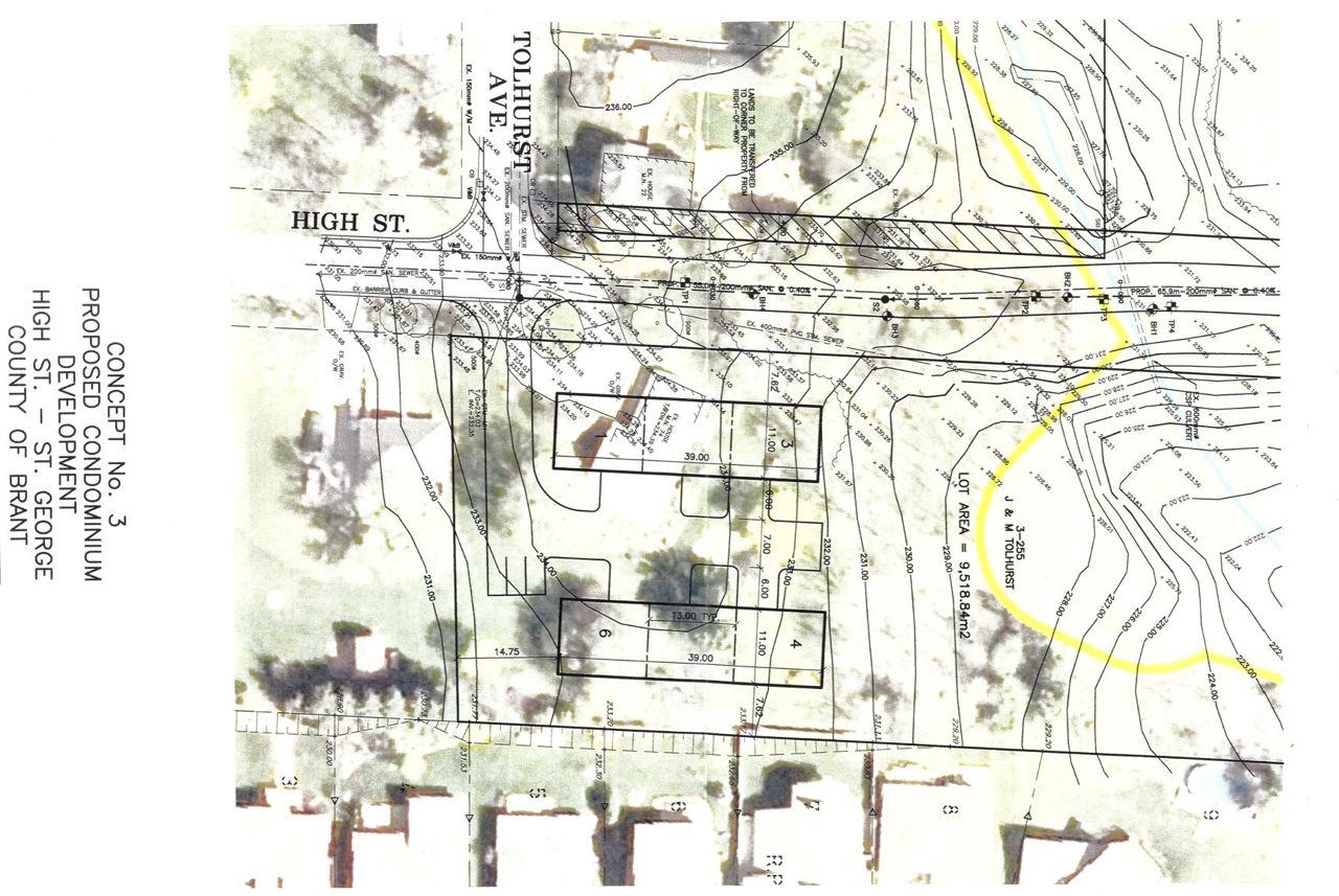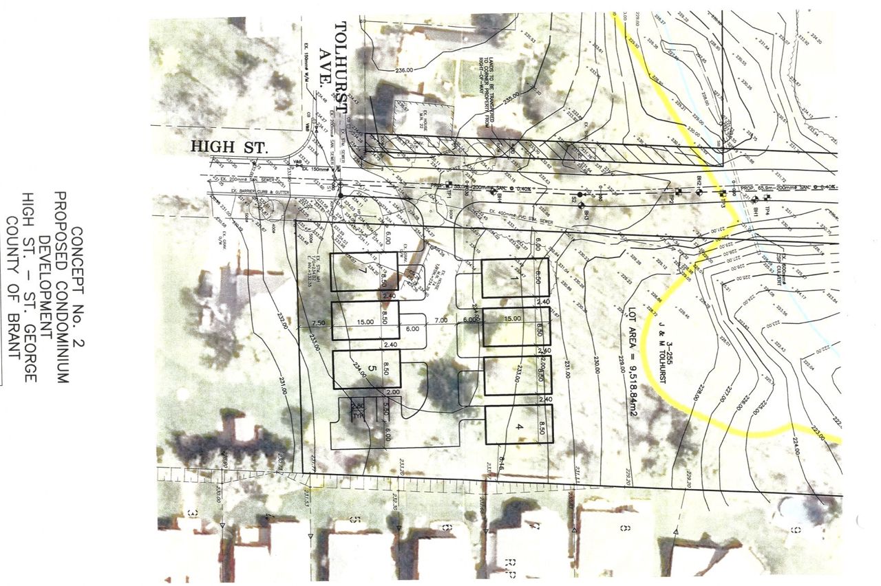 A Rare opportunity to purchase a home with 2.2 acres of potential development land with R2 zoning with some natural heritage in the rapidly expanding County Of Brant. Located in the village of St. George, surrounded by multi-million dollar homes, steps from the downtown, restaurants, schools and shopping, yet still surrounded by nature, Parks, and trails with fabulous views. This property offers the perfect blend of privacy and convenience. The property also has a beautiful 1500 sq ft brick bungalow with 3 bedrooms, 2 bathrooms and 2 car garage with plenty of parking. An investigation of the development potential of the land was carried out in 2007, and Concept drawings have been completed for a number of proposed developments for the property, such as 9 townhomes, condominiums, and 4 single-family detached homes. Ask the listing agent for details. The buyer or Buyer's solicitor is required to do their own due diligence for all zoning, building permits, and permitted uses.3D Virtual tour available, click on additional pictures below.