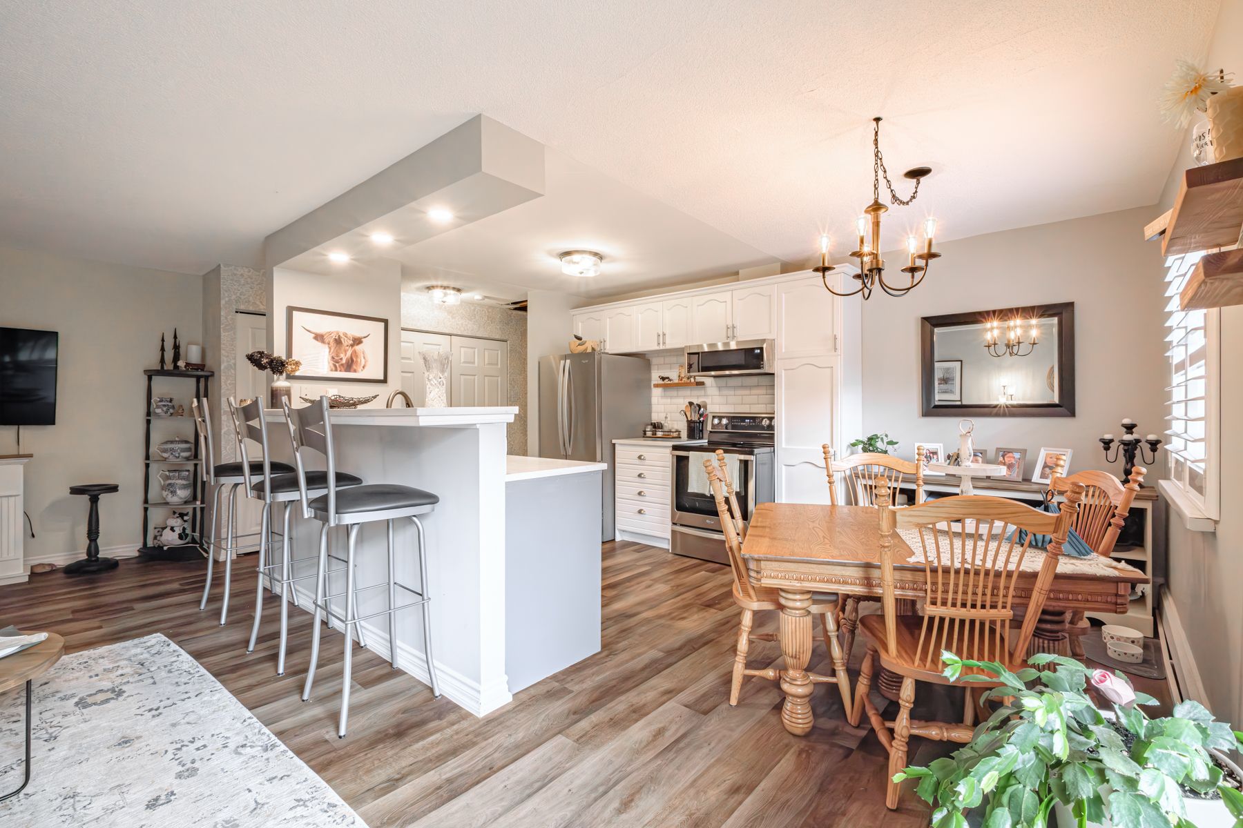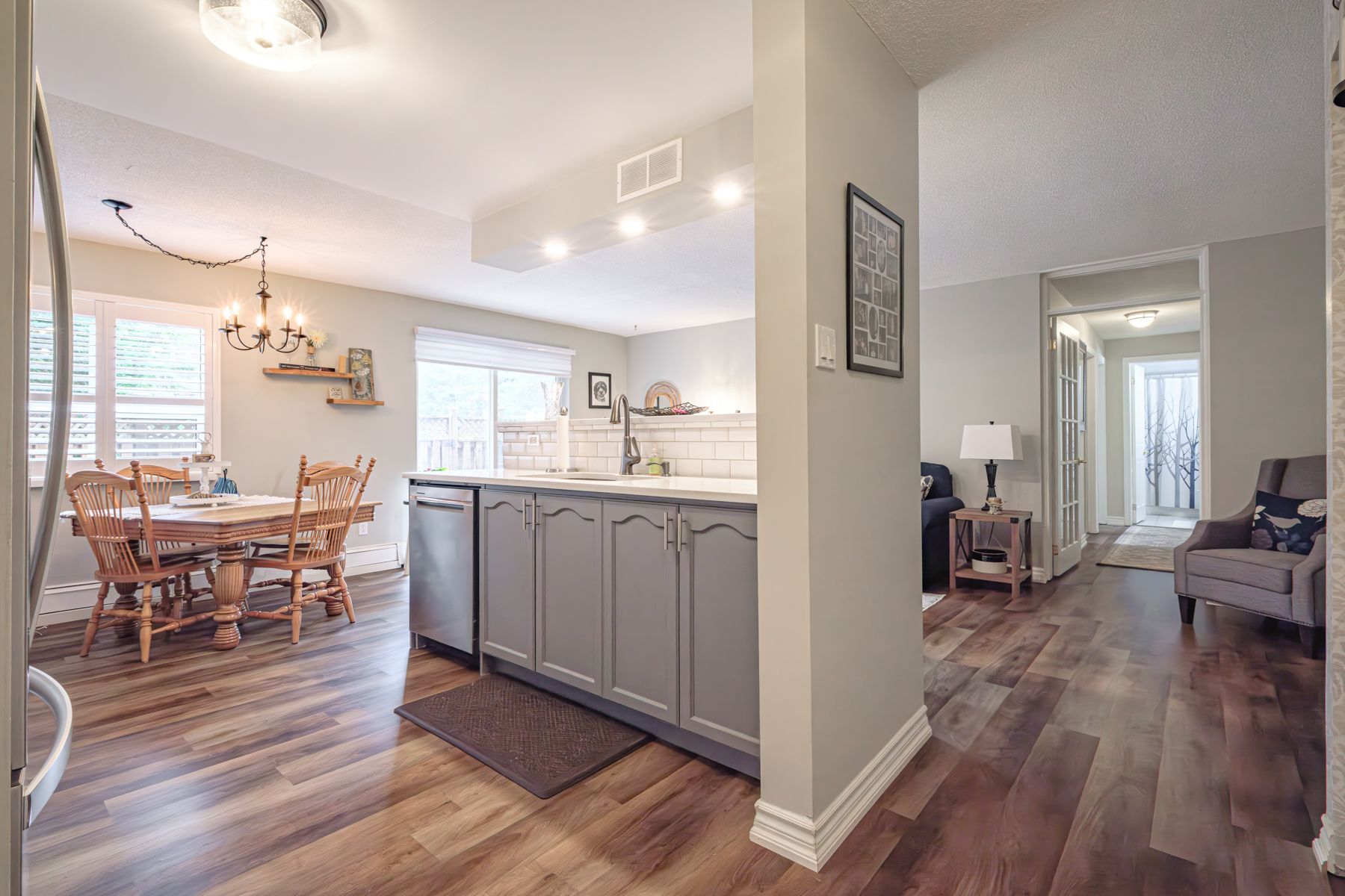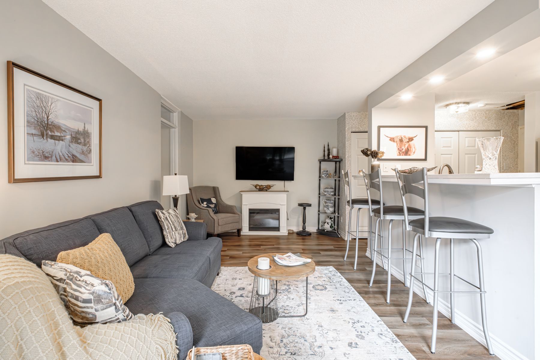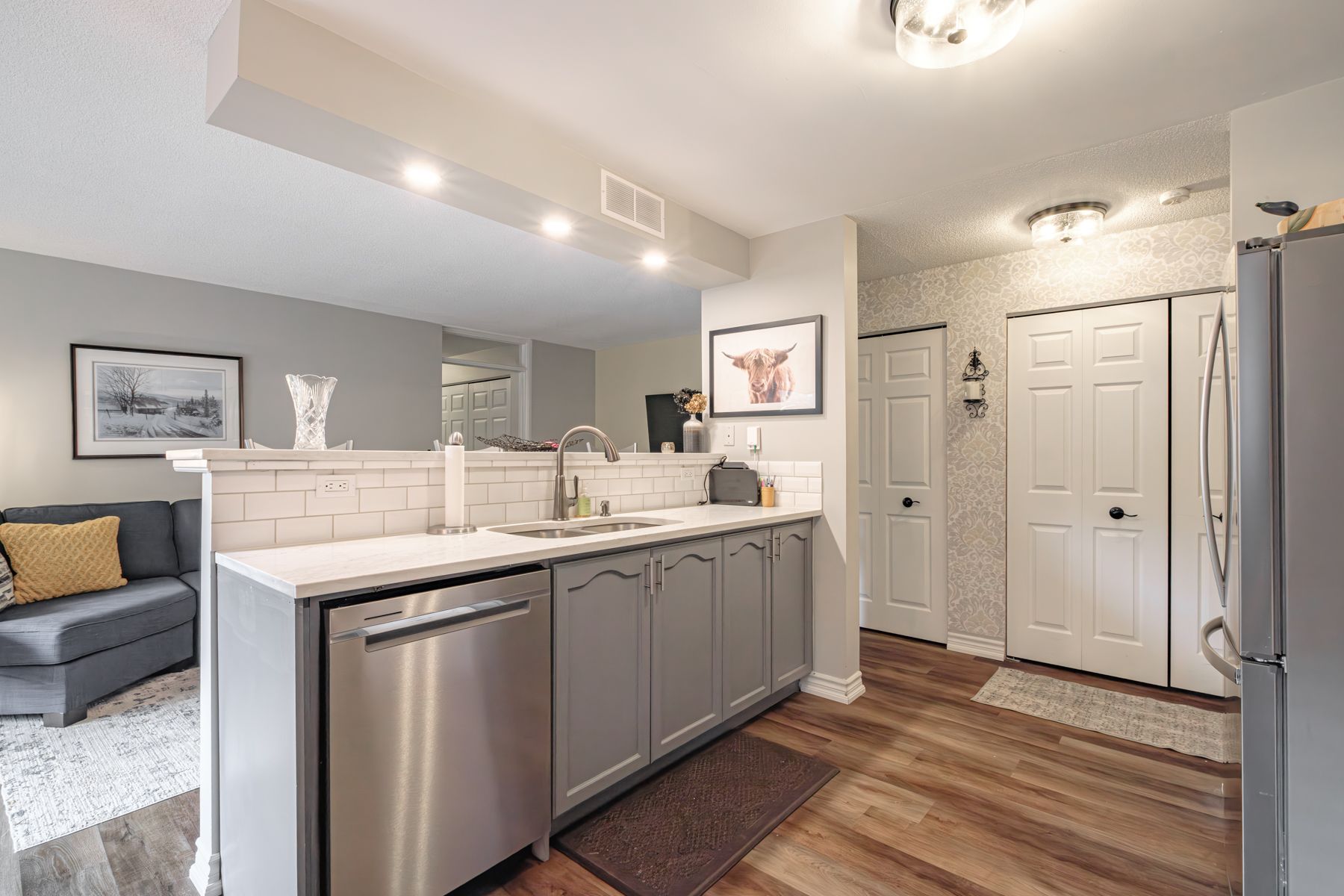 This is the perfect starter apartment in the well cared for East Gate condo complex. Desirable main floor unit with lobby access and Courtyard access. Tastefully decorated & modern lighting fixtures throughout is this 2 bedroom 1 bathroom condo unit. Open concept kitchen with breakfast island, potlights, quartz countertops, s.s microwave range, s.s b-in dishwasher, s.s fridge and stove. Cozy breakfast nook eating area and spacious living room with electric fireplace and patio door walk out to your own private fenced in patio! All updated luxury vinyl plank flooring and custom window coverings through out. 4 pc bathroom with ceramic tiled flooring and tub surround. Convenient in suite laundry and loads of closet storage in the apartment. Located right off the courtyard with your own gated entrance to your private patio. Meticulously maintained gardens and landscaping. Super Echo Place location close to the 403 HWY, schools, parks and shopping.