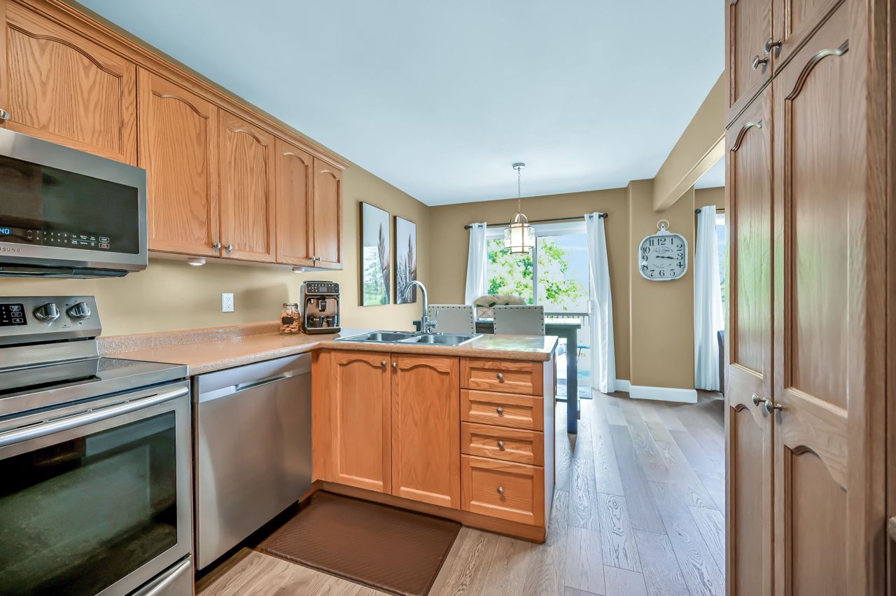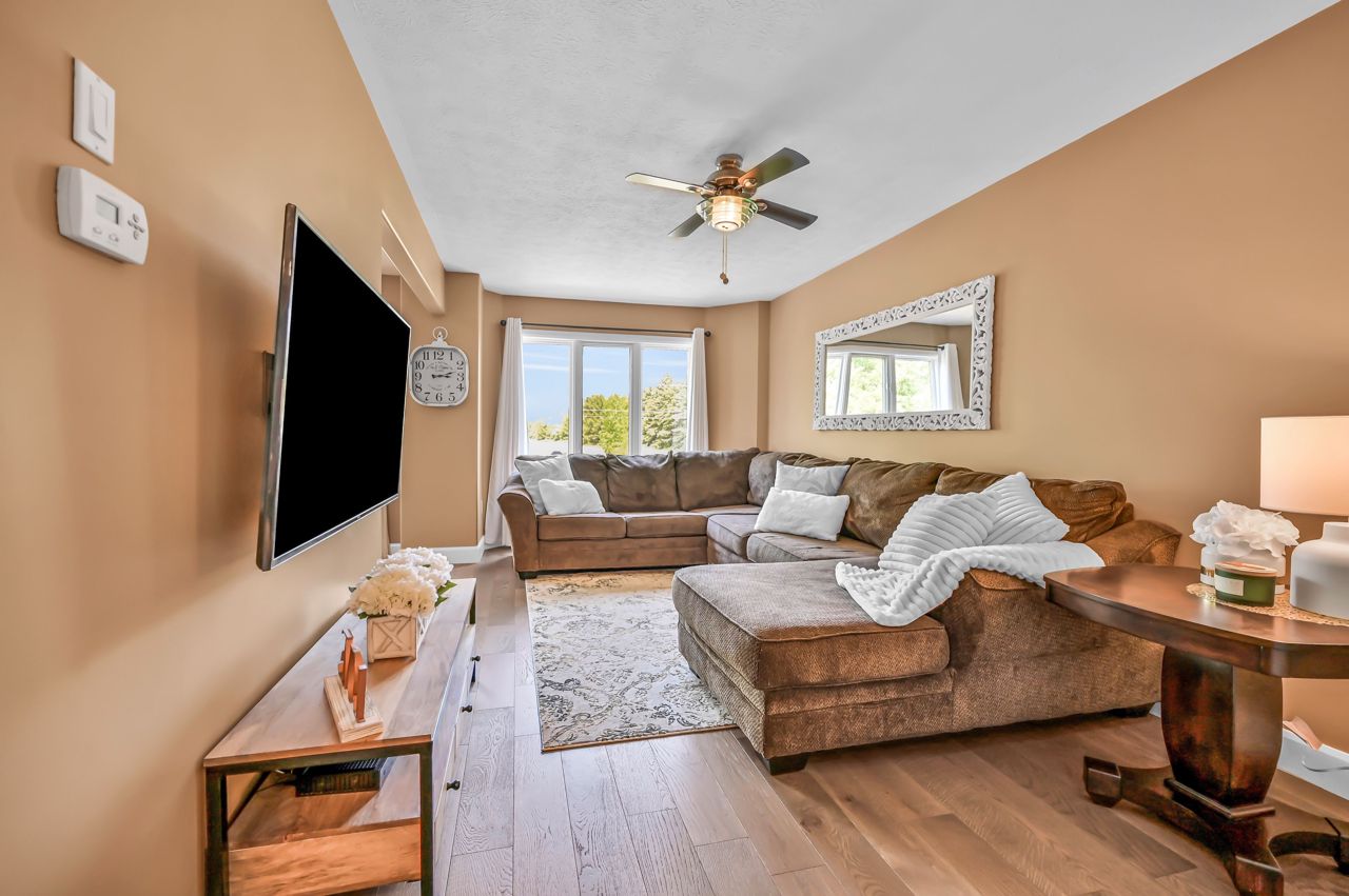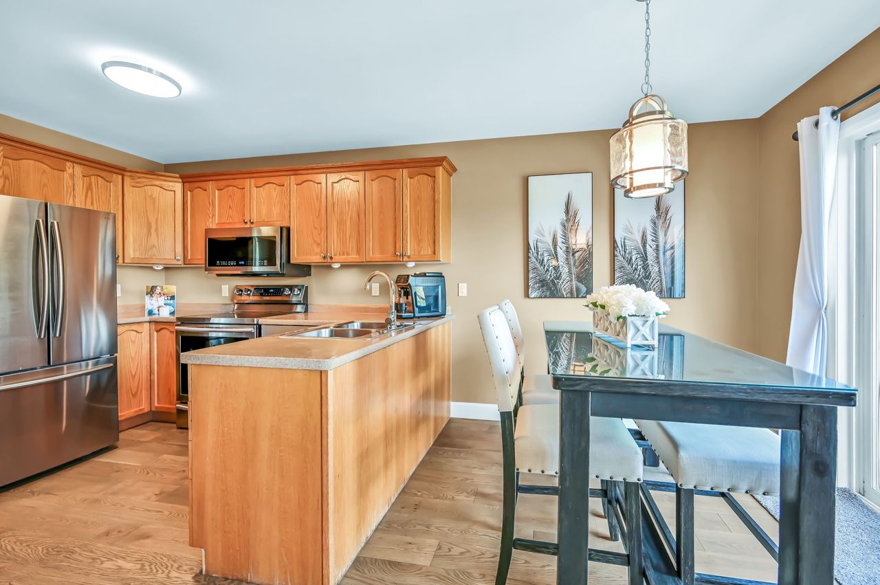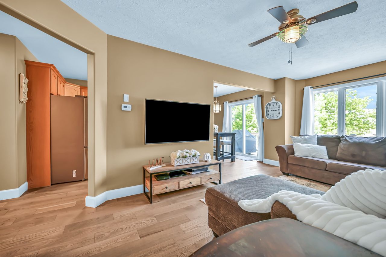 Brantwood Park neighborhood. 3 bedrooms 1.5 baths (+ rough-in). Upgrades include but are not limited to: roof (2014), front deck pillars added (2018), carpet (2019), sod, landscaping, fence installed (2020), upstairs bathrm, floors on the main level, basement, new light fixtures & appliances (2021). Bright and inviting eat-in kitchen, boasting plenty of counter space for all your culinary needs. Patio door leads to a deck & fully fenced yard, Situated on a lot measuring 33.87ft x 107.48ft, this property offers privacy and tranquility with no rear neighbors. The bedrooms in this home are spacious, and the primary bedroom features a convenient walk-in closet. The hallway is generously proportioned, adding to the overall sense of space and openness. The finished walkout basement presents additional living space and the potential for customization, with a rough-in for another bathroom already in place. The single-car garage